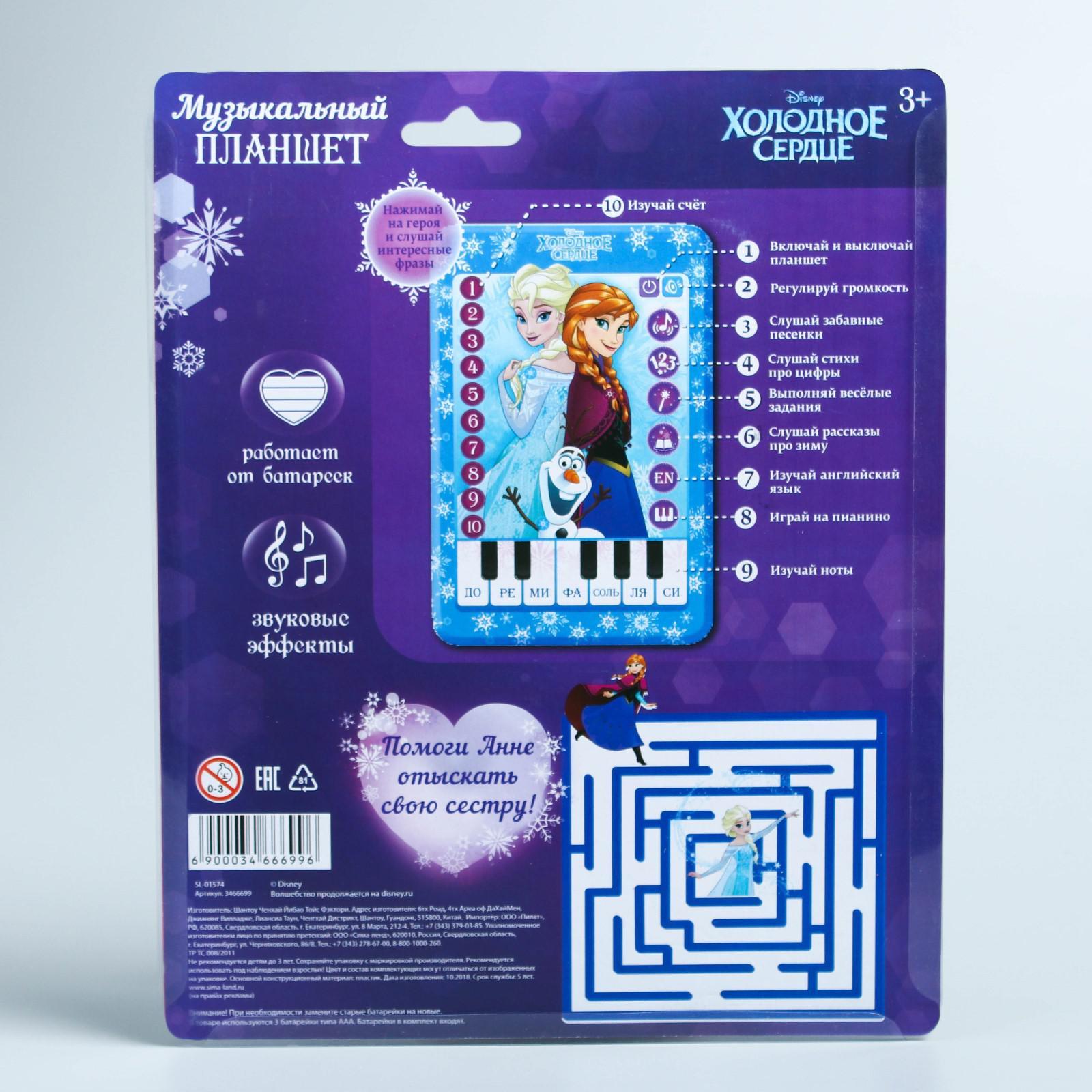 Планшет «холодное сердце», звук, батарейки, disney. Учимся с любимыми героями! Интерактивный планшет «Холодное сердце» — это увлекательное устройство для первых шагов в обучении. С ним ребёнок освоит, цифры, английские слова и ноты в игровой форме, а весёлые стихи и песенки сделают процесс интереснее. Особенности Планшет предлагает изучить ноты и английские слова: зима, снег, белый, холод, играть.Чёткое произношение помогает запоминать цифры, а инструментальные мелодии и стихи создают весёлую атмосферу. Громкость можно регулировать.Планшет комфортно ложится на стол или колени. Яркий дизайн с Анной и Эльзой привлекает внимание и вызывает интерес к обучению.Простые и понятные задания подходят для первых занятий. Планшет готов к работе — батарейки типа ААА в комплекте.Развиваемся вместе с Disney Интерактивный планшет «Холодное сердце» сочетает обучение и развлечение — ребёнок не заскучает за нотами и цифрами. Это отличный вариант для развития и полезного досуга. Подарите малышке радость первых открытий с любимыми персонажами! Для кого:Для девочки|Возраст:От 3 лет|Дополнительные функции:Звуковые эффекты|Дополнительные функции:Развивающая|Типоразмер батареек:AA (LR6)|Тема обучения:Цифры, счёт, математика|Тема обучения:Буквы, слова, русский язык|Тема обучения:Окружающий мир|Страна:Китай  развернуть описание ▼