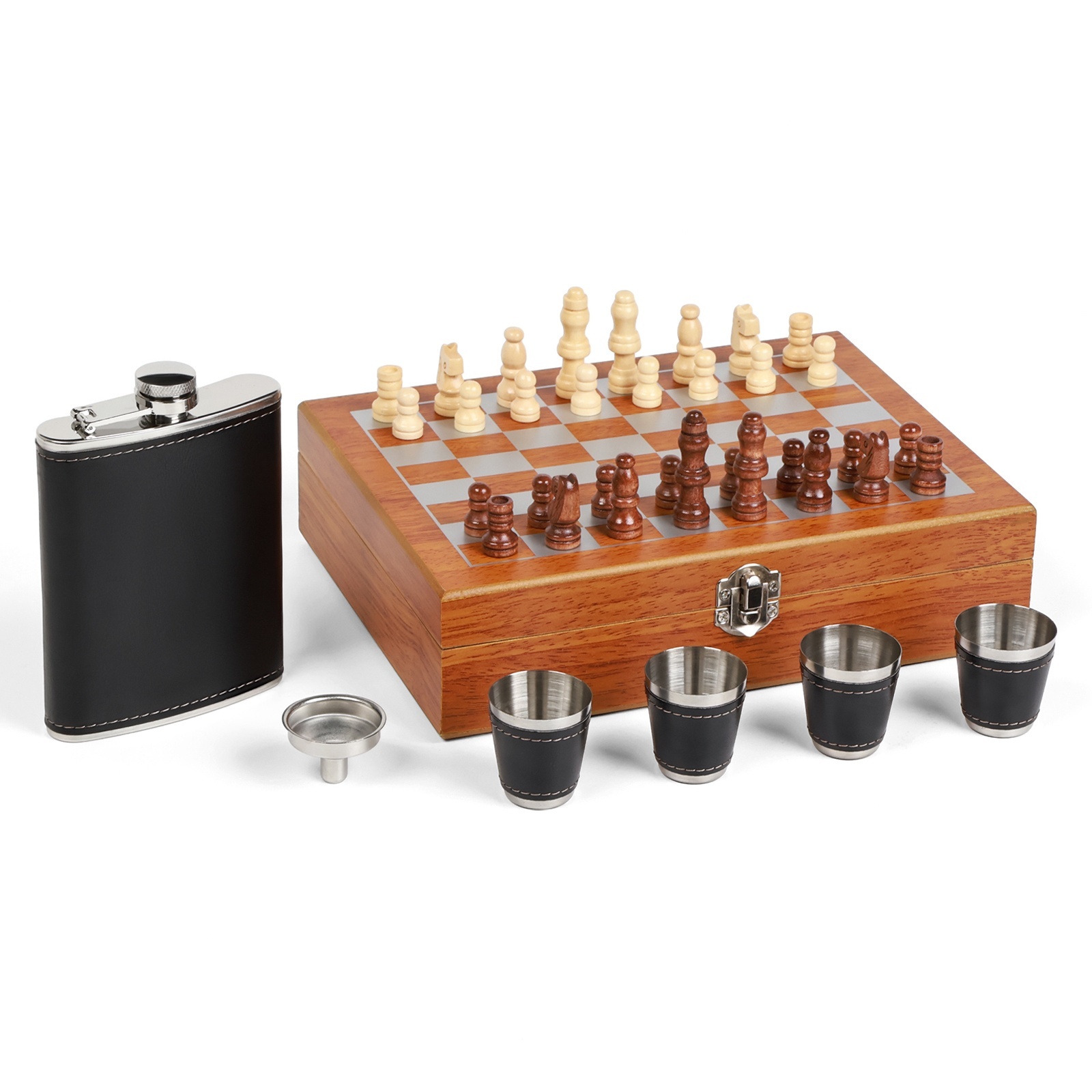 Набор подарочный «шахматы и фляжка» 7 в 1, металл и искусственная кожа. Особенности Фляга из нержавеющей стали, покрыта искусственной кожей, 13 10 см.Воронка из нержавеющей стали.4 рюмки из нержавеющей стали, 50 мл.Шахматы из дерева.Для кого:Унисекс|Размер, см:24 х 18|В наборе, шт.:7|Вид упаковки:Коробка картонная|Тематика праздника:Универсальная тематика|Тематика праздника:23 Февраля|Адресат:Без адресата|Материал:Металл|Материал:Искусственная кожа|Составляющие набора:Воронка|Составляющие набора:Рюмки (стопки)|Составляющие набора:Фляга|Составляющие набора:Шахматы|Вид:Шахматы (доска + фигуры)|Особенности:Подарочные|Возраст:Для взрослых|Страна:Китай  развернуть описание ▼