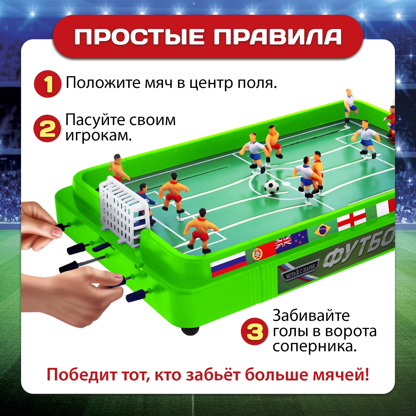 Настольный футбол «кубок чемпиона», объёмные игроки, 2 игрока, 3+. Футбол — любимая игра большинства малышей. Но для неё нужна специализированная площадка. С настольной игрой «Кубок чемпиона» вы насладитесь спортивным развлечением прямо у себя дома. Как играть В футбол играют два человека, у каждого своя команда.Управляйте вратарём, защитниками и нападающими и забивайте мяч в ворота соперника!Побеждает игрок, который забьёт больше мячей противнику.Особенности настольной игры Игровой модуль выполнен из качественных экологичных материалов, они гипоаллергенны и безопасны для детского здоровья.Яркие насыщенные цвета привлекают внимание.Размер игрового поля: 41,5 23,5 см.Настольная игра рекомендована для детей от 3 лет.Чем полезна настольная игра С настольным футболом «Кубок чемпиона» ребёнок прокачает координацию движений и скорость реакции, выработает спортивный азарт и волю к победе. Для кого:Для мальчика|Для кого:Унисекс|Возраст:От 3 лет|Количество игроков:2 игрока|Жанр игры:Спортивная|Вид игры:Футбол|Размер игрового поля, см:41.5 х 23.5|Страна:Китай  развернуть описание ▼