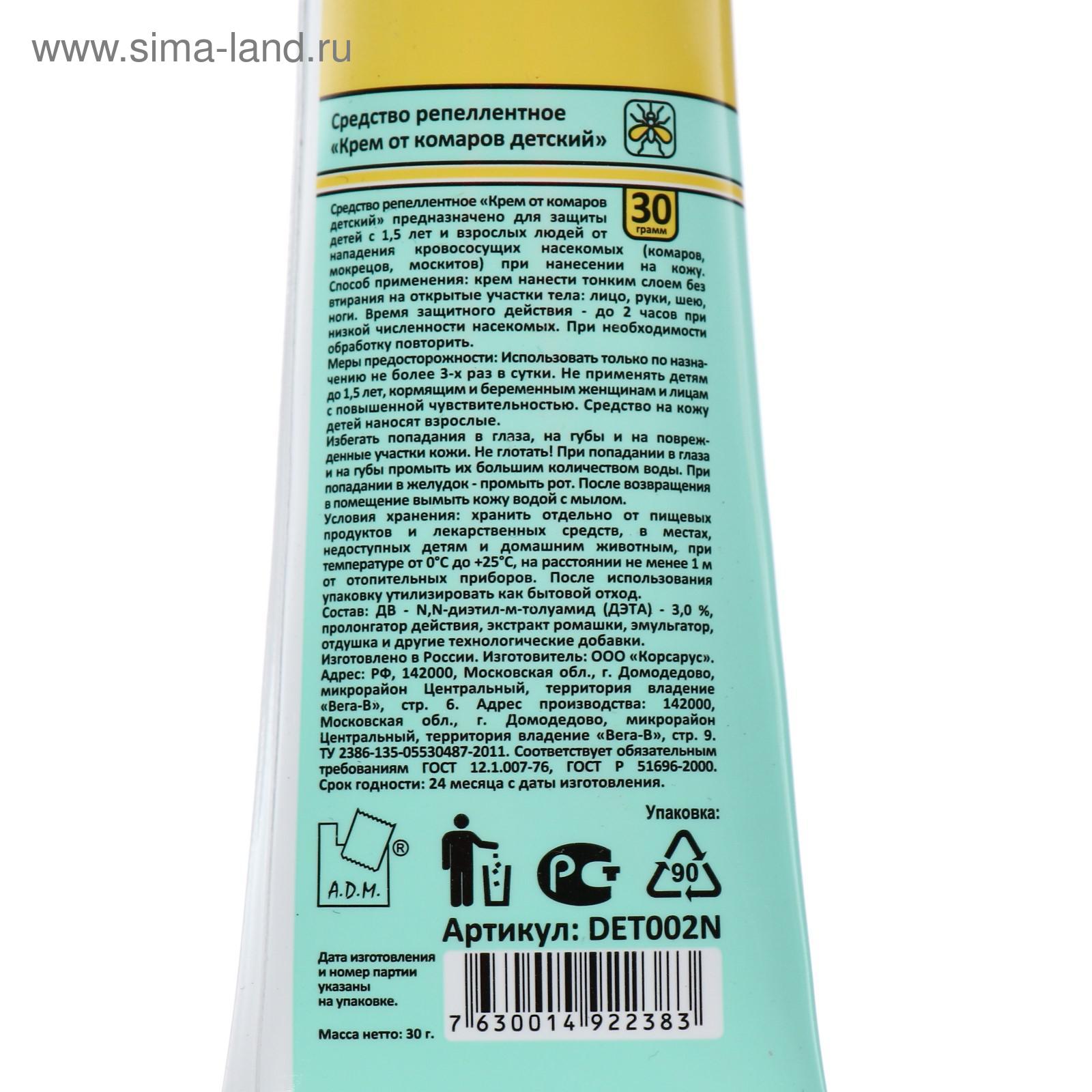 Крем от комаров "nadzor", детский, туба, 30 г. Средство репеллентное "Крем от комаров детский" предназначено для защиты детей с 1, 5 лет и взрослых от нападения кровососущих насекомых (комаров, мокрецов, москитов) при нанесении на кожу. Рецептура с экстрактом ромашки обладает противовоспалительным действием, смягчает и успокаивает кожу. Способ применения: крем нанести тонким слоем без втирания на открытые участки тела: лицо, руки, шею, ноги. Время защитного действия - до 2 часов при низкой численности насекомых. При необходимости обработку повторить. Меры предосторожности: использовать только по назначению не более 3-х раз в сутки. Не применять детям до 1, 5 лет, кормящим, беременным женщинам и лицам с повышенной чуствительностью. Средство на кожу детей наносят взрослые. Состав: ДВ- N, N-диэтил-м-толуамид (ДЭТА) - 3, 0%, пролонгатор действия, экстракт ромашки, эмульгатор, отдушка и другие технологические добавки. Вид средства: Крем Назначение: От комаров Тип средства: Репеллент  развернуть описание ▼