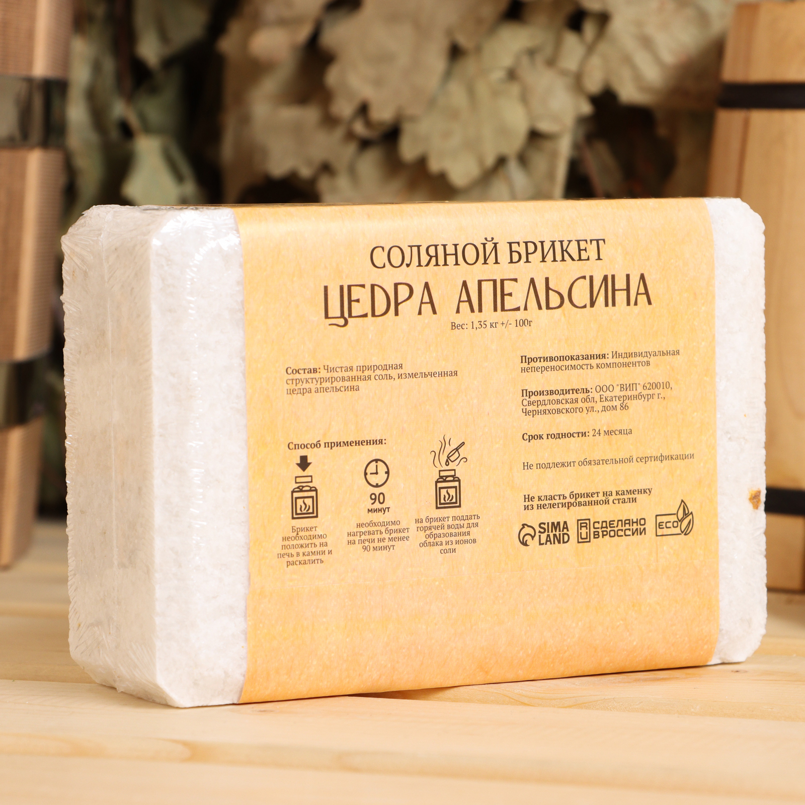 Соляной брикет цедра апельсина, 1,35 кг добропаровъ. Соль для бани сделает поход в парную ещё полезнее для здоровья. Средство подходит для людей всех возрастов, используется для лечения и профилактики множества болезней. Раскаляясь вместе с камнями, кристаллы аккумулируют тепло. Испаряясь, соль благоприятно воздействует на дыхательные пути, повышает иммунитет. Контактируя с воздухом, кристаллы соли насыщают его отрицательными ионами и оказывают бактерицидный эффект. Соль благоприятно воздействует на весь организм человека: повышает иммунитет, улучшает состояние кожных покровов, приводит в тонус мышцы и успокаивает нервную систему. Её минералы оказывают омолаживающий эффект. Применение: нагревайте брикет на печи не менее 90 минут, затем поддайте на него горячей воды. Соль наполнит воздух бани ионами, тем самым поможет снять усталость, улучшить кровообращение и общее самочувствие. Вес, г:1350|Аромат:Апельсин|Вид:Природная структурированная соль|Ароматизированная:Нет|Страна:Россия  развернуть описание ▼