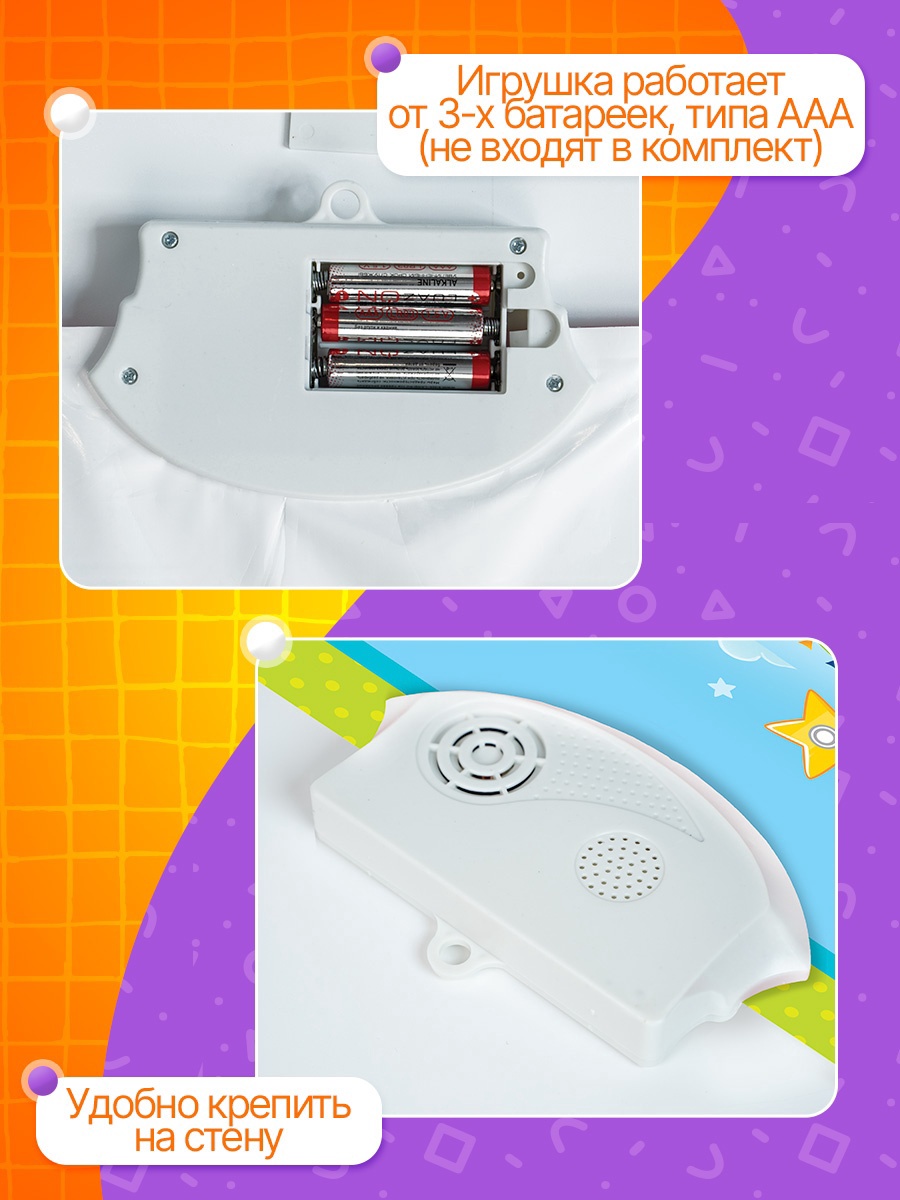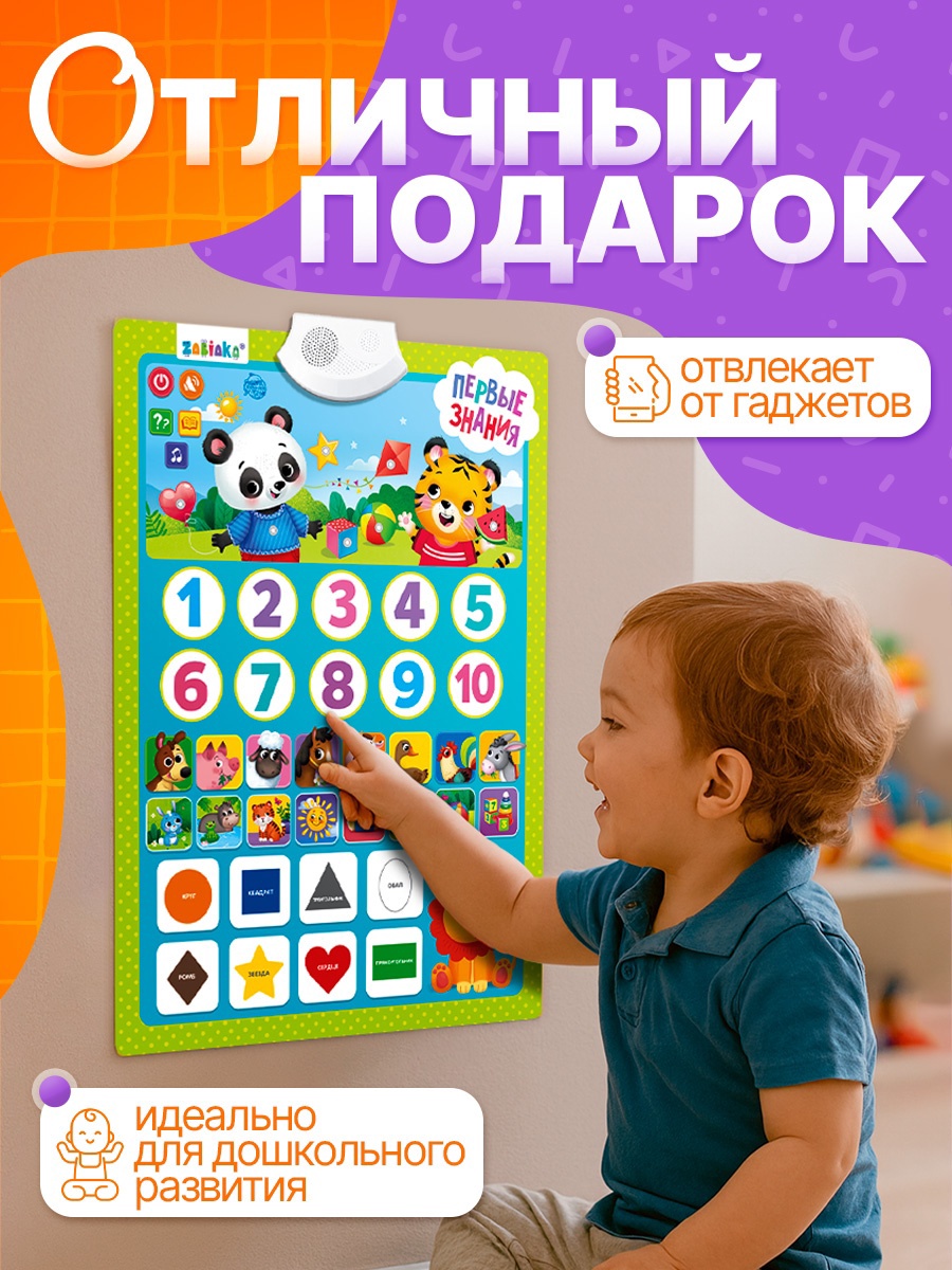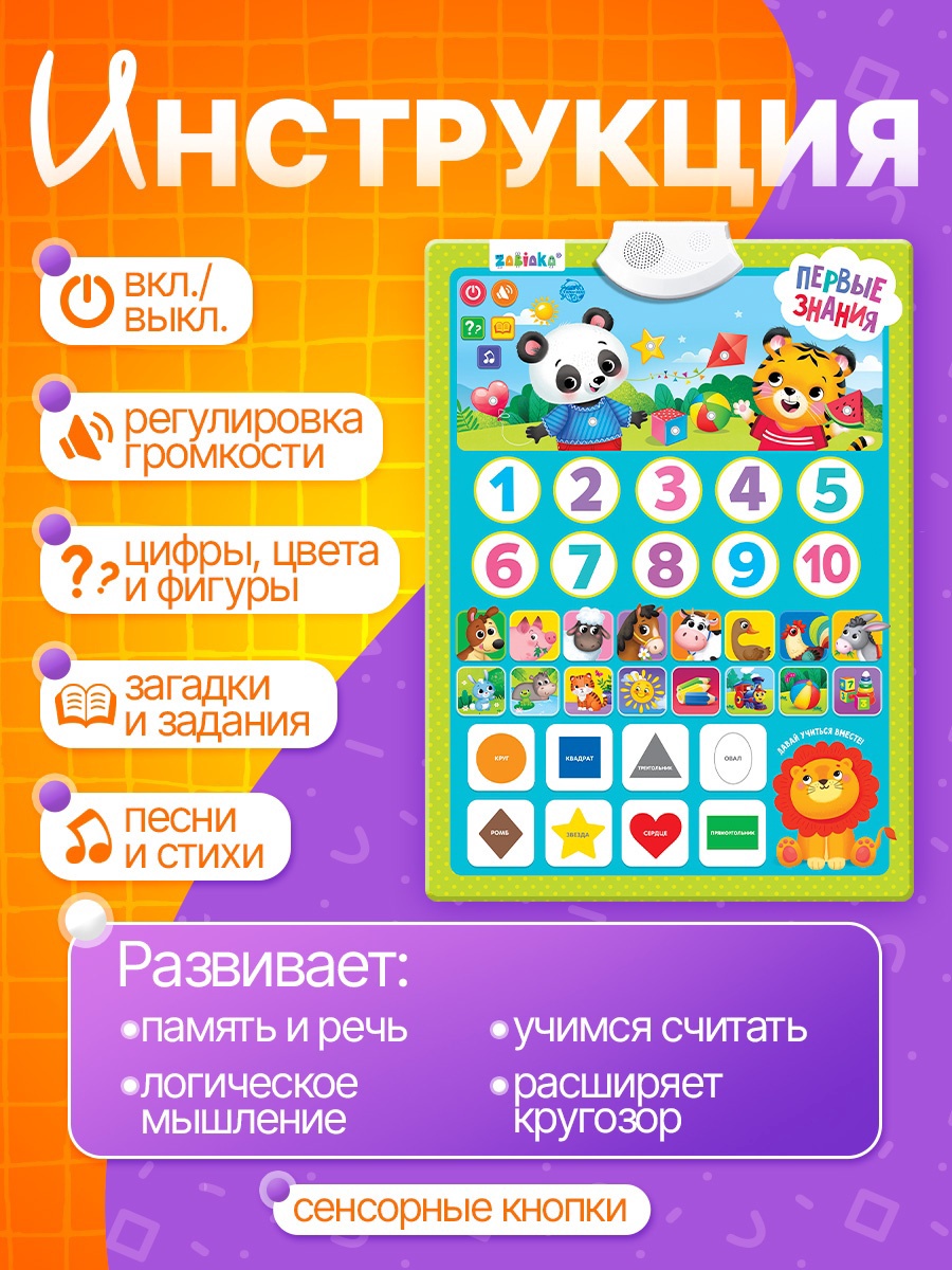 Обучающий плакат «первые знания», со звуком, работает от батареек. Интерактивный плакат «Первые знания» — это звуковой тренажёр для малышей от 3 лет. Яркий и простой в управлении, он знакомит с цифрами, формами, цветами и звуками животных через игры и весёлые задания. Особенности Цифры и счёт, геометрические фигуры, цвета, звуки зверей и музыка. Ребёнок учится, нажимая на сенсорные кнопки.16 загадок, 8 стихов и песен, 8 звуков животных. Малыш тренирует слух, память и логику.Плакат работает от 3 батареек ААА (в комплект не входят). Можно вешать на стену или раскладывать на столе.Плакат подходит мальчикам и девочкам для подготовки к детскому саду. С ним ребёнок выучит основы без планшета и телефона — просто, безопасно и с пользой. Тип питания:От батареек|Для кого:Унисекс|Возраст:От 3 лет|Количество батареек:3|Материал:Пластик|Звук:Да|Работает от батареек:Да|Дополнительные функции:Сенсорное управление|Дополнительные функции:Развивающая|Дополнительные функции:Звуковые эффекты|Типоразмер батареек:AAA (LR03)|Тема обучения:Цвета, формы, звуки|Тема обучения:Развитие логики/мышления|Тема обучения:Окружающий мир|Тема обучения:Цифры, счёт, математика|Тема обучения:Музыка|Батарейки в комплекте:Нет|Страна:Китай  развернуть описание ▼