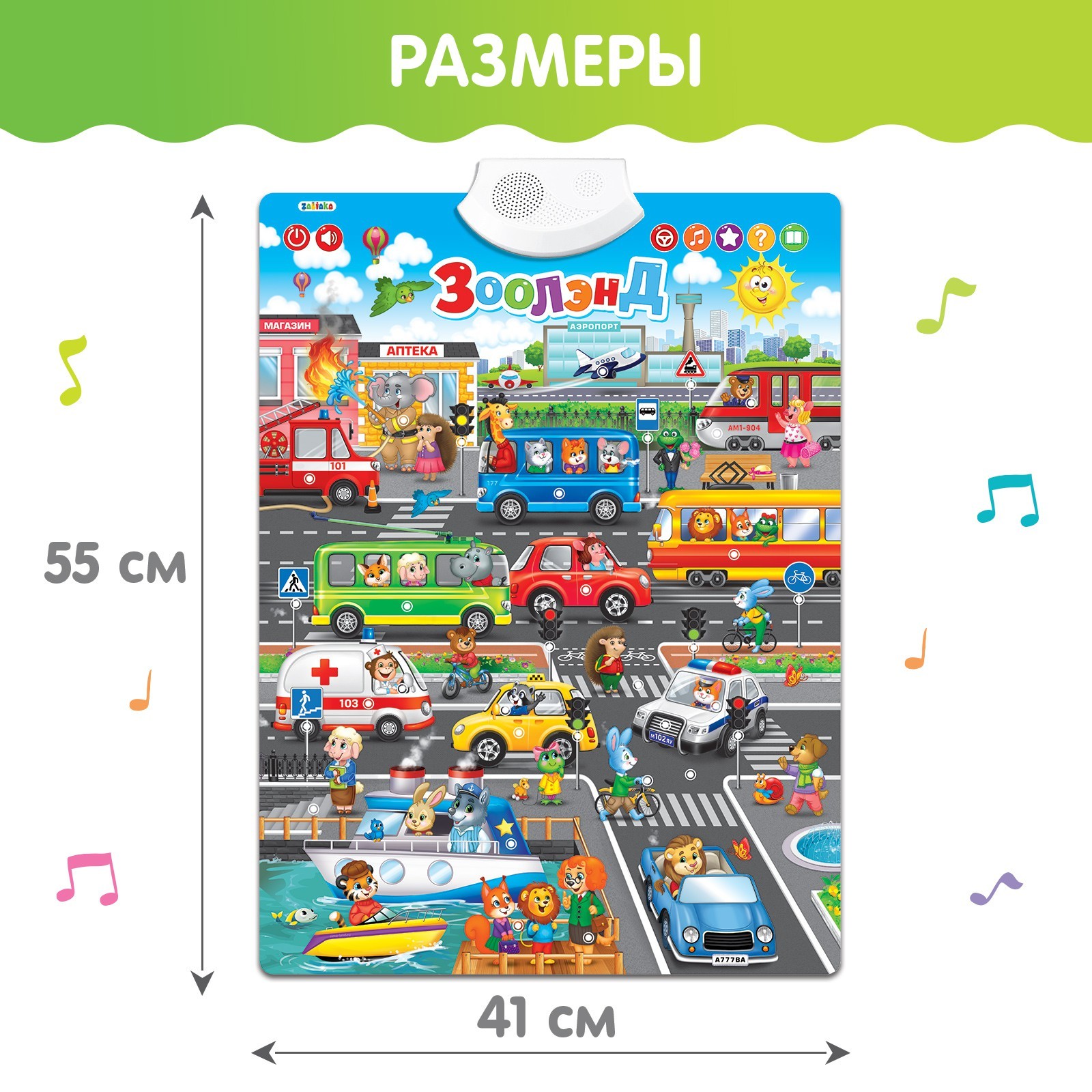 Говорящий электронный плакат «зоолэнд», работает от батареек. Обучающий плакат «Зоолэнд» — это увлекательный способ познакомить ребёнка с окружающим миром, основами безопасности и музыкой. Яркий звуковой плакат работает от батареек и предлагает множество игровых режимов для детей от 3 лет. Особенности 11 видов транспорта, 16 стихов и 7 песен. Плакат помогает запомнить названия транспорта, ребёнок послушает весёлые стихи, разучит песенки и проверит знания в викторине.Малыш узнает о профессиях и отгадает загадки. Звуковые эффекты делают процесс живым и интересным.Пластиковый плакат с чётким звуком легко разместить на стене или столе. Для работы нужны 3 батарейки ААА (в комплект не входят).Плотный материал выдерживает активное использование, а крупные кнопки удобны для маленьких пальчиков.Обучающий плакат «Зоолэнд» подойдёт для мальчиков, которые обожают транспорт, и всех детей, готовых к новым знаниям. Подарите ребёнку полезный и весёлый способ изучать мир. Тип питания:От батареек|Для кого:Для мальчика|Возраст:От 3 лет|Количество батареек:3|Материал:Пластик|Звук:Да|Работает от батареек:Да|Дополнительные функции:Звуковые эффекты|Типоразмер батареек:AAA (LR03)|Тема обучения:Основы безопасности|Тема обучения:Музыка|Тема обучения:Окружающий мир|Батарейки в комплекте:Нет|Страна:Китай  развернуть описание ▼