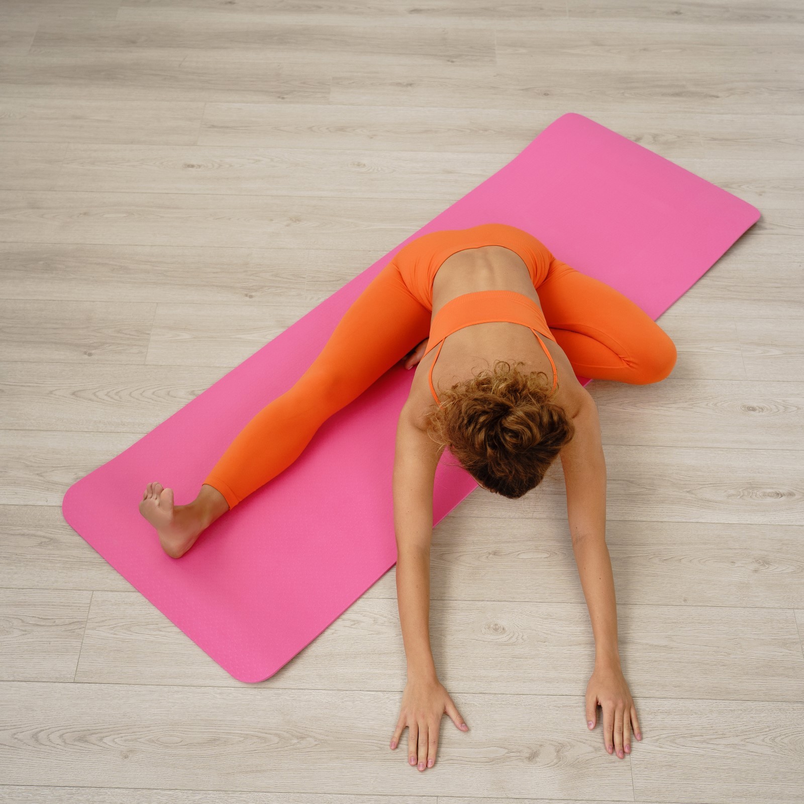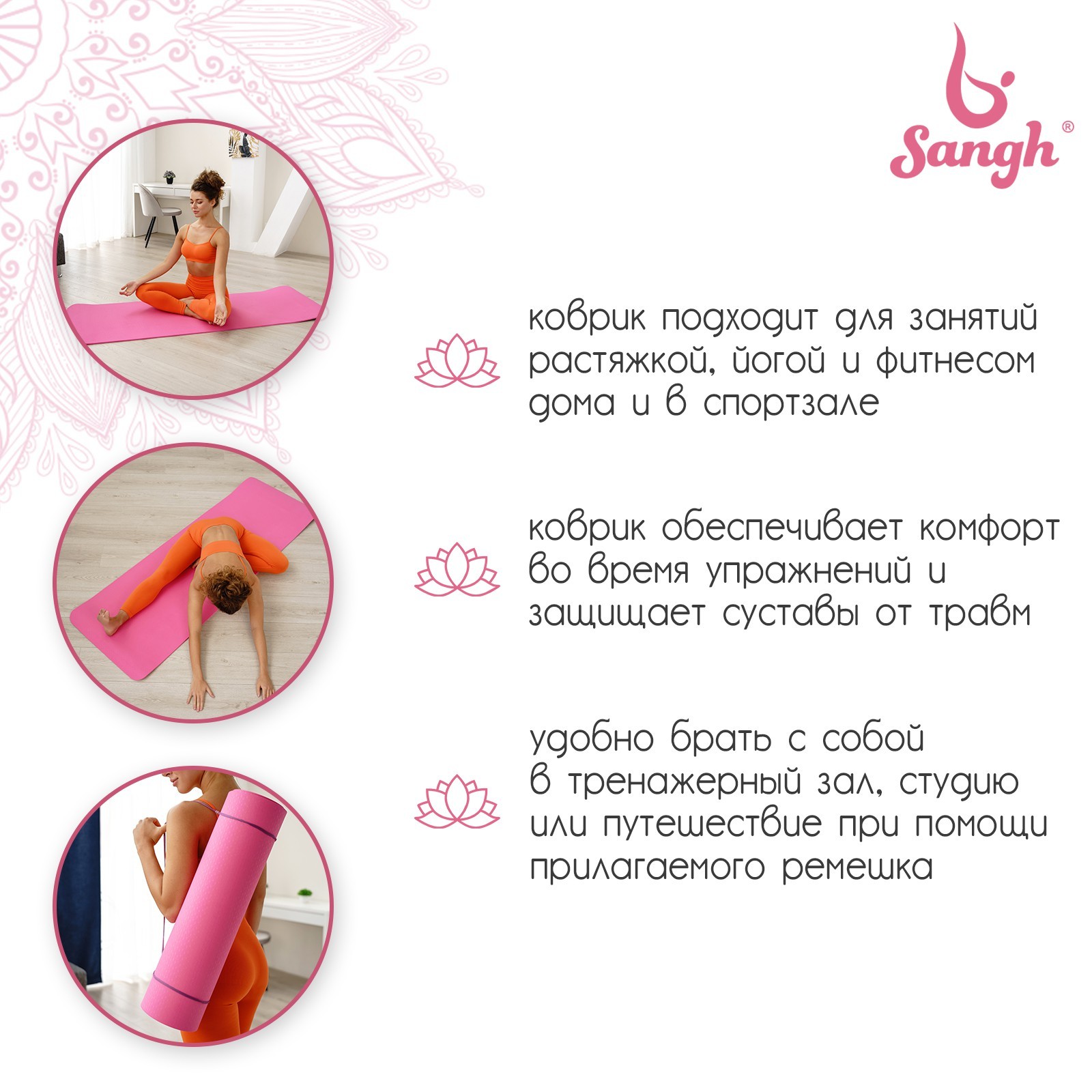 Коврик для йоги sangh, 183x61x0,8 см, цвет розовый. Коврик подходит для занятий йогой и фитнесом дома и в спортивных залах. Помогает в выполнении асан или других упражнений. Смягчает упор тела на твёрдую поверхность. Сохраняет форму после выполнения упражнений. Особенность коврика из термопластичного эластомера состоит в том, что он обладает антискользящими свойствами, сохраняет форму, имеет плотную и упругую структуру. Коврик из термопластичного эластомера эластичный и мягкий, приятный на ощупь, не выгорает на солнце и устойчив к распространению бактерий. Но его нужно беречь от обильной влаги, чтобы не допустить скольжение на гладкой поверхности. Цвет: Розовый Длина, см: 183 Ширина, см: 61 Толщина, мм: 8 Возраст: Взрослый Материал: TPE Особенности: Водоотталкивающий Особенности: Эластичный Вид: Классический  развернуть описание ▼