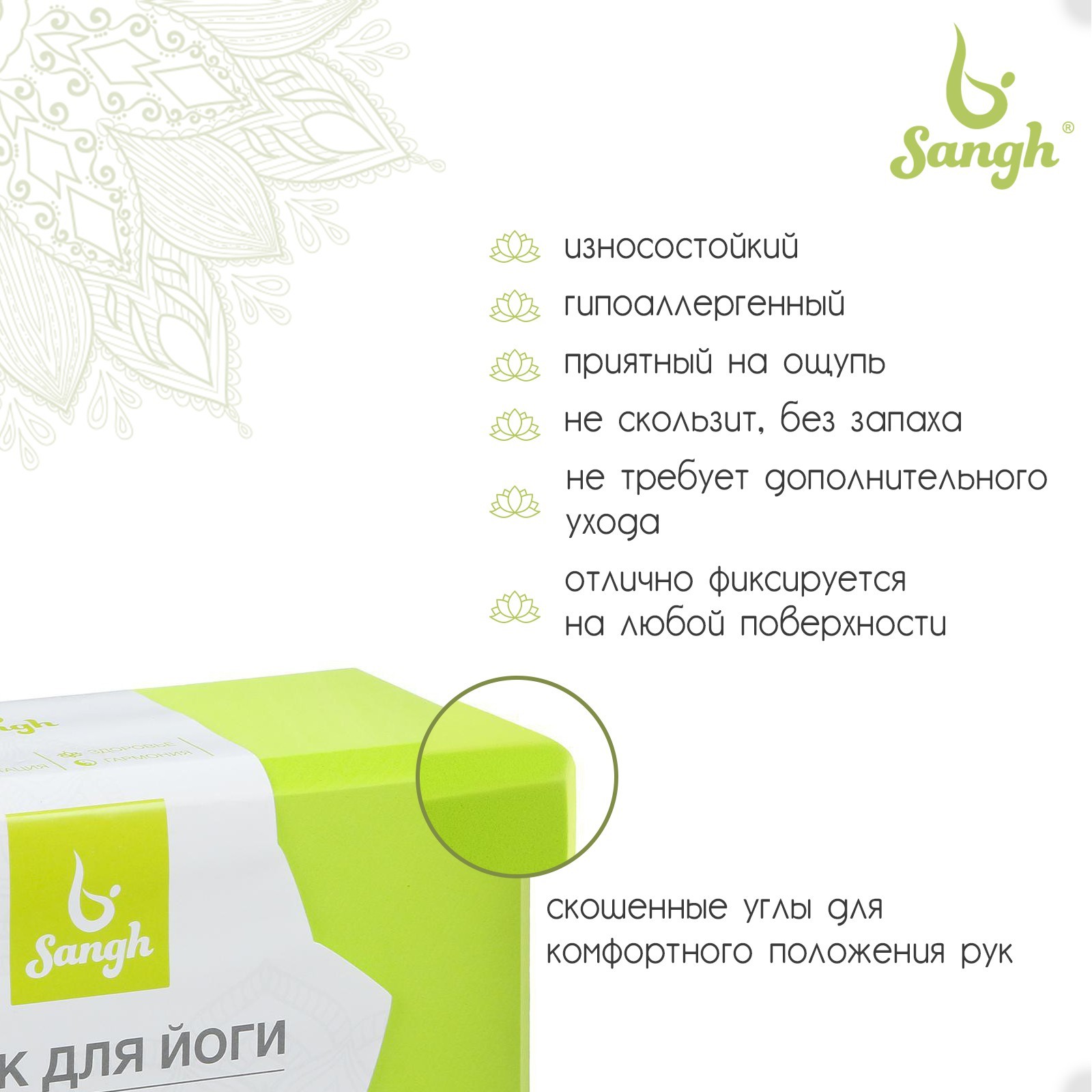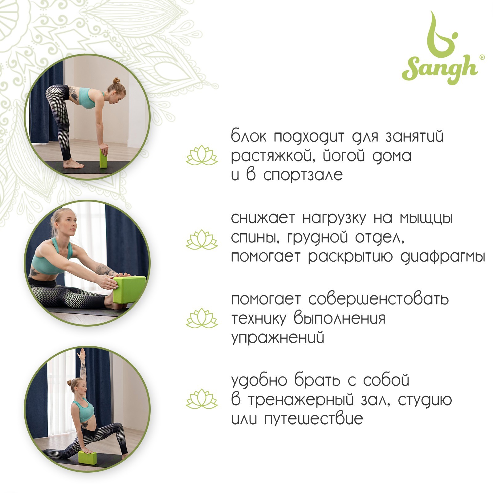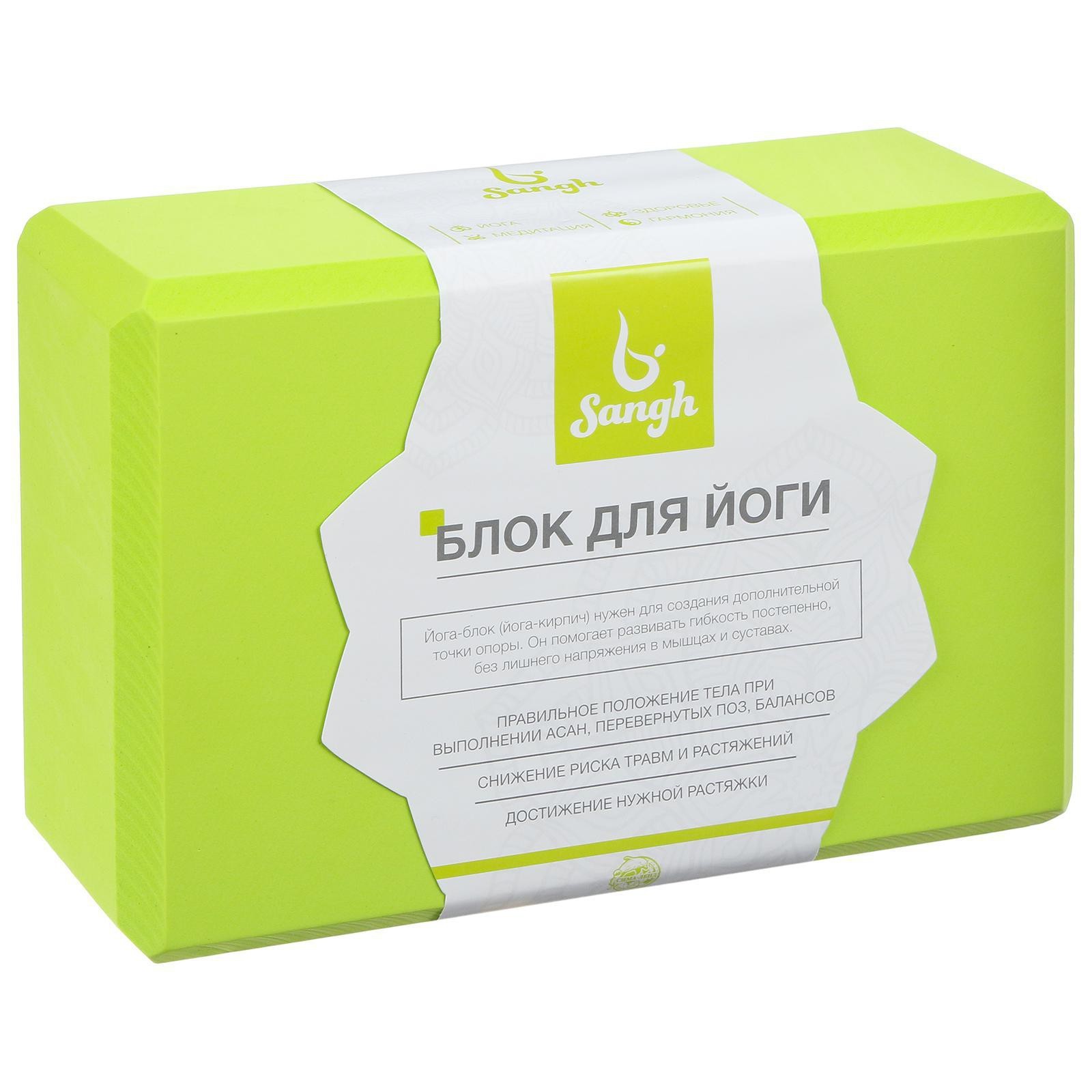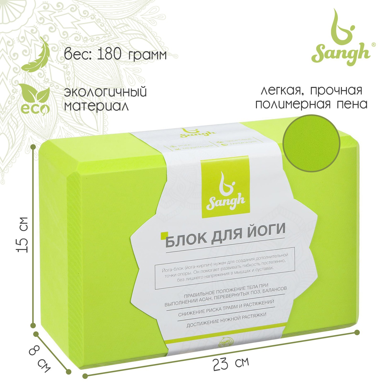 Блок для йоги sangh, 23х15х8 см, цвет зелёный. Йога-блок (йога-кирпич) нужен для создания дополнительной точки опоры. Он помогает развивать гибкость постепенно, без лишнего напряжения в мышцах и суставах. Необходим для тех, кто только начинает заниматься йогой, и кому не достает гибкости, чтобы иметь правильную опору для рук и ног при выполнении асан. Данная модель выполнена из материала высокой плотности, что препятствует крошению и делает блок легким, но устойчивым. Блок приятен на ощупь, имеет скругленные края и нескользящую поверхность для комфортных и безопасных занятий. Цвета блока подобраны так, чтобы вдохновлять вас на новые достижения в практике. Цвет: Зелёный Вид: Блоки для йоги  развернуть описание ▼