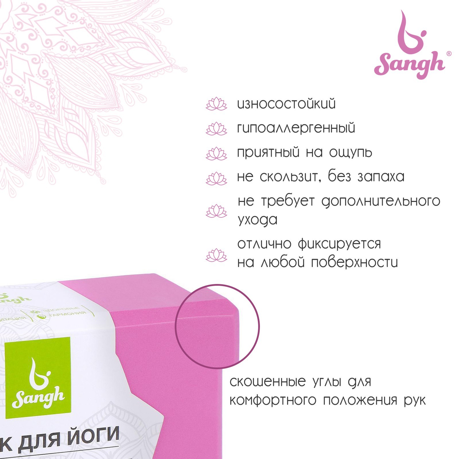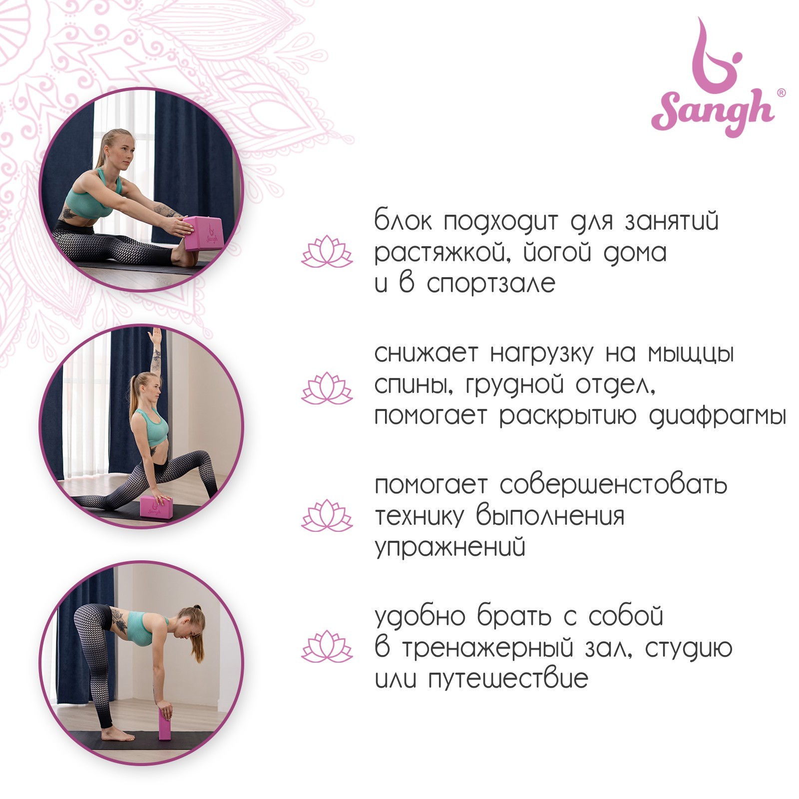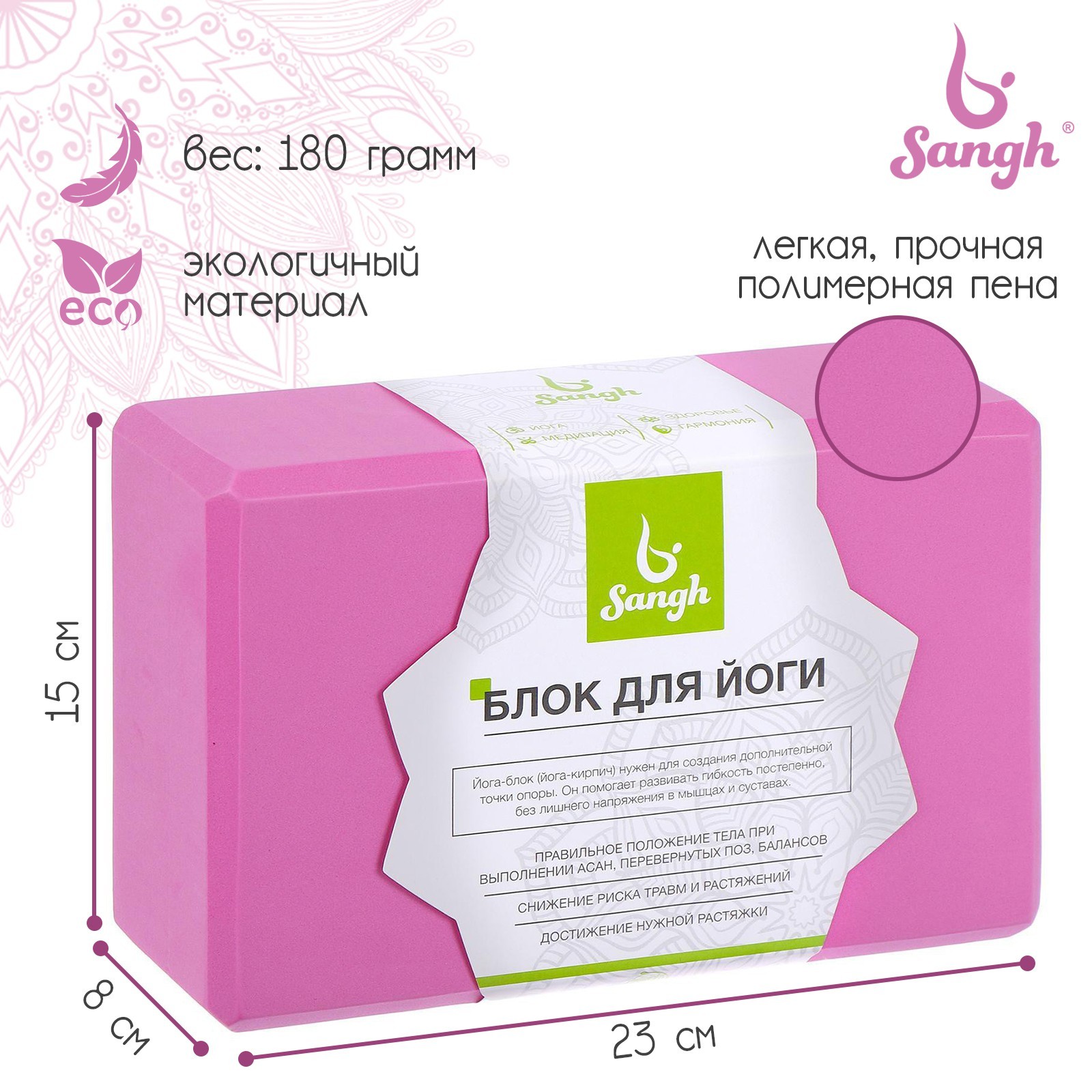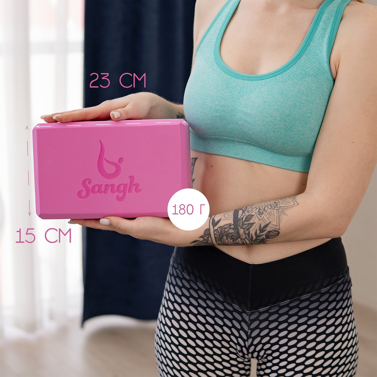 Блок для йоги sangh, 23х15х8 см, цвет розовый. Йога-блок (йога-кирпич) нужен для создания дополнительной точки опоры. Он помогает развивать гибкость постепенно, без лишнего напряжения в мышцах и суставах. Необходим для тех, кто только начинает заниматься йогой, и кому не достает гибкости, чтобы иметь правильную опору для рук и ног при выполнении асан. Данная модель выполнена из материала высокой плотности, что препятствует крошению и делает блок легким, но устойчивым. Блок приятен на ощупь, имеет скругленные края и нескользящую поверхность для комфортных и безопасных занятий. Цвета блока подобраны так, чтобы вдохновлять вас на новые достижения в практике. Цвет: Розовый Вид: Блоки для йоги  развернуть описание ▼