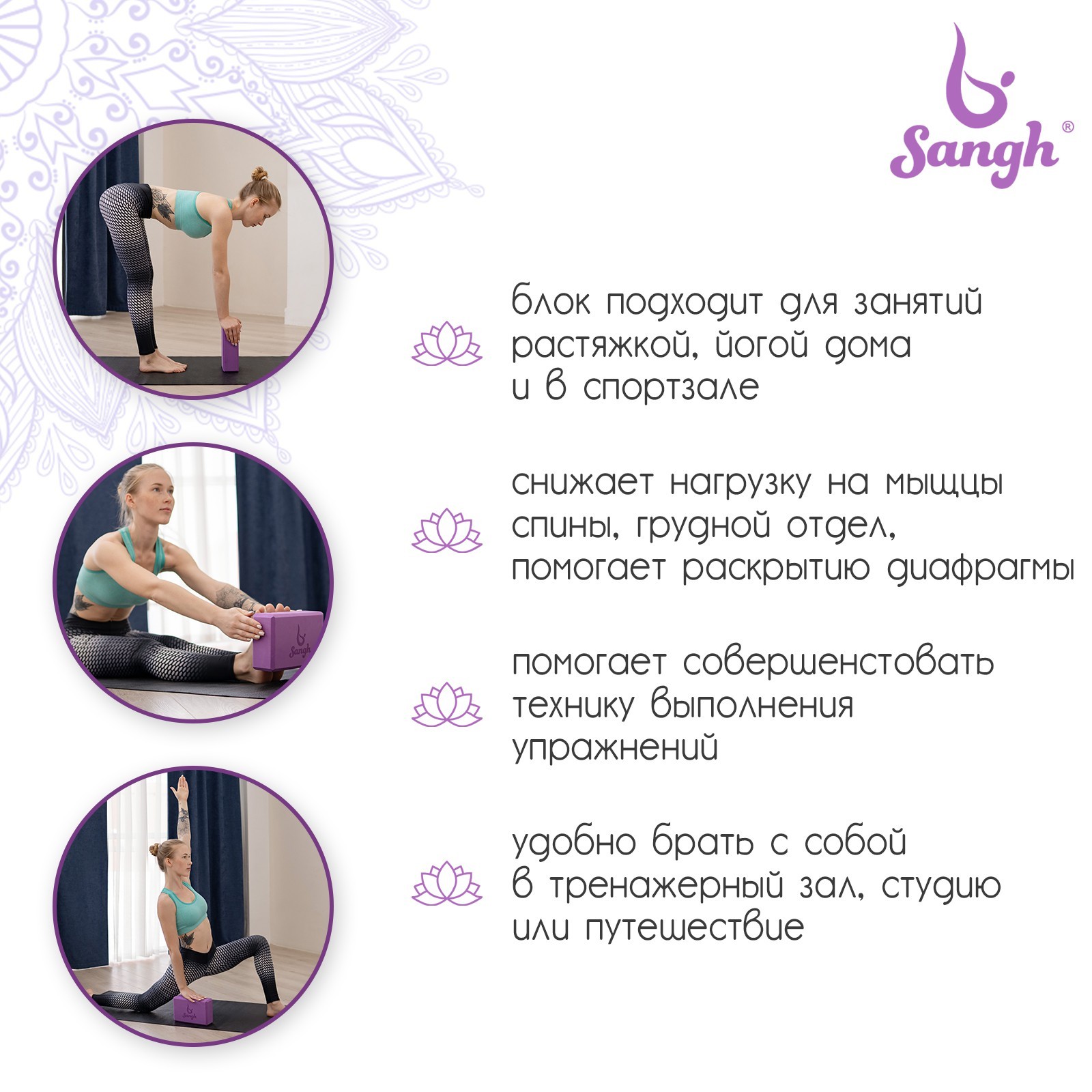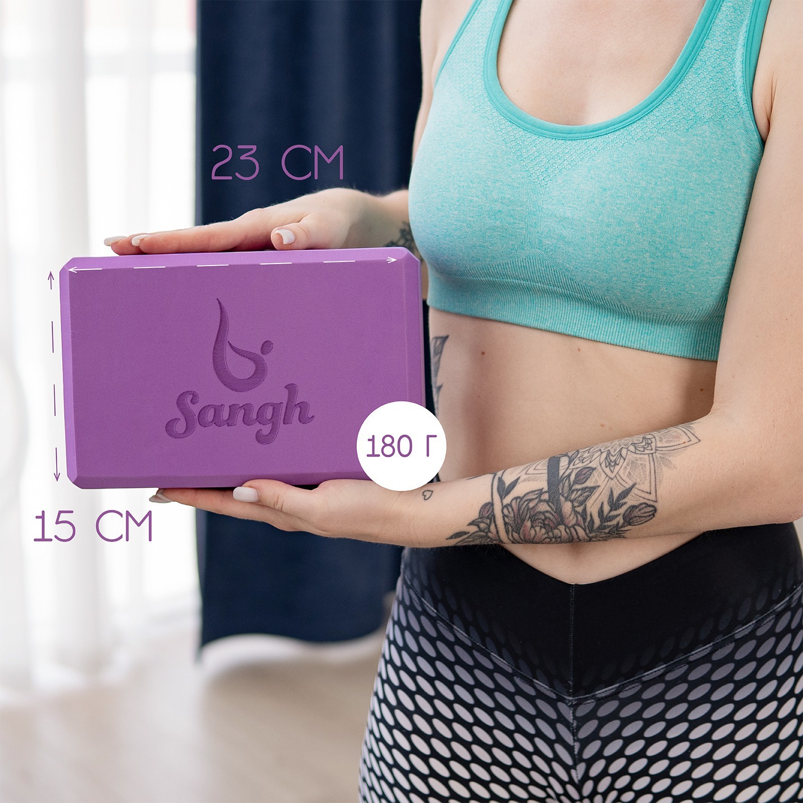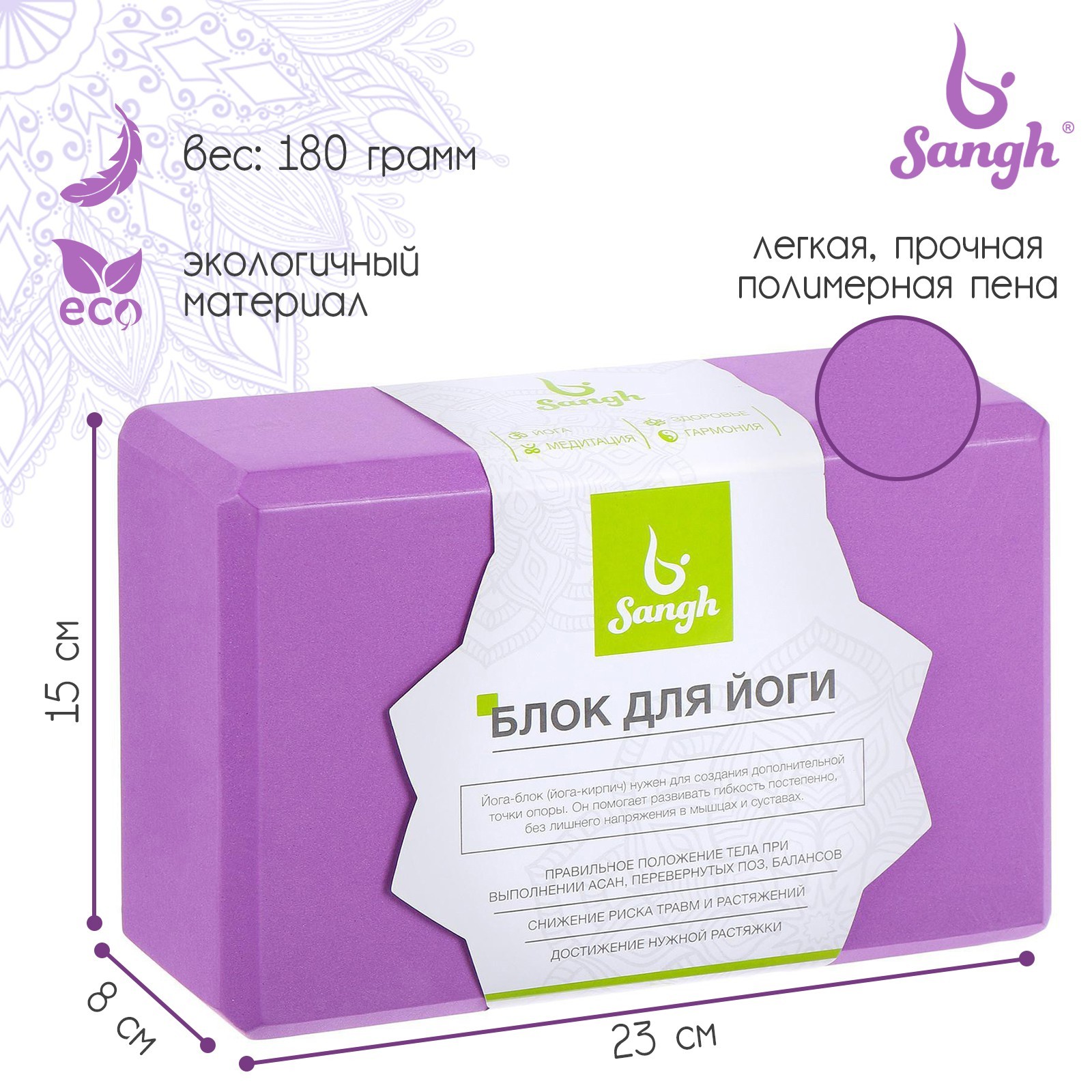 Блок для йоги sangh, 23х15х8 см, цвет фиолетовый.   Йога-блок (йога-кирпич) нужен для создания дополнительной точки опоры. Он помогает развивать гибкость постепенно, без лишнего напряжения в мышцах и суставах. Необходим для тех, кто только начинает заниматься йогой, и кому не достает гибкости, чтобы иметь правильную опору для рук и ног при выполнении асан.  Данная модель выполнена из материала высокой плотности, что препятствует крошению и делает блок легким, но устойчивым. Блок приятен на ощупь, имеет скругленные края и нескользящую поверхность для комфортных и безопасных занятий. Цвета блока подобраны так, чтобы вдохновлять вас на новые достижения в практике.  Цвет: Фиолетовый Вид: Блоки для йоги  развернуть описание ▼