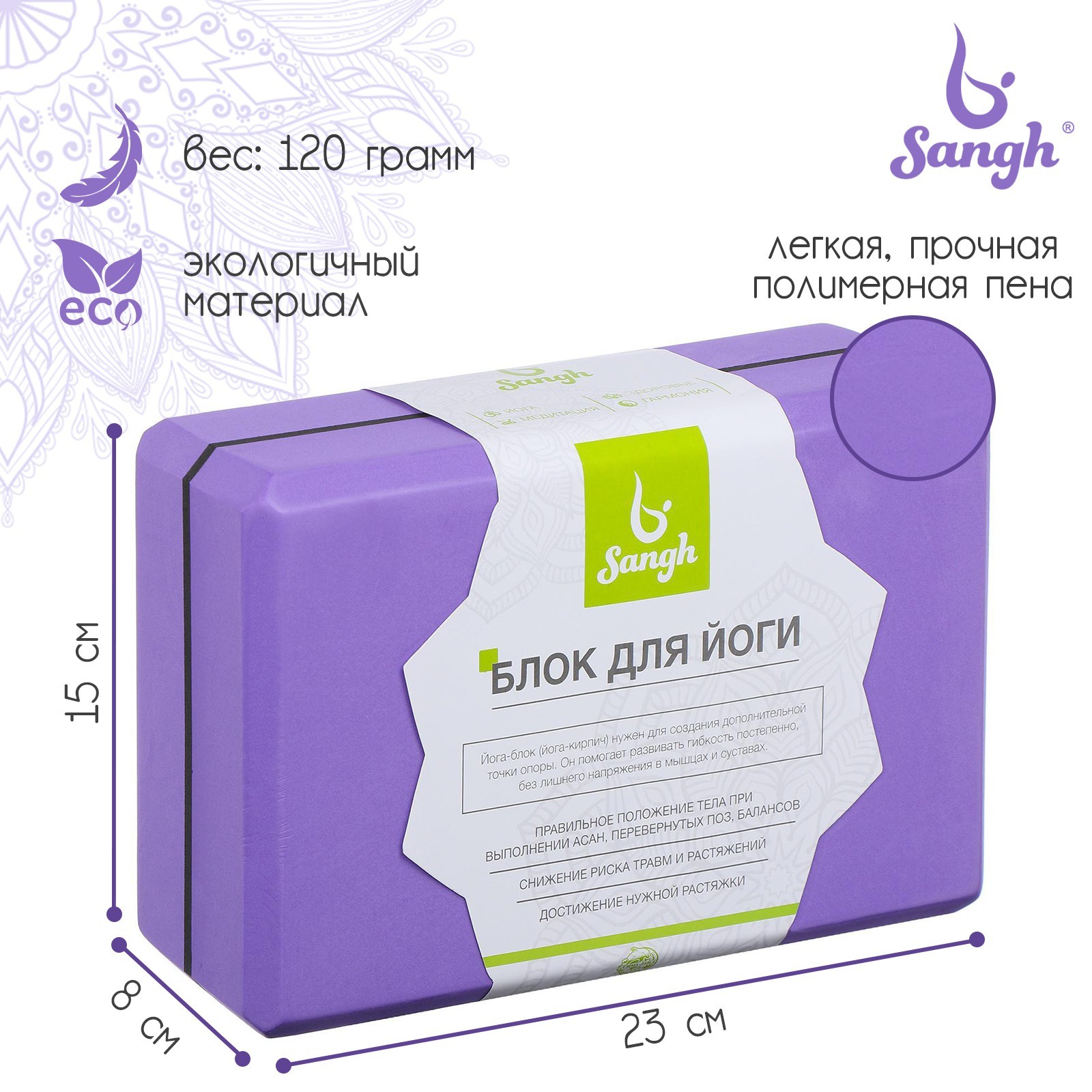 Блок для йоги sangh, 23х15х8 см, цвет фиолетовый. Йога-блок (йога-кирпич) нужен для создания дополнительной точки опоры. Он помогает развивать гибкость постепенно, без лишнего напряжения в мышцах и суставах. Необходим для тех, кто только начинает заниматься йогой, и кому не достает гибкости, чтобы иметь правильную опору для рук и ног при выполнении асан. Данная модель выполнена из материала высокой плотности, что препятствует крошению и делает блок легким, но устойчивым. Блок приятен на ощупь, имеет скругленные края и нескользящую поверхность для комфортных и безопасных занятий. Цвета блока подобраны так, чтобы вдохновлять вас на новые достижения в практике. Цвет: Фиолетовый Вид: Блоки для йоги  развернуть описание ▼