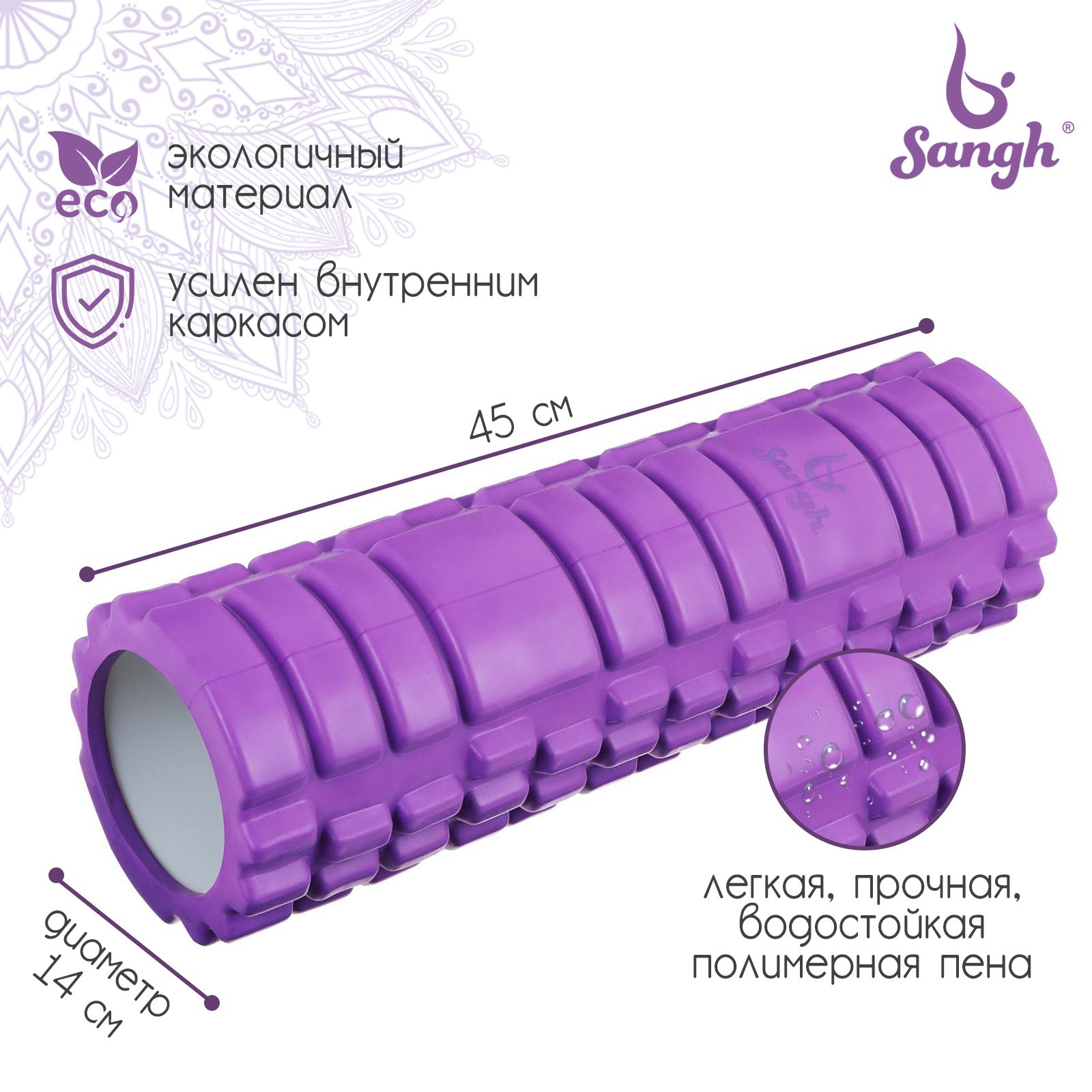 Ролик массажный sangh, 45х14 см, цвет фиолетовый. Роллер для йоги — спортивный инвентарь, который помогает настроить мышцы на работу перед тренировкой, удерживать правильное положение тела во время неё и ослабить боль в мышцах и суставах после. Параллельно способствует восстановлению всего организма. Ролик позволяет практиковать миофасциальное расслабление (МФР). Использование изделия становится доступной альтернативой массажной терапии. Цвет: Фиолетовый Вид: Ролики  развернуть описание ▼