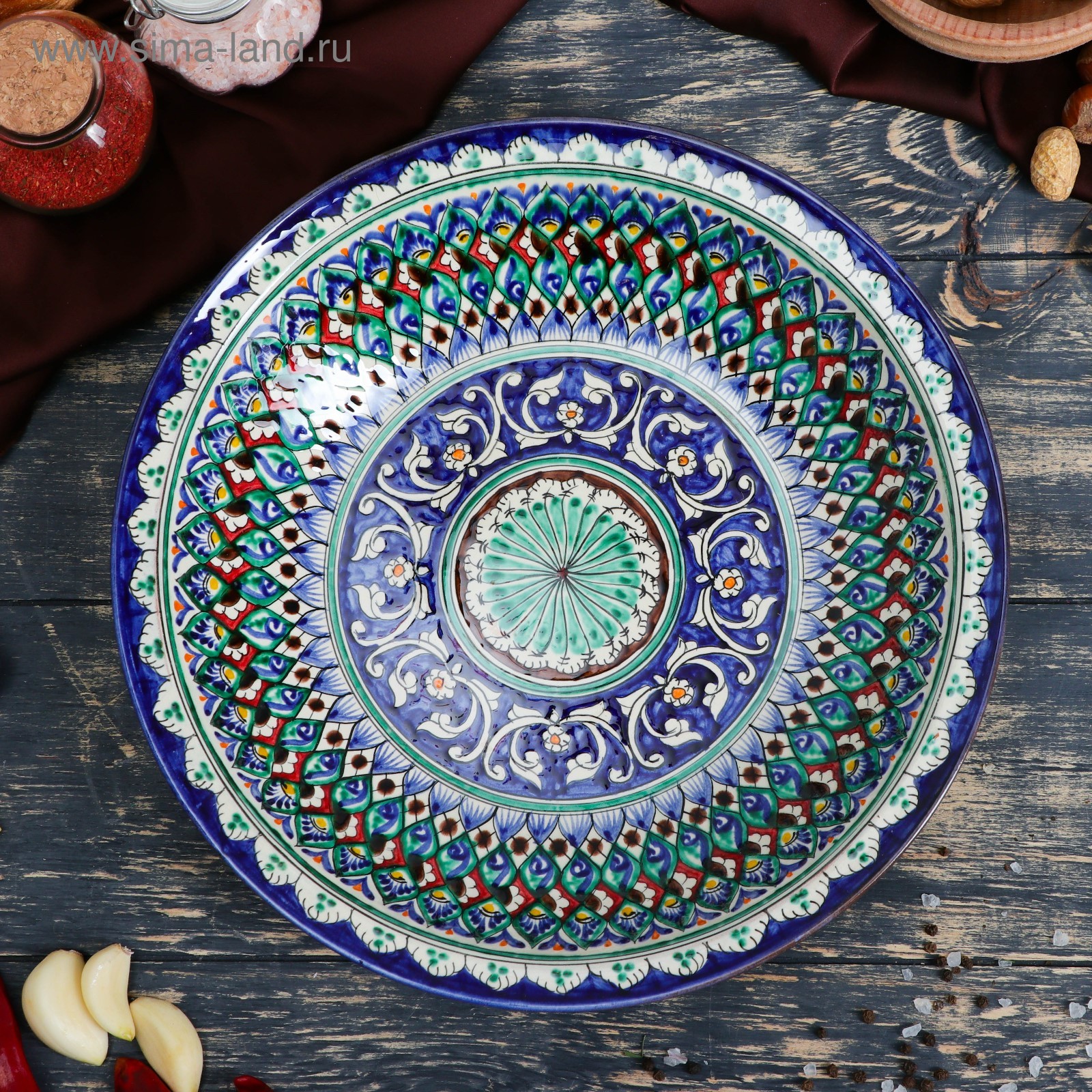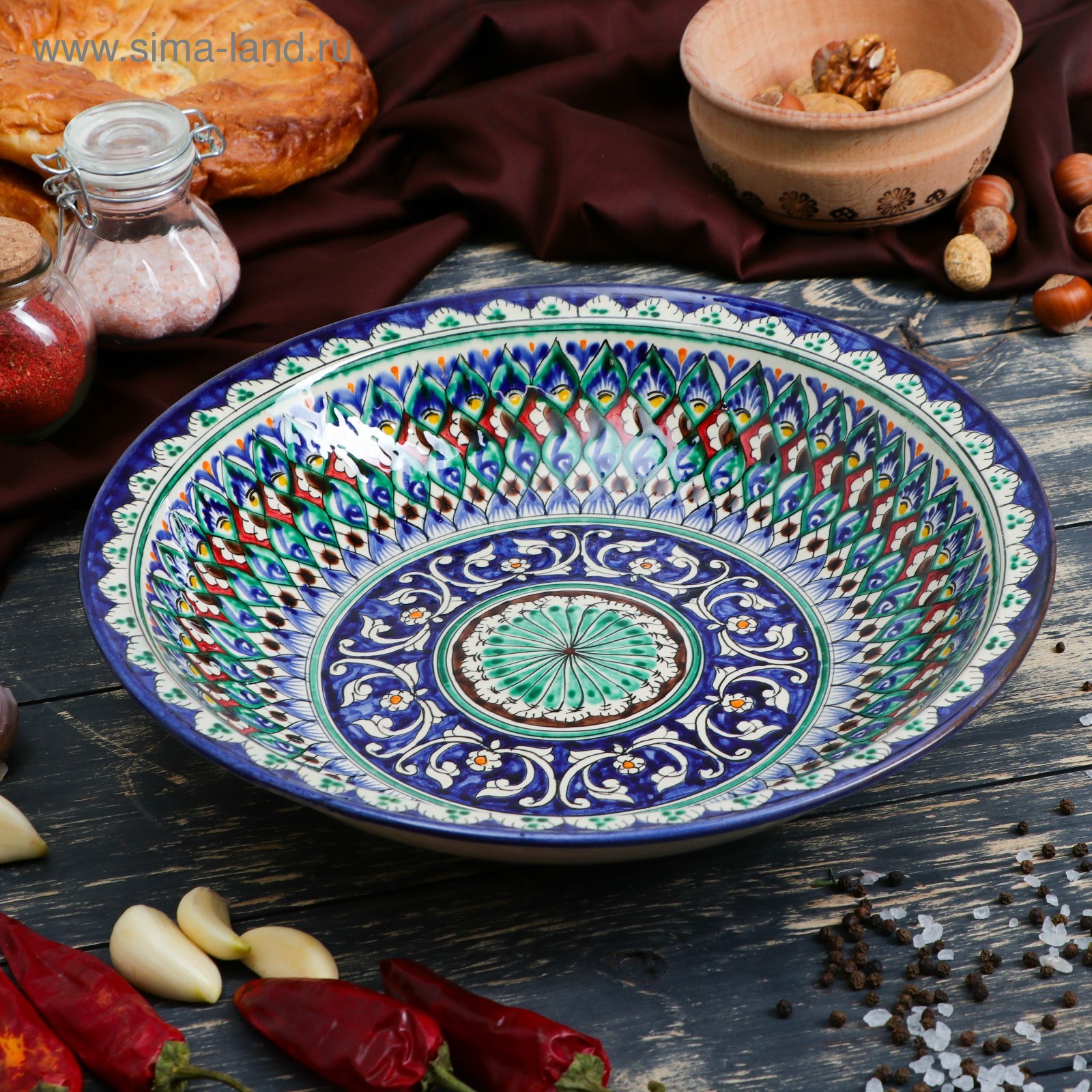 Супница риштанская керамика "узоры", 27 см, синяя