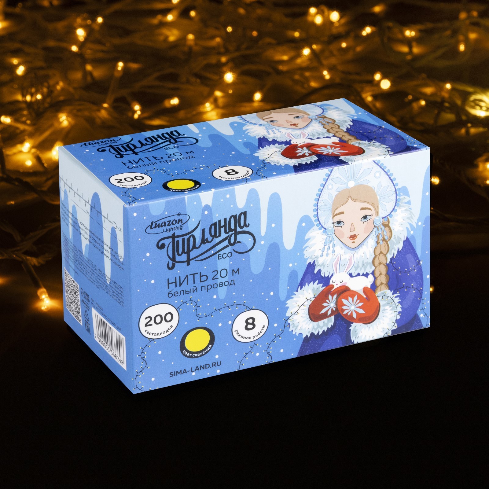 Гирлянда «нить» 20 м, Ip20, белая нить, 200 Led, свечение жёлтое, 8 режимов, 220 в