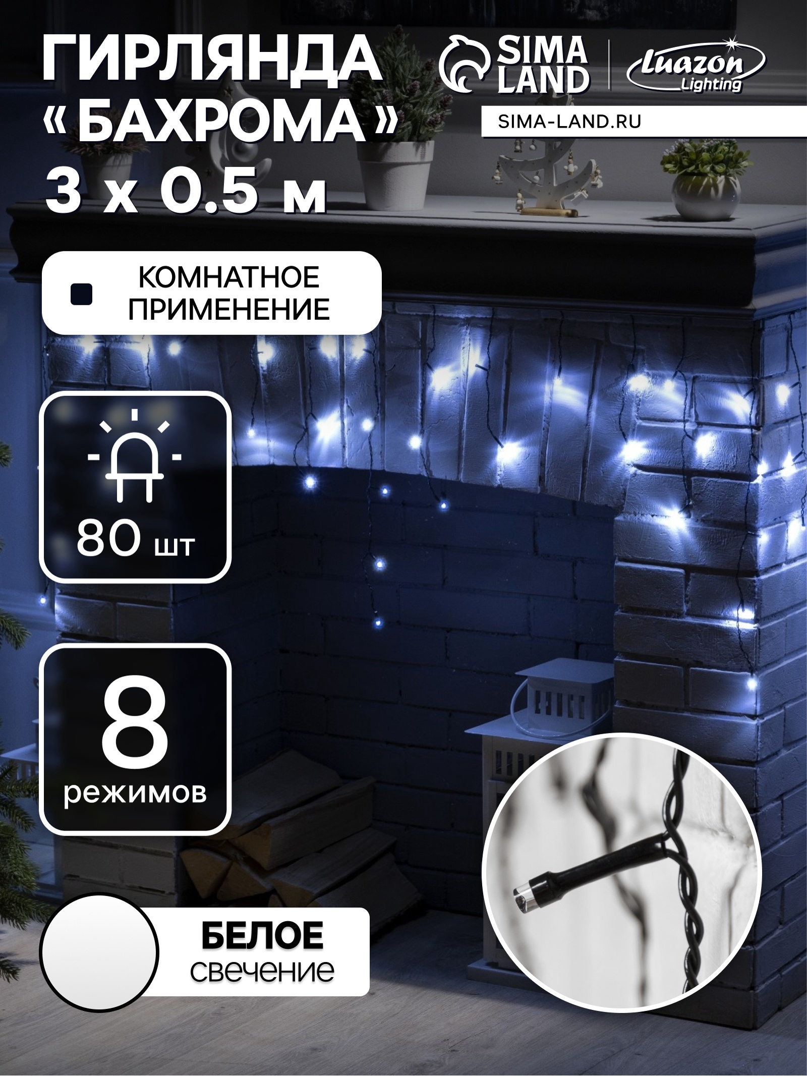 Гирлянда «бахрома» 3 0.5 м, Ip20, тёмная нить, 80 Led, свечение белое, 8 режимов, 220 в