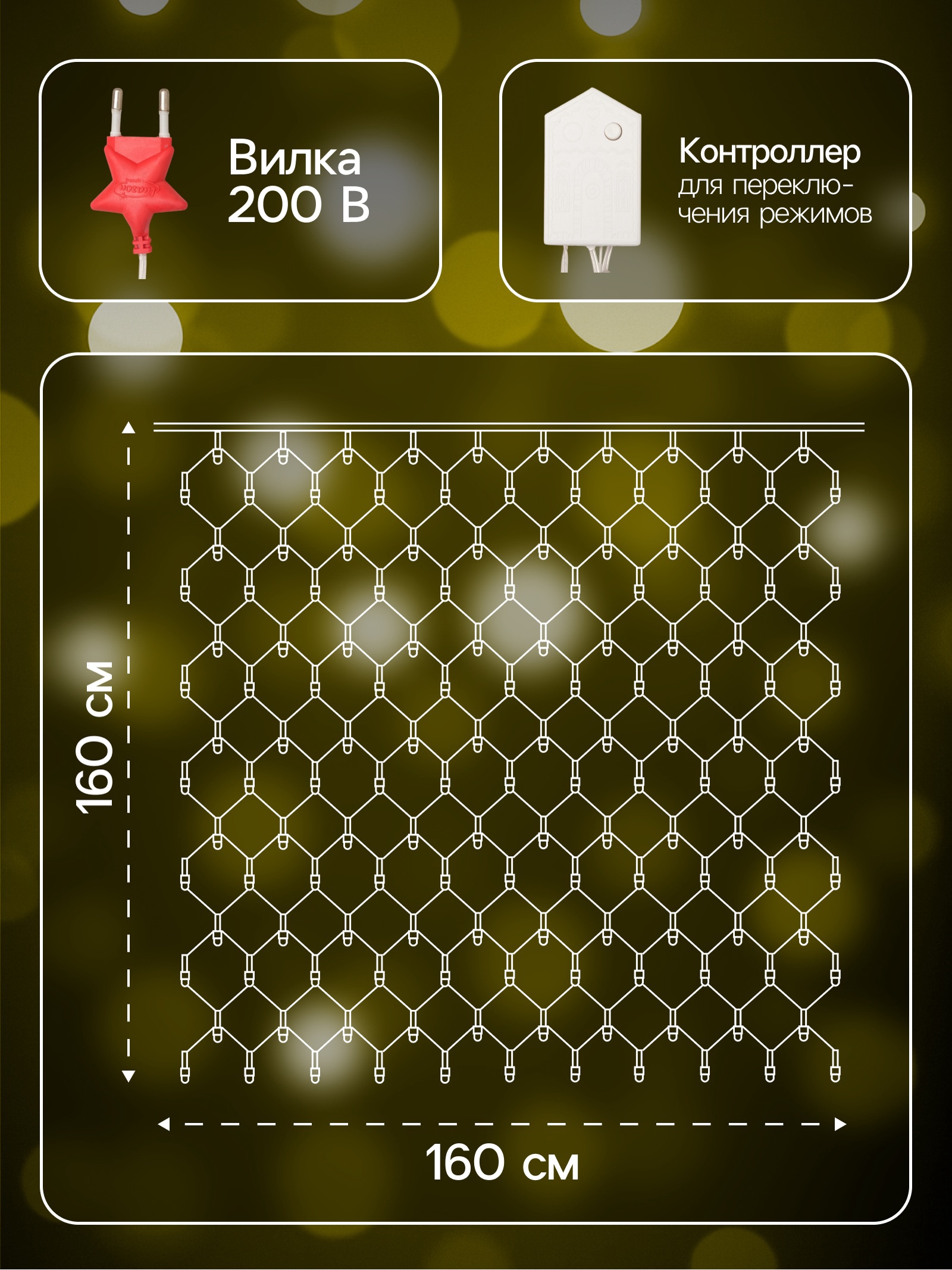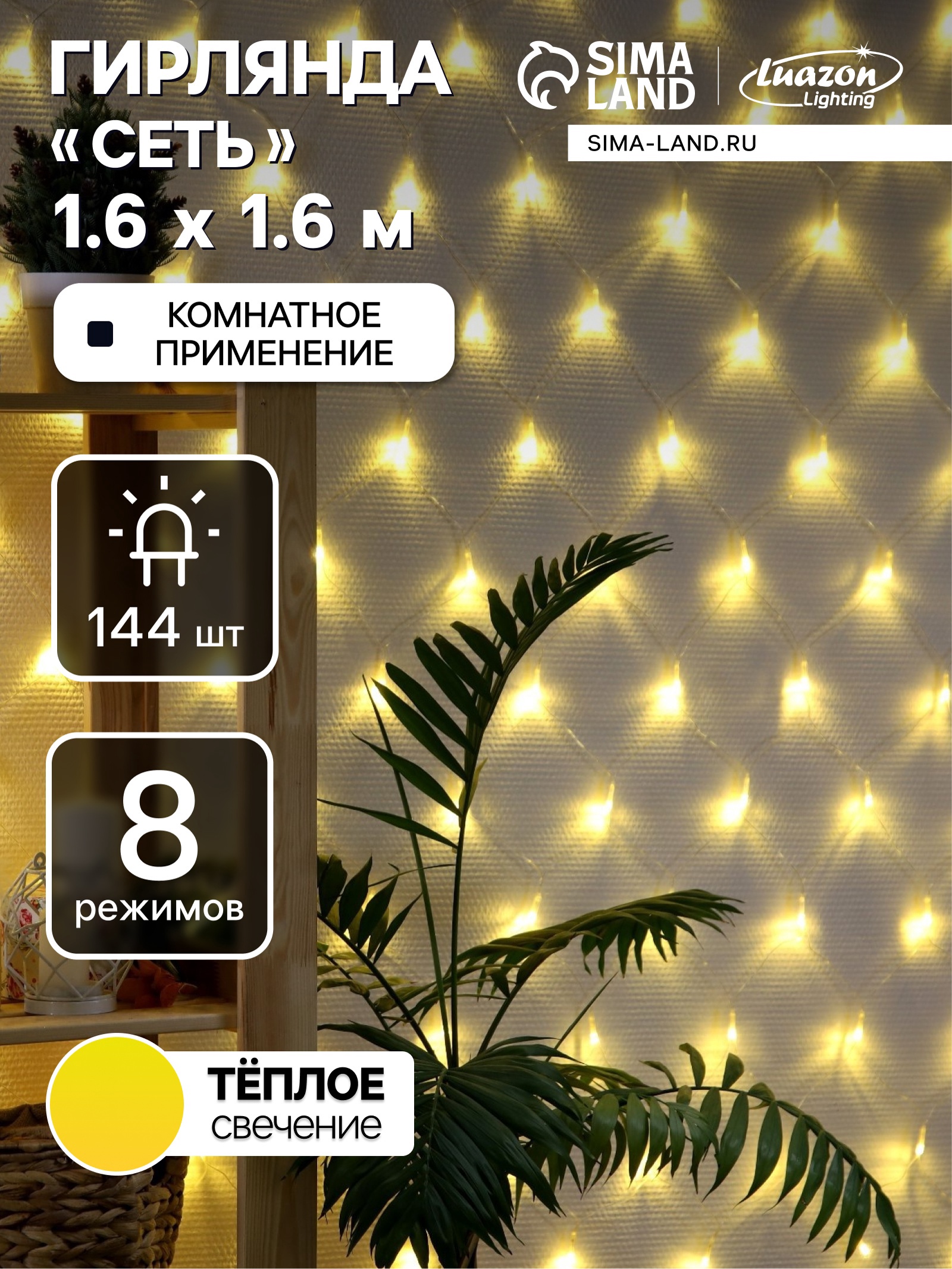 Гирлянда «сеть» 1.6 1.6 м, Ip20, прозрачная нить, 144 Led, свечение тёплое белое, 8 режимов, 220 в