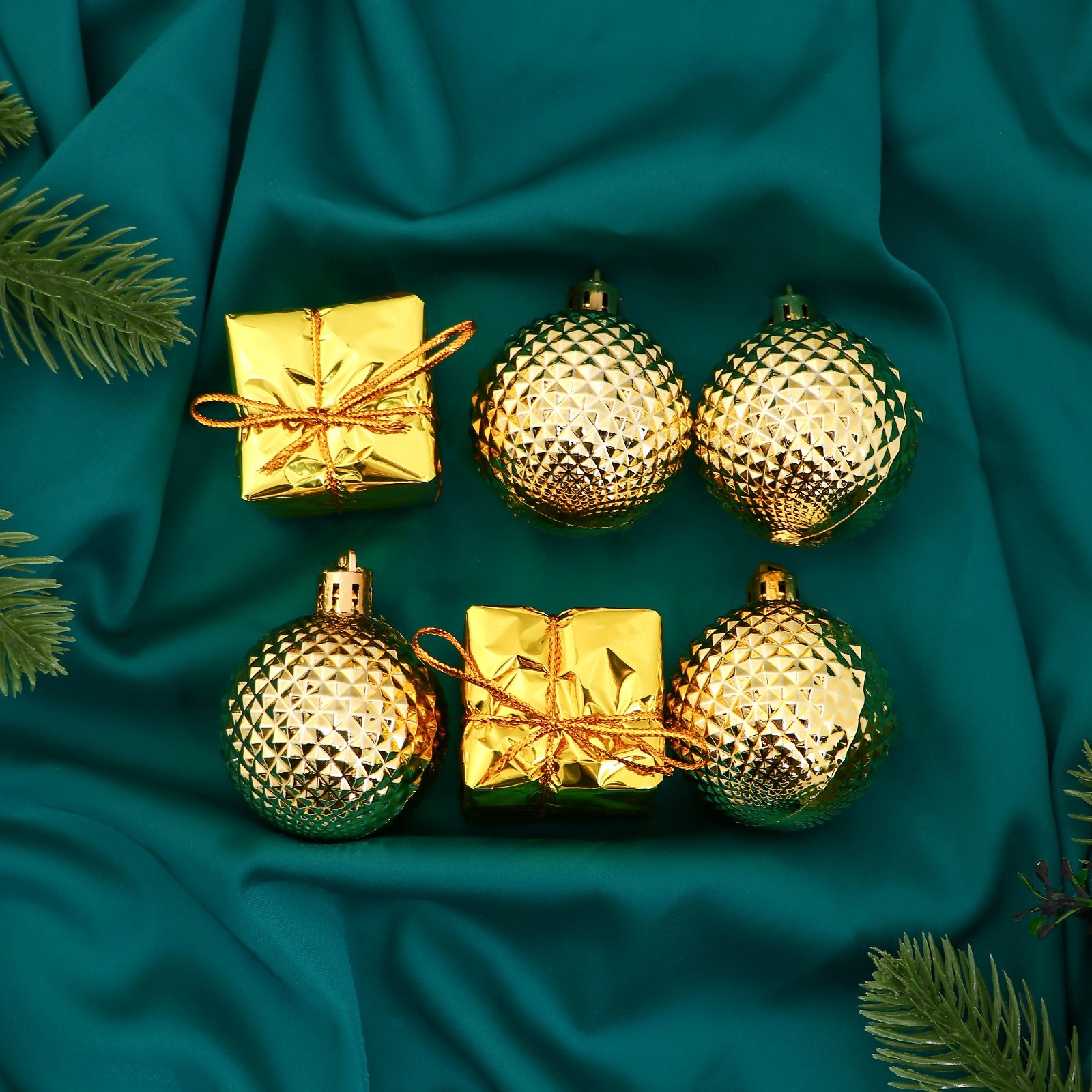 Ёлочные игрушки «рассвет», набор 6 шт. (4 шара, 2 подарка) 4.5 см, золото