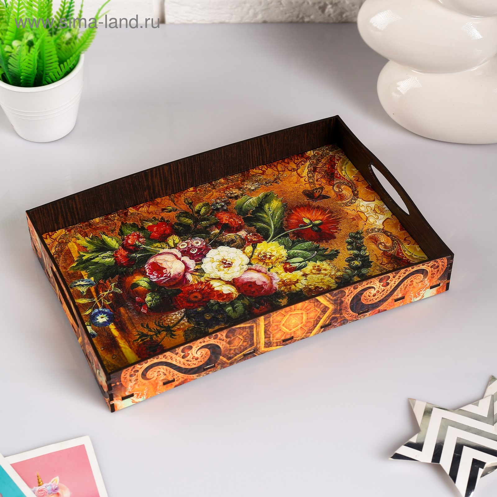 Поднос с ручками "цветы", деревянный, 30х20х4,5см