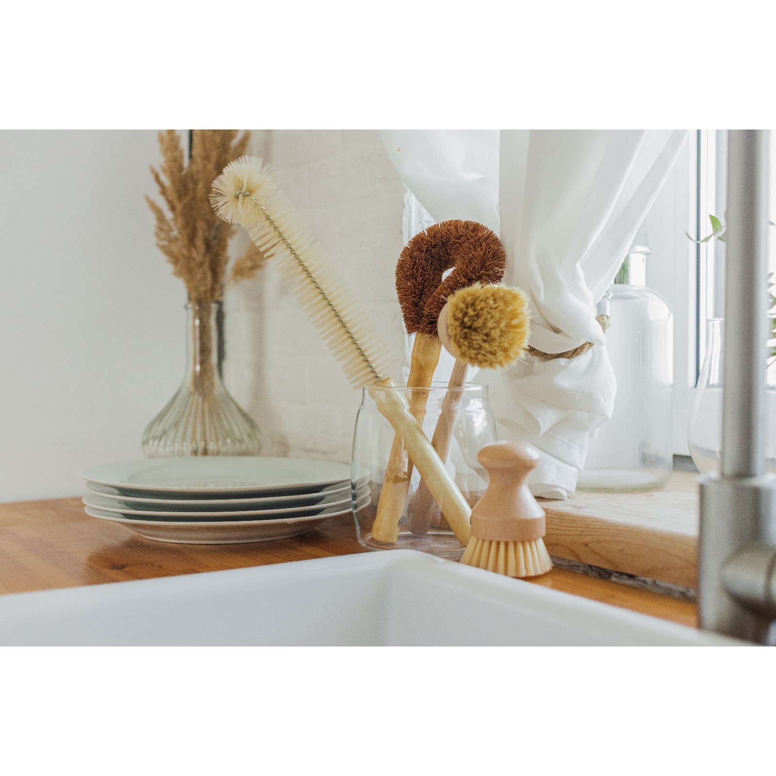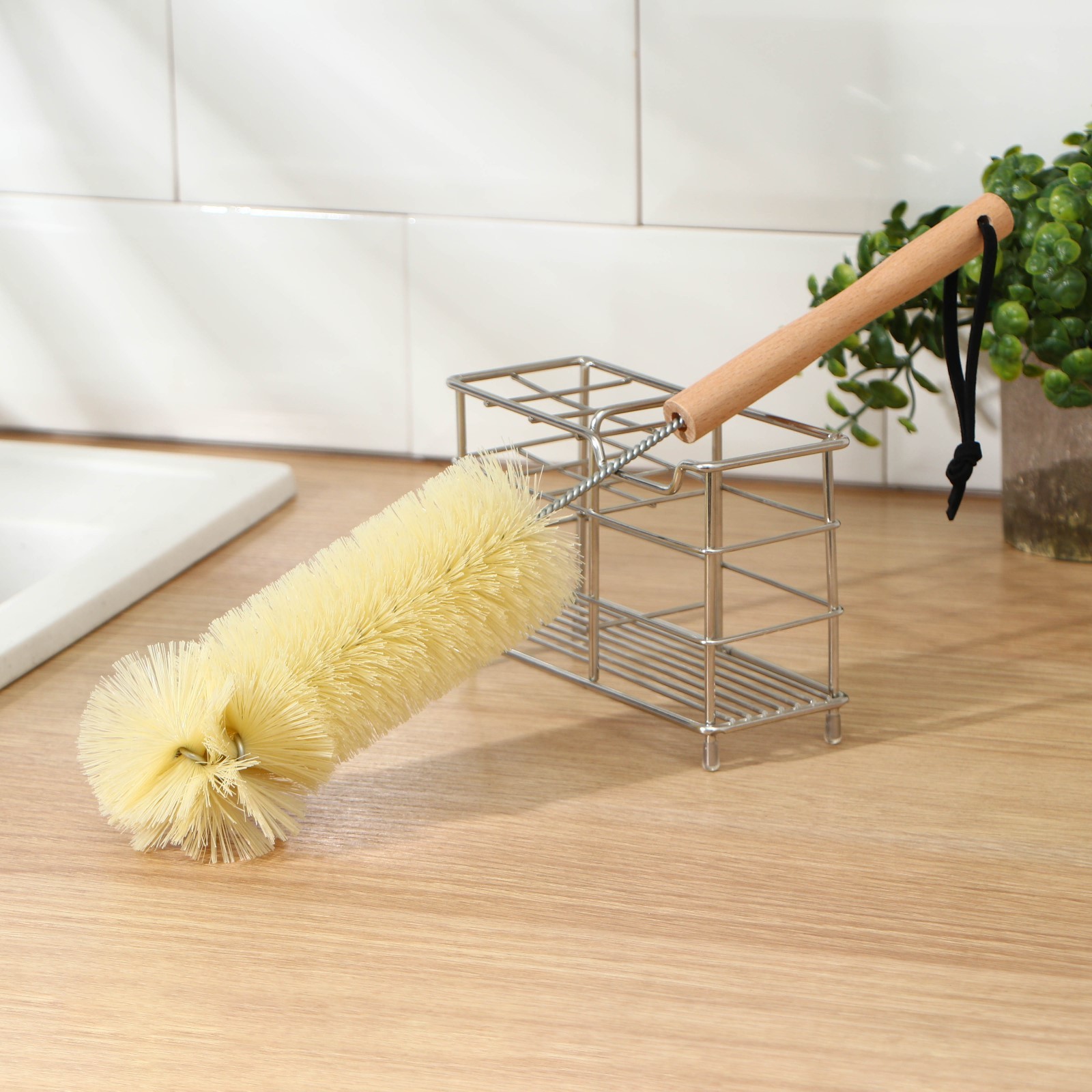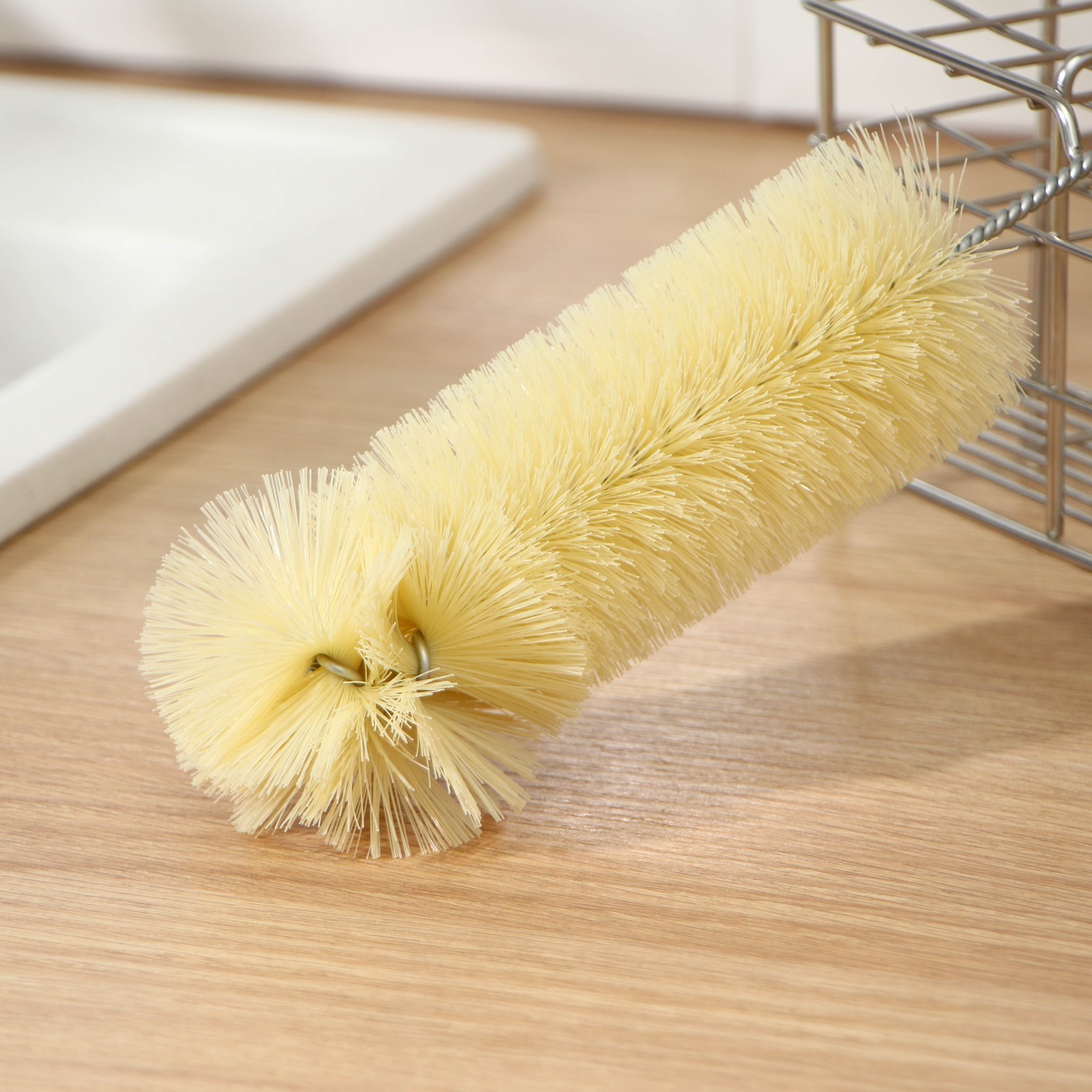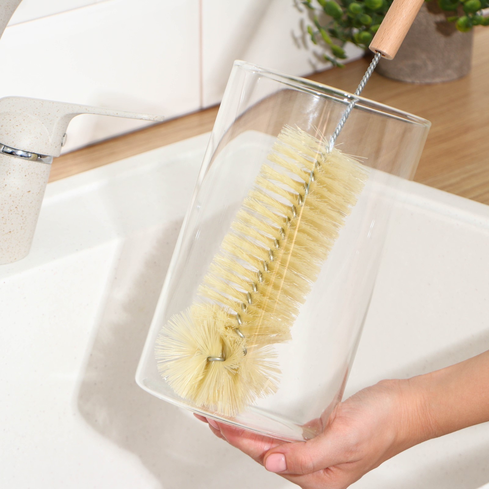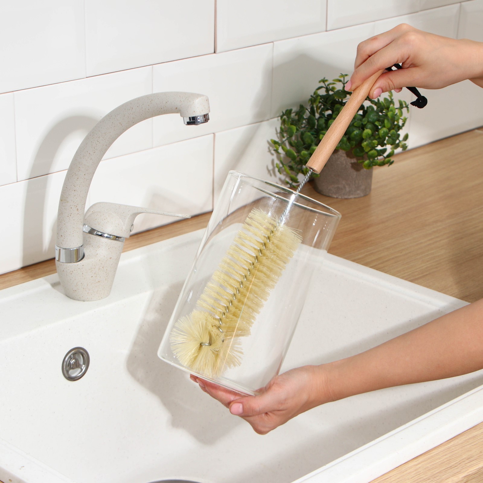 Ёршик для посуды с деревянной ручкой доляна, 37x7 см. Бутылочный ёрш – необходимый предмет на кухне каждой хозяйки. Щётка очищает загрязнения и поможет содержать в чистоте даже самые труднодоступные места. Преимущества: Кухонный ёрш подходит для мытья посуды, детских бутылочек, сосок, банок, колб кальянов, ваз, кувшинов, чайников, бутылок, термосов, стаканов, графинов и прочей глубокой посуды с узким горлышком. Ёршик имеет удобную тонкую ручку и отверстие для подвешивания, можно хранить в подвешенном положении. Жесткая прочная щетина долго служит, не изнашивается. Цвет: Бежевый parts count: 0 tnved: 9603909100 Вид: Ёршик Материал: Пластик Материал колодки: Дерево Материал щетины щётки: Искусственная щетина  развернуть описание ▼