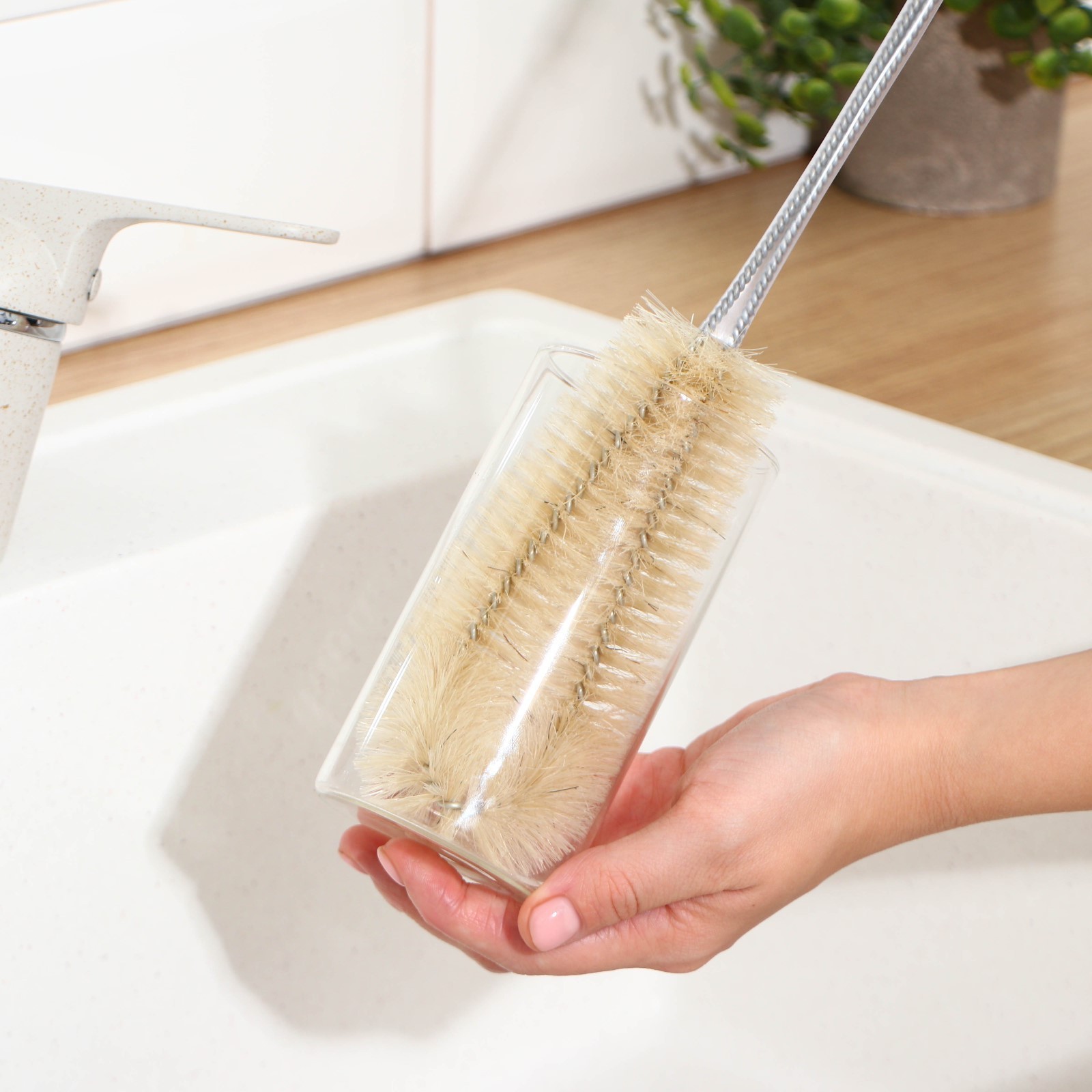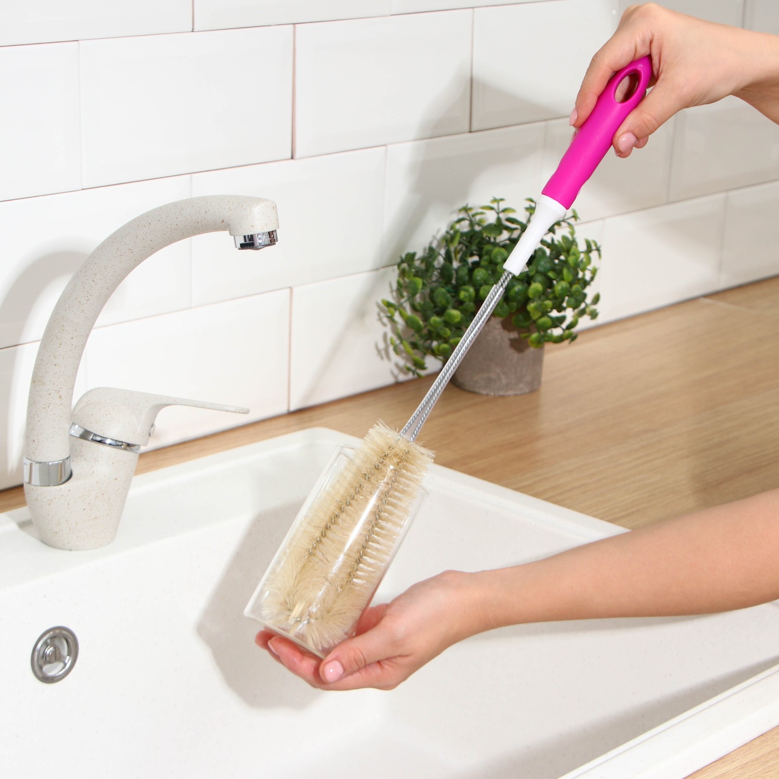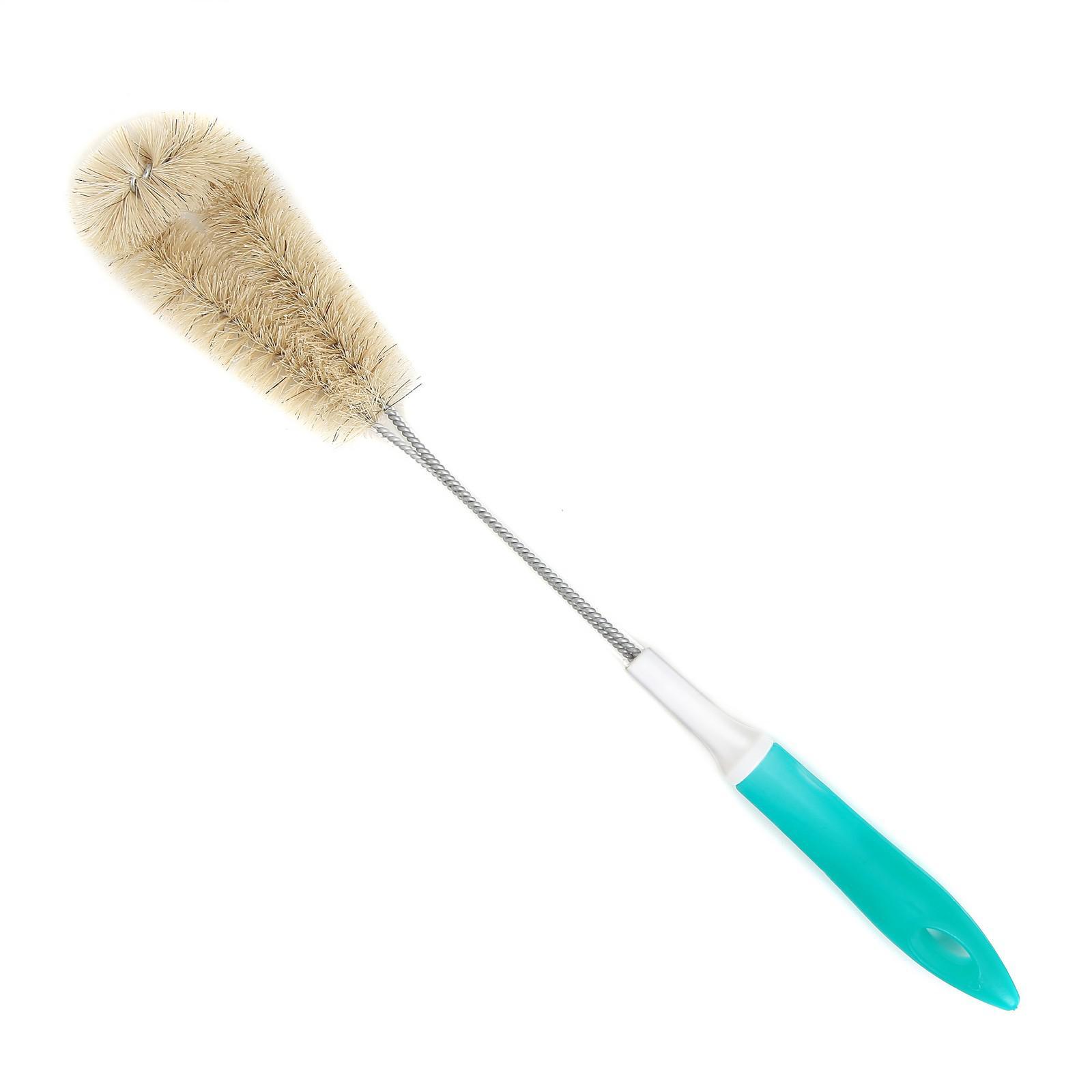Ёршик для посуды доляна, 42x6 см, цвет микс. Бутылочный ёрш – необходимый предмет на кухне каждой хозяйки. Преимущества: Кухонный ёрш подходит для мытья посуды, детских бутылочек, сосок, банок, колб кальянов, ваз, кувшинов, чайников, бутылок, термосов, стаканов, графинов и прочей глубокой посуды с узким горлышком. Ёршик имеет удобную тонкую ручку и отверстие для подвешивания, можно хранить в подвешенном положении. Благодаря изогнутой форме убирает загрязнения в самых труднодоступных местах. Жесткая прочная щетина долго служит, не изнашивается. Цвет: МИКС parts count: 0 tnved: 9603909100 Вид: Ёршик Материал: Натуральная щетина Материал колодки: Пластик Материал щетины щётки: Тампико  развернуть описание ▼