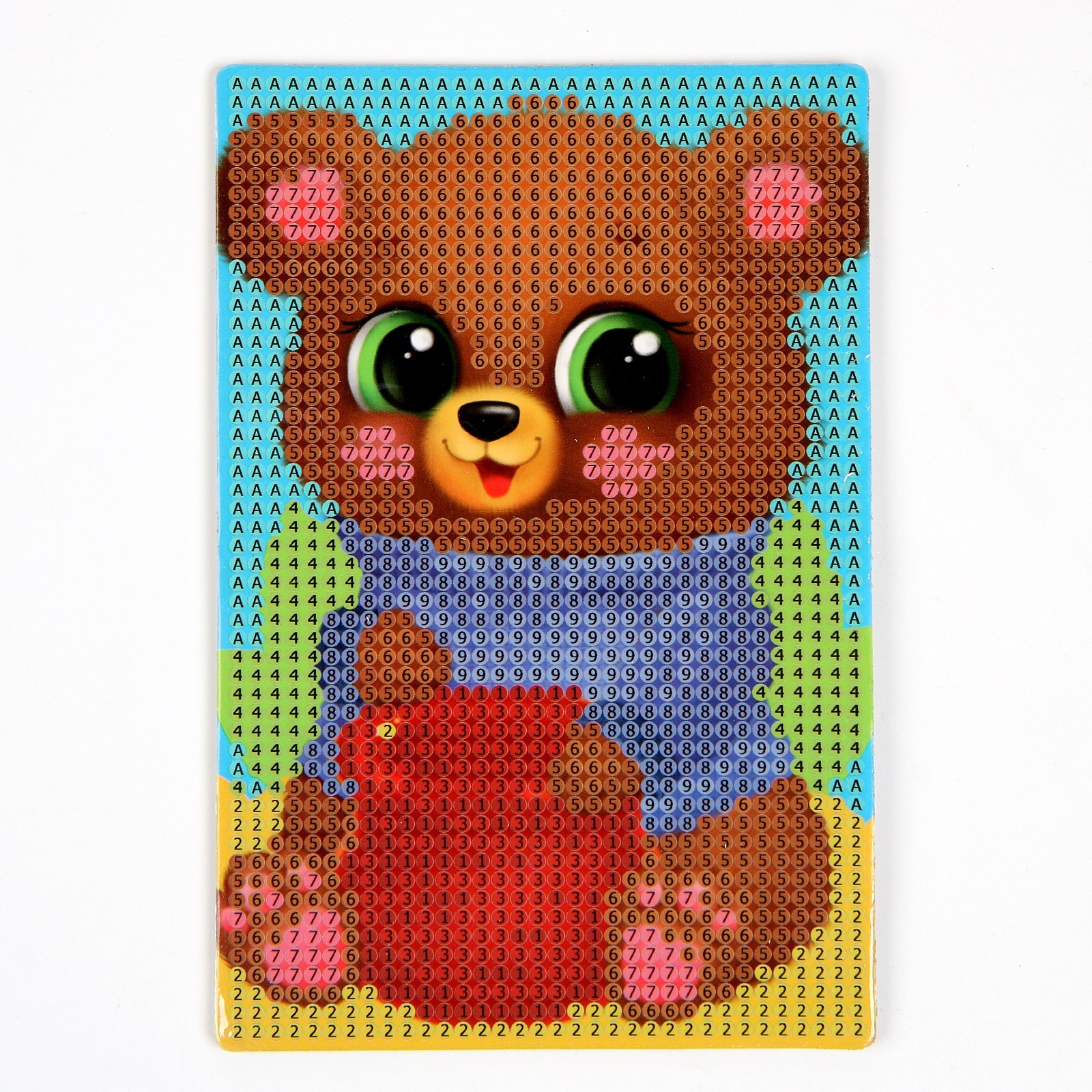 Алмазная мозаика на подставке «мишка» для детей, размер 10 х 15 см. набор для творчества. Алмазная мозаика — это увлекательный вид творчества, который понравится любому малышу! Ребёнку предстоит разложить кристаллики карандашом по пронумерованной схеме, заполнив всё полотно. Основа с клеевым покрытием будет надёжно удерживать стразы. На ней уже обозначены необходимые оттенки, а цветовая таблица расположена на упаковке. В наборе есть небольшой мольберт: с ним готовое творение можно расположить на полке или столе без дополнительных креплений. В таком интересном оформлении сверкающая картина будет выглядеть как предмет искусства. Как создать мозаику Для начала откройте небольшой участок схемы, приподняв и отогнув защитную плёнку. Не открывайте всю схему сразу.Из пакетика с номером, который соответствует схеме, отсыпьте в ёмкость немного стразов.Возьмите специальный карандаш, окуните кончик в клеевую подушечку (розовый квадратик), возьмите страз. Таким образом заполните рисунок.Немного терпения, и сверкающая картина готова! Количество цветов:8|Для кого:Унисекс|Размер, см:10 х 15|Ширина, см:10|Высота, см:15|Возраст:От 3 лет|Тематика:Животный мир|Тематика:Детская|Ориентация изображения:Вертикально|Материал для аппликации:Стразы|Тип выкладки:С частичным заполнением|Тип:Алмазная мозаика|Форма страз:Круглые|Тип основы:Картон|Страна:Китай  развернуть описание ▼