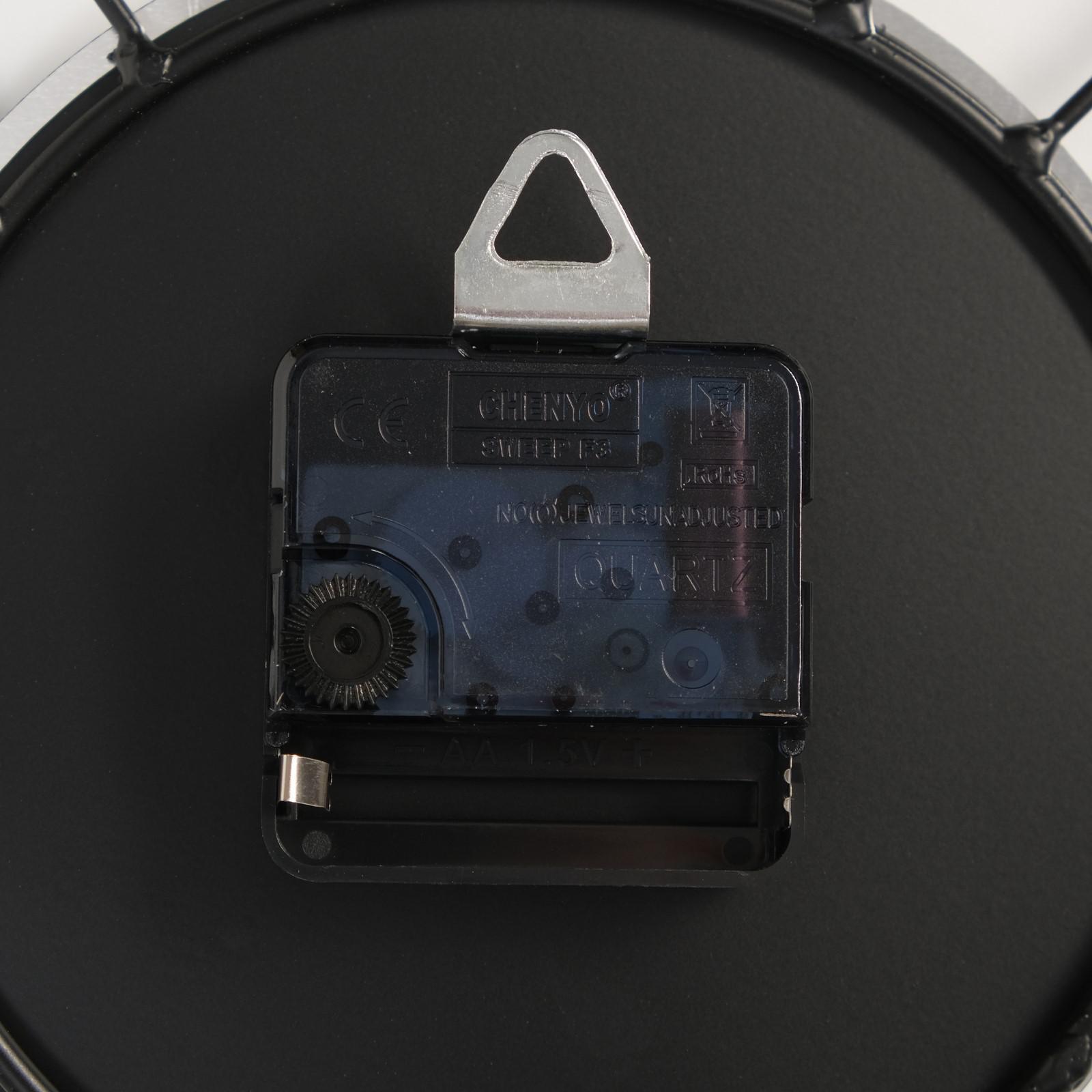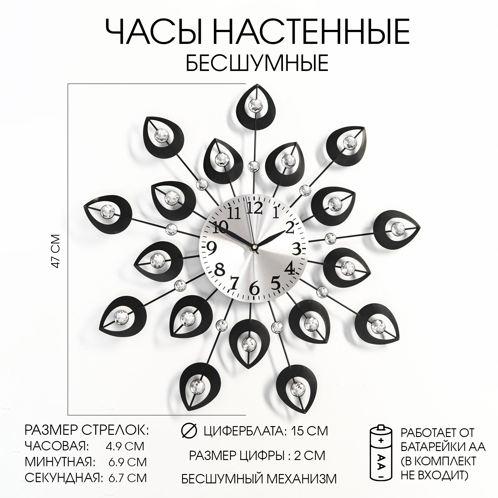 Плавный ход механизмаРаботают от батарейки типа АА (1 шт, в комплект не входит)Тип питания:От батареек|Форма:Круглая|Ширина, см:47|Высота, см:47|Диаметр циферблата, см:15|Тематика:Интерьер|Тематика:Цветочно-растительная|Тип индикации:Арабские цифры|Тематика праздника:8 Марта|Тип механизма:Кварцевый|Цвет циферблата:Серебристый|Материал:Пластик|Материал:Металл|Работает от сети:Нет|Типоразмер батареек:AA (LR6)|Ход стрелок:Плавный|Цвет корпуса:Чёрный|Бесшумные:Да|Страна:Китай