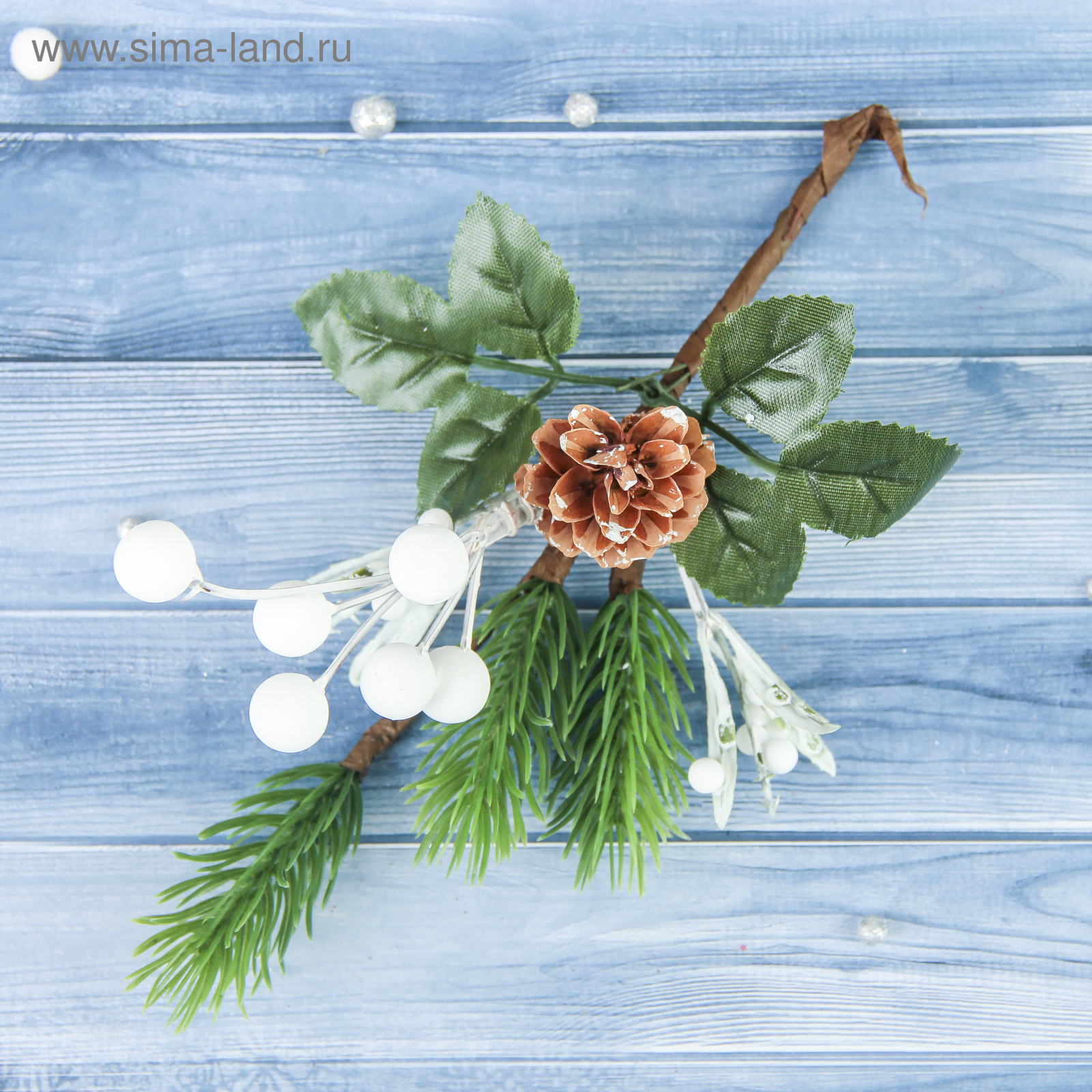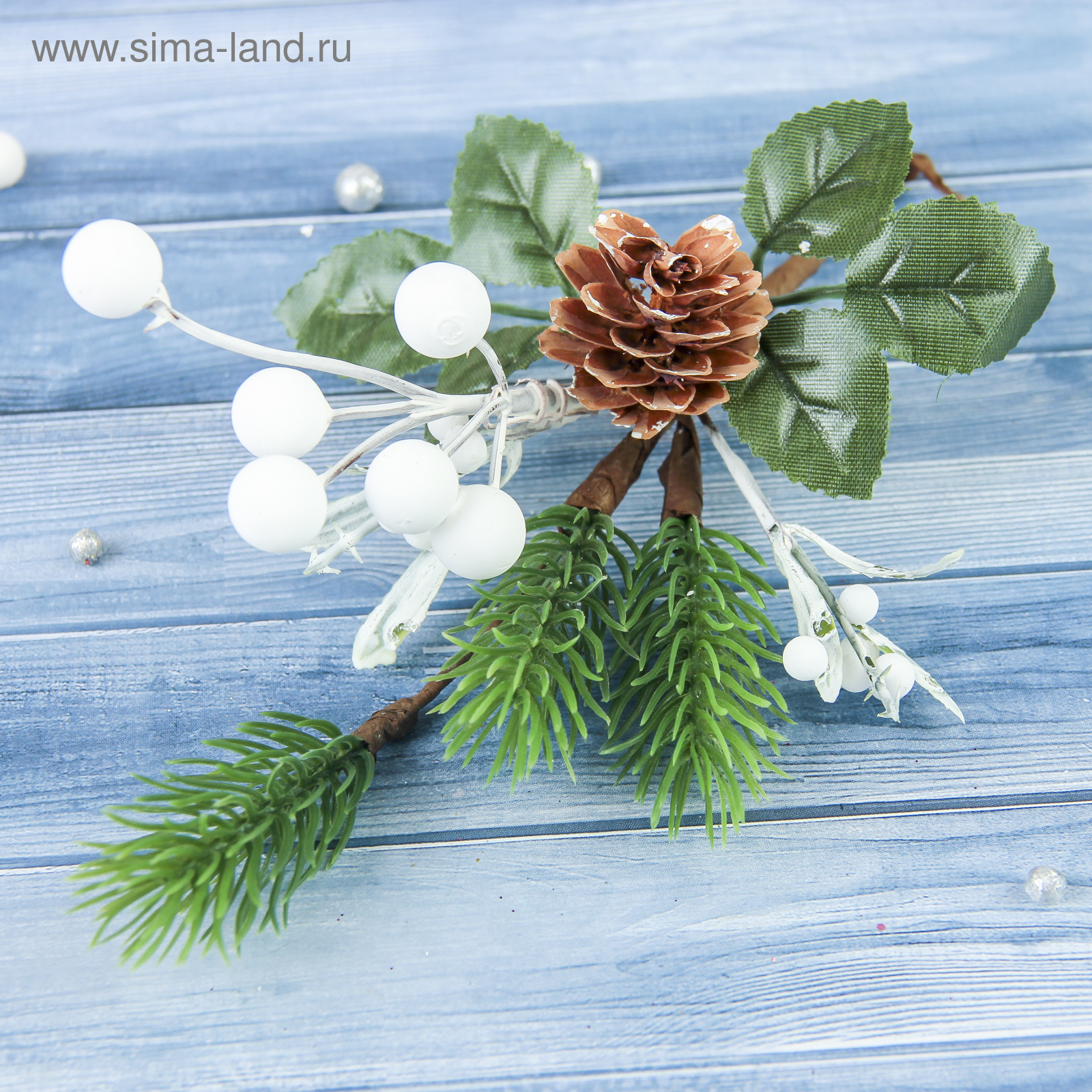 Еловая ветка декоративная «зимнее волшебство. грёзы», белые шарики, шишка, 15 см Еловая ветка декоративная «зимнее волшебство. грёзы», белые шарики, шишка, 15 см