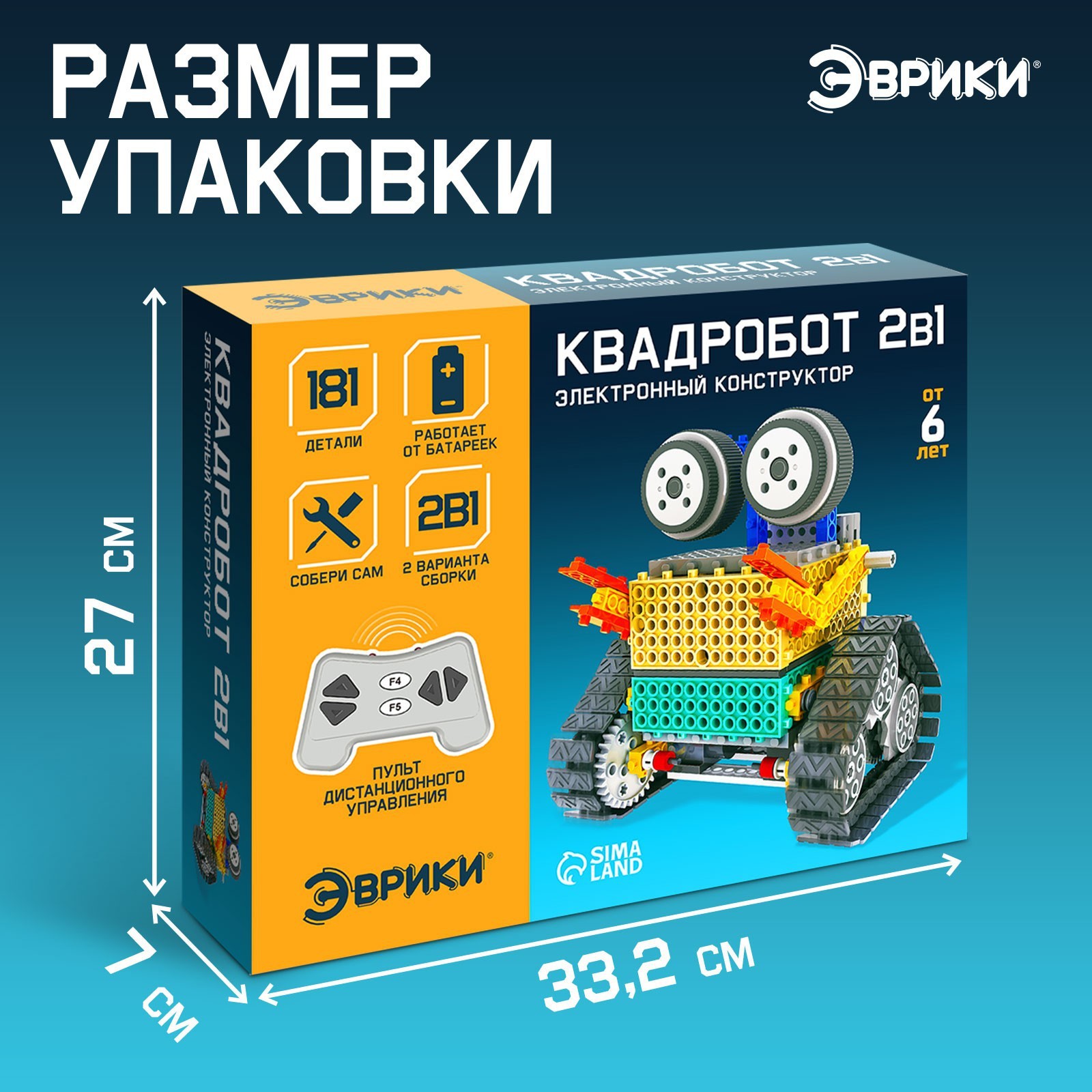 Конструктор радиоуправляемый «квадробот», 2 варианта сборки, 181 деталь. Радиоуправляемый конструктор «Квадробот» — это увлекательный набор для детей от 6 лет. После сборки ребёнок сможет управлять созданной моделью с помощью пульта дистанционного управления, что добавляет игре динамику и интерес. Особенности набора Два варианта сборки робота, что позволяет разнообразить игру и развивать творческие способности.В комплекте 181 деталь, обеспечивающая увлекательный процесс сборки и возможность экспериментировать с конструкцией.Пульт дистанционного управления для полного контроля над движениями собранного робота.Рекомендован для детей старше 6 лет, что делает его отличным выбором для младших школьников.Изготовлен из качественного и безопасного пластика, обеспечивающего долговечность и безопасность в использовании.Польза от игры Сборка и управление «Квадроботом» способствует развитию мелкой моторики, логического мышления и навыков решения задач. Ребёнок учится следовать инструкциям, а также проявлять креативность, создавая собственные варианты робота. Управление готовой моделью развивает координацию и реакцию, превращая игру в полезное и увлекательное занятие. Тип питания:От батареек|Для кого:Унисекс|Возраст:От 6 лет|Количество батареек:6|Среднее время сборки, мин:90|Количество элементов:181|Вид упаковки:Коробка|Материал:Пластик|Тематика конструктора:Роботы|Тематика конструктора:Техника|Дополнительные функции:Подвижная|Типоразмер батареек:AAA (LR03)|Типоразмер батареек:AA (LR6)|Форма:Классический робот|Тип питания пульта управления:От батареек|Вид науки:Робототехника|Уровень сложности:Средний|Размер деталей:Большие детали|Страна:Китай  развернуть описание ▼