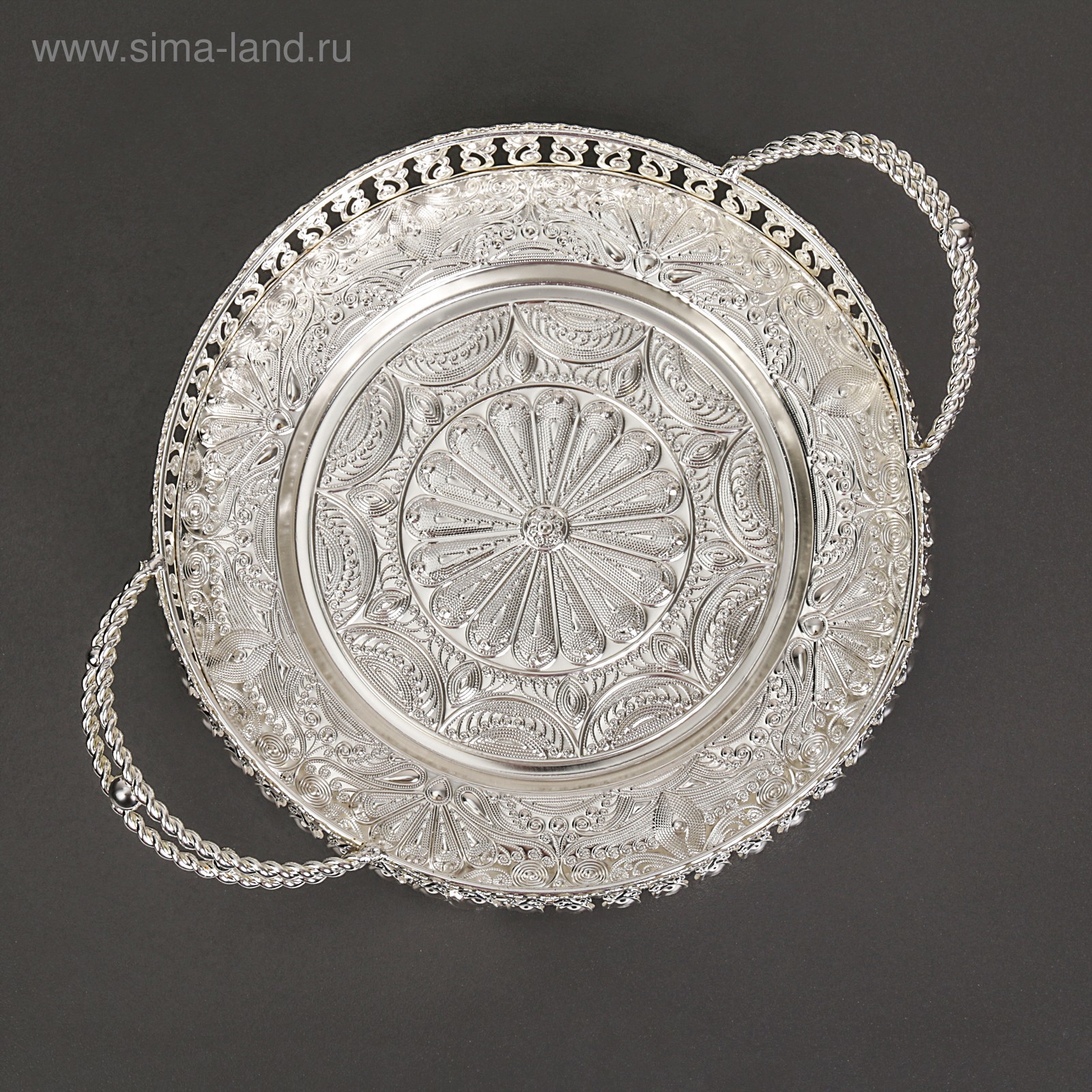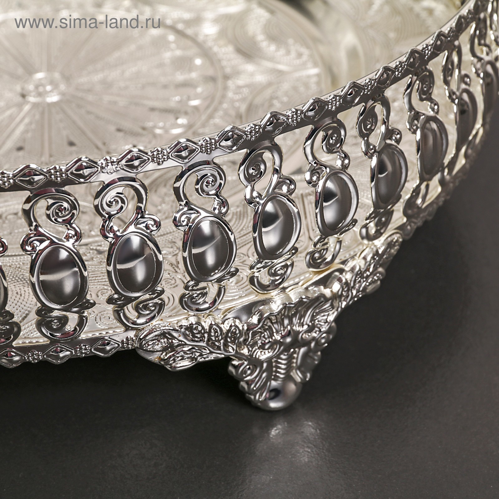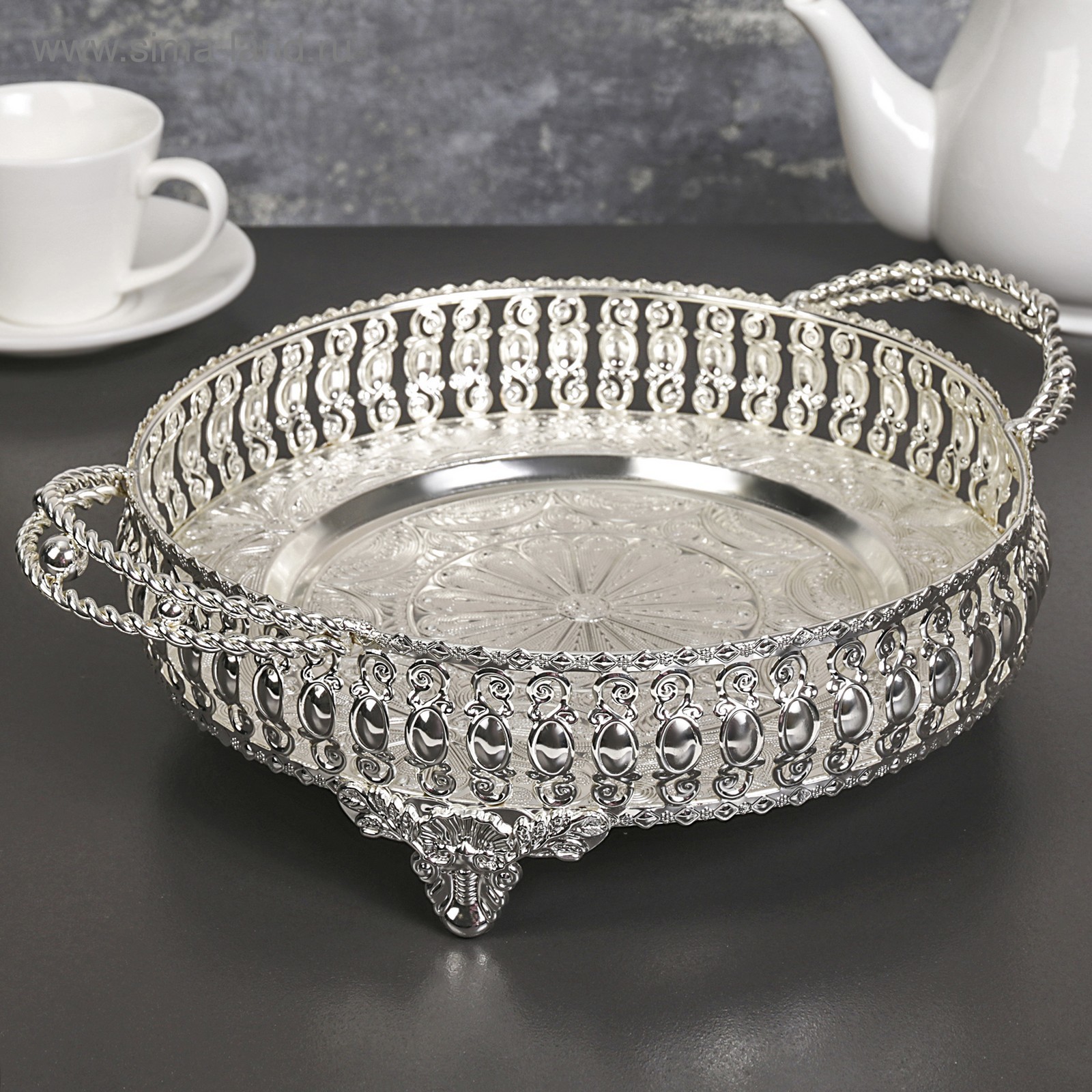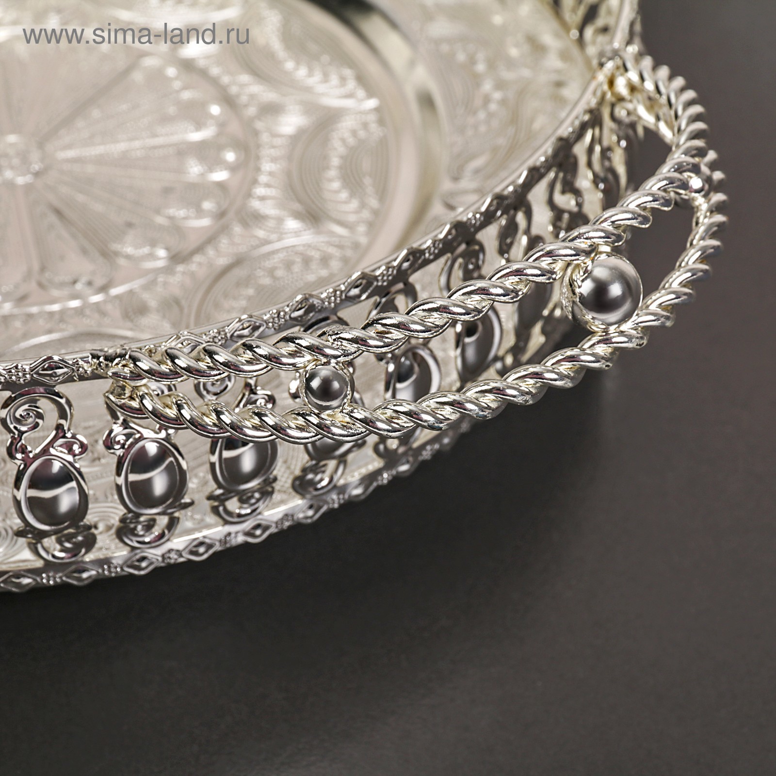 Поднос сервировочный «солон», 34x24,5x9 см, с ручками, цвет серебряный. Посуда серии «Богема» предназначена для праздничной сервировки стола. Предметы выполнены из прочного металла с декоративным покрытием. Особенности изделий: изящные орнаменты на поверхности, блестящая полировка, насыщенный цвет. Посуда устойчива к деформации и ржавчине. Для мойки используйте мягкие губки и неабразивные средства. Цвет: Хромированный Форма: Круглая Диаметр, см: 24.5 parts count: 0 Количество ячеек: 1 tnved: 7323990000 Материал: Металл Можно мыть в посудомоечной машине: Нет Форма: Круг, шар, цилиндр  развернуть описание ▼