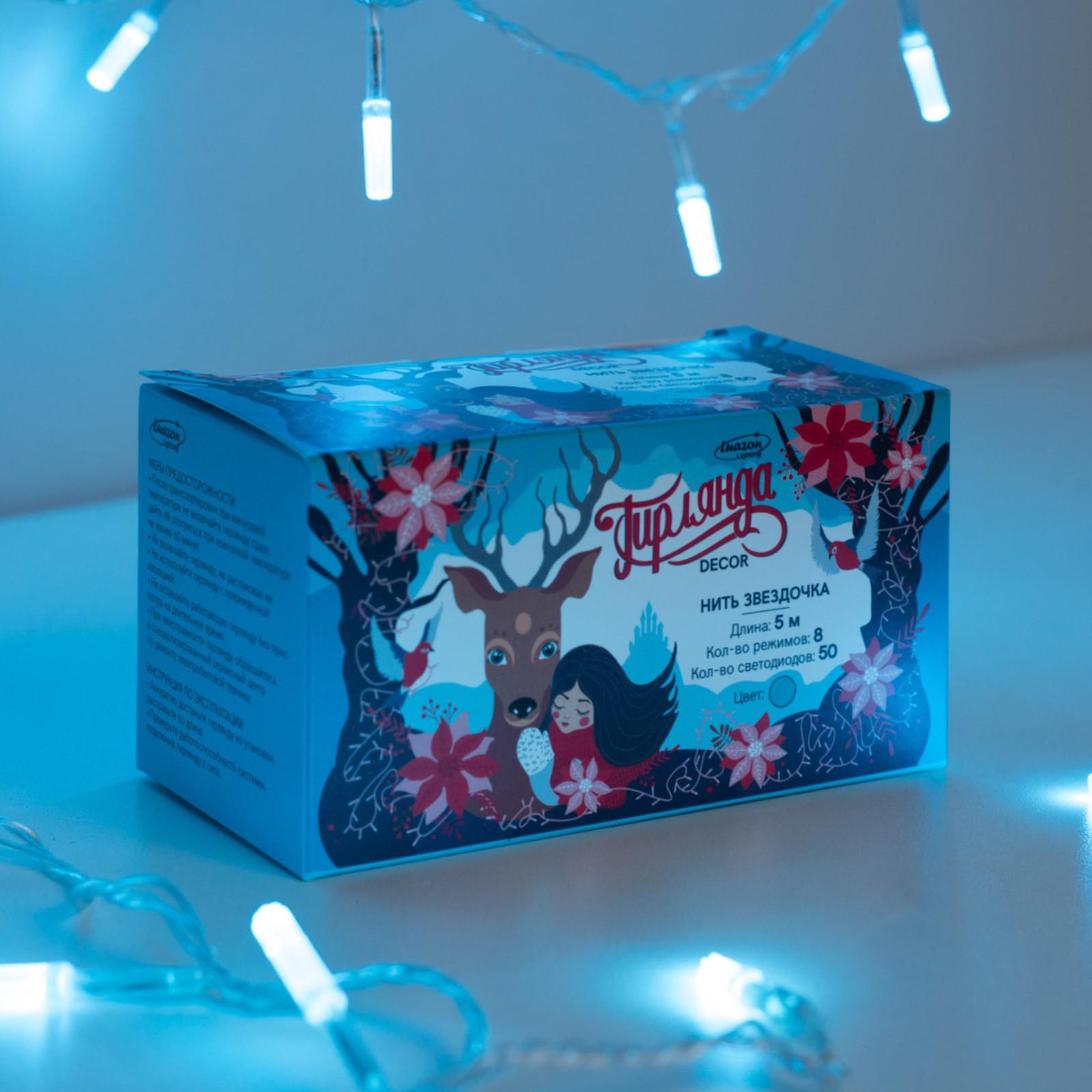 Гирлянда «нить» 5 м с насадками «звёздочки», Ip20, прозрачная нить, 50 Led, свечение аквамарин, 8 режимов, 220 в