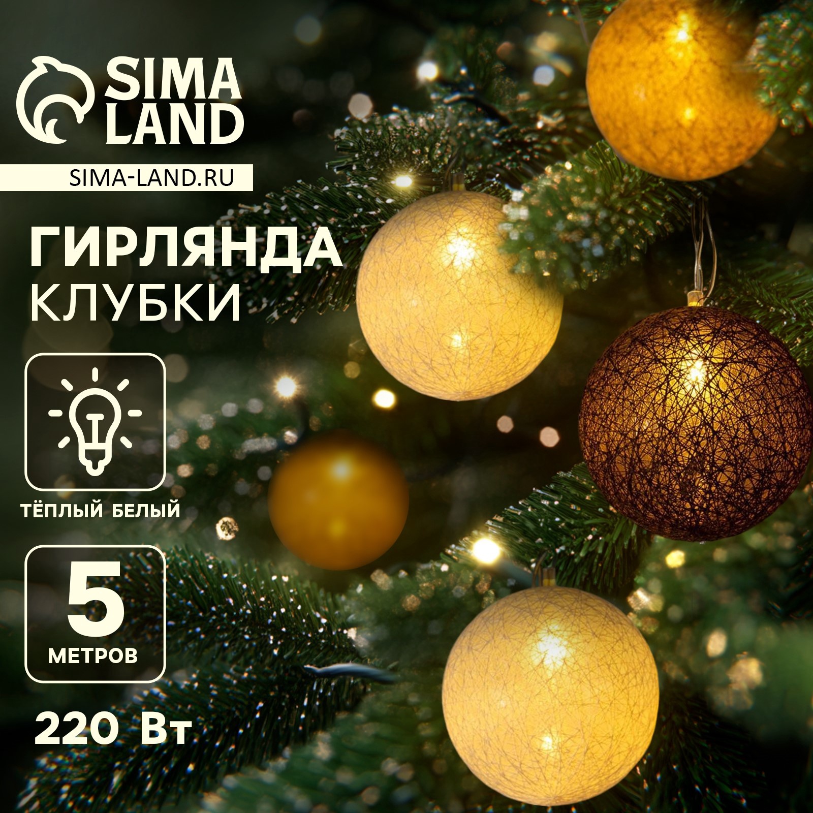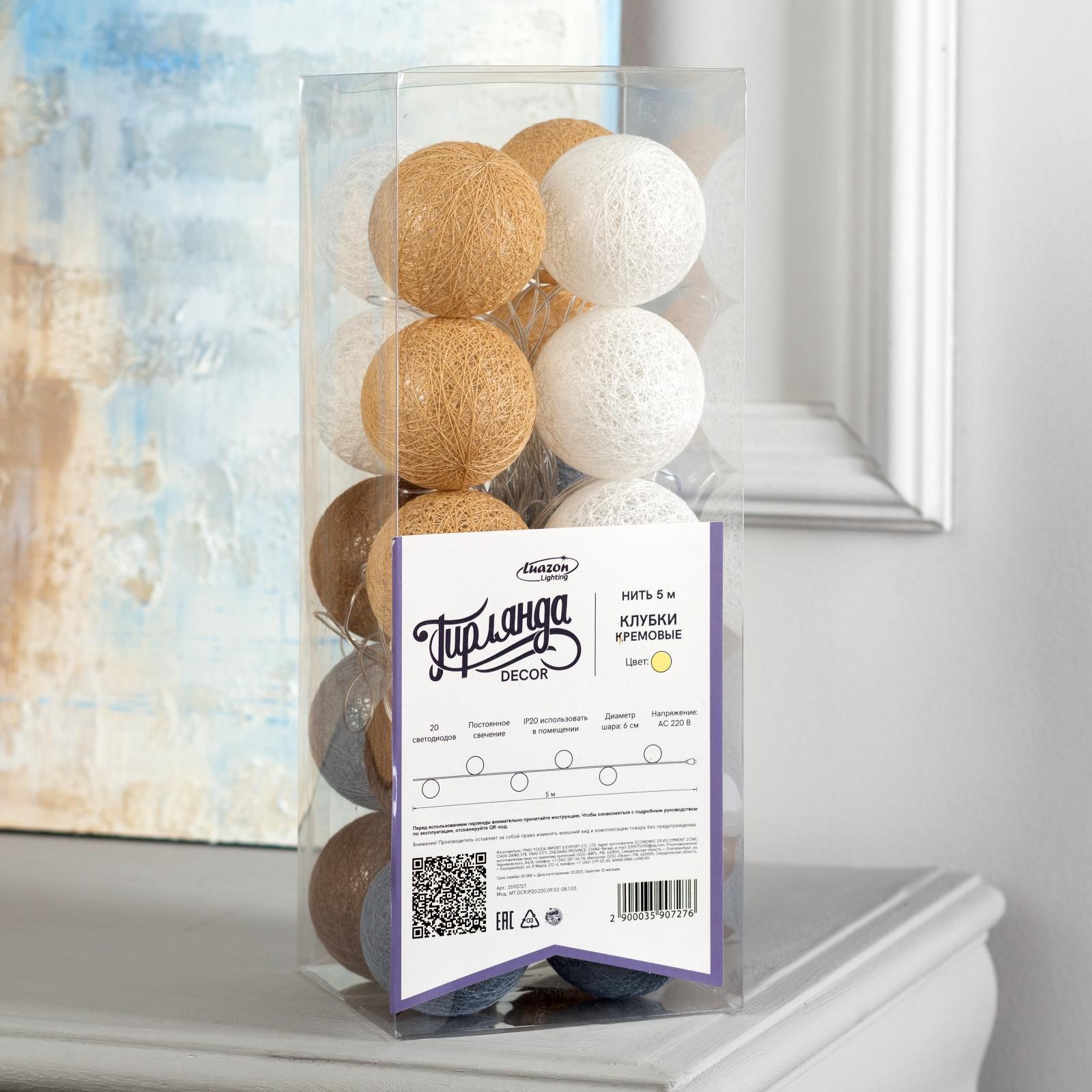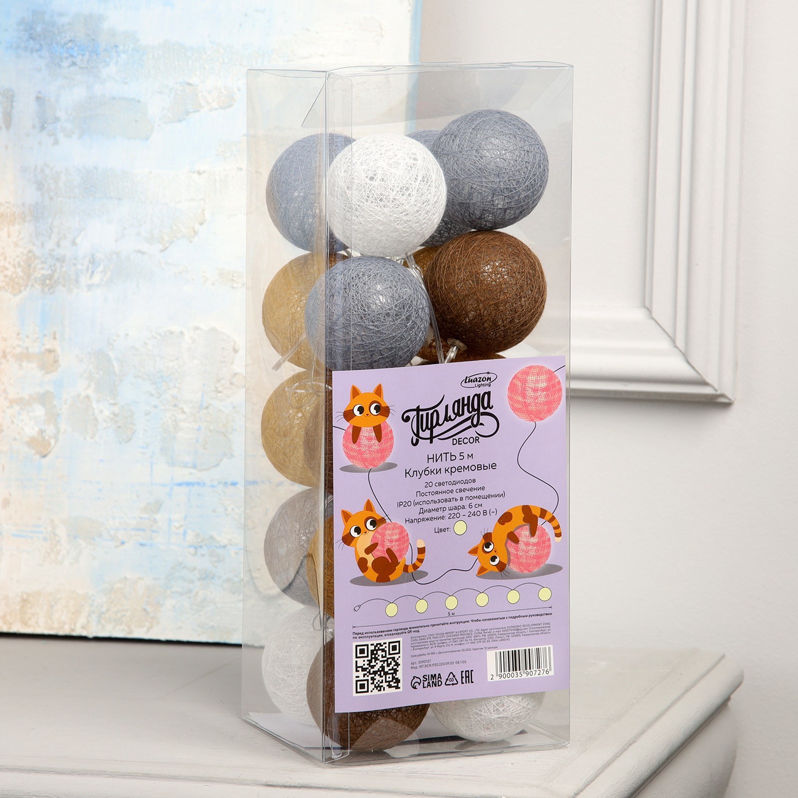 Гирлянда - нить, 5 м с насадками «клубки кремовые», Ip20, прозрачная нить, 20 Led, свечение тёплое белое, 220 в