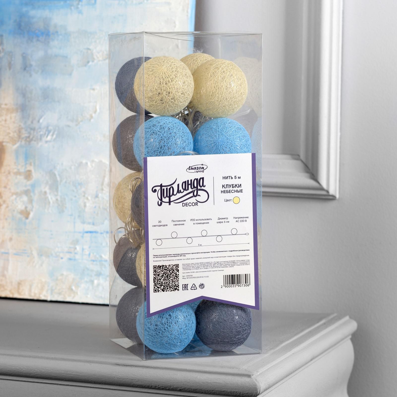 Гирлянда - нить, 5 м с насадками «клубки небесные», Ip20, прозрачная нить, 20 Led, свечение тёплое белое, 220 в