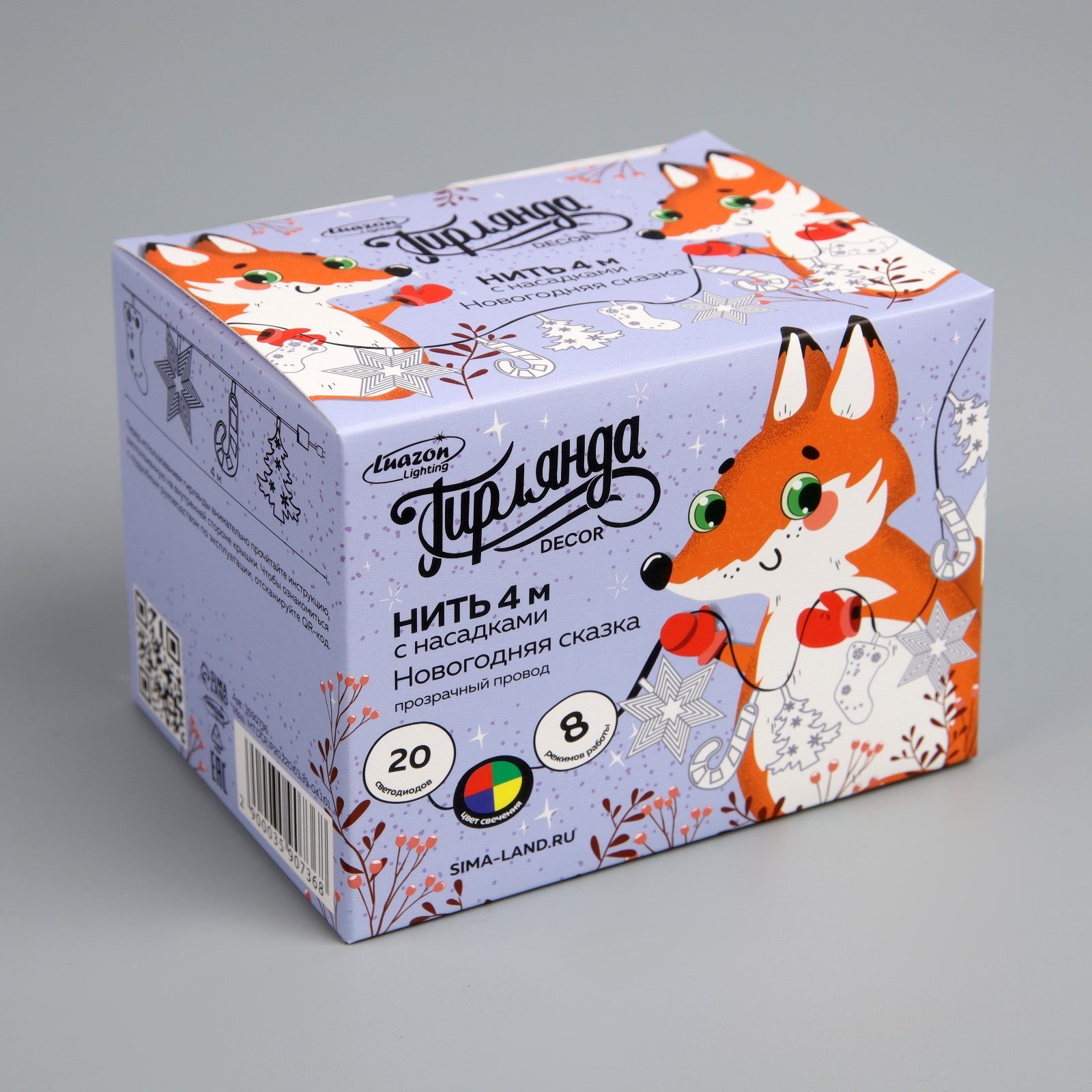 Гирлянда «нить» 4 м с насадками «новогодняя сказка», Ip20, прозрачная нить, 20 Led, свечение мульти, 8 режимов, 220 в
