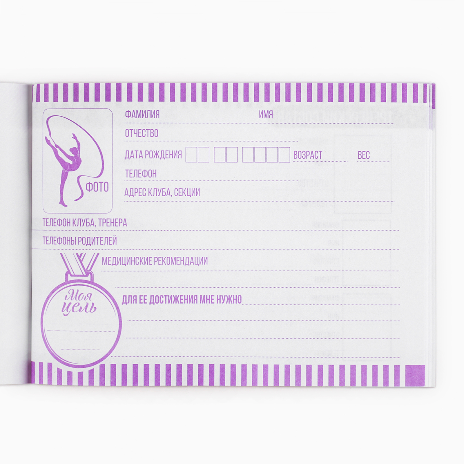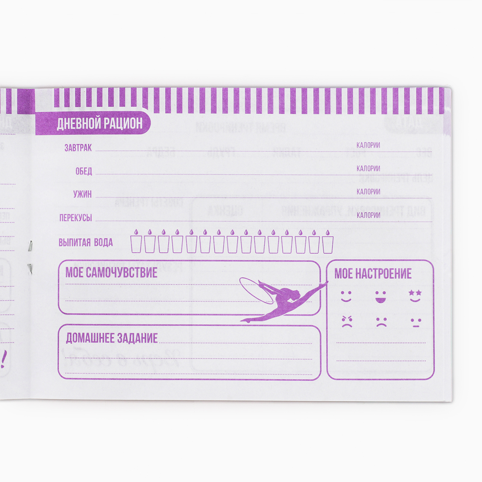 Дневник тренировок «верь в себя», гимнастика, 48 листов, 15,3 х 12,4 см. Дневник тренировок – личный помощник в достижении поставленных целей. Он создан для записи результатов тренировок дня, своих достижений и прогресса. Удобный формат позволяет брать дневник на тренировки и соревнования. А яркий дизайн мотивирует не останавливаться на достигнутом. Формат А6 был выбран по рекомендации профессиональных спортсменов, каждый лист отвечает за ежедневные потребности, позволяет оставлять личные заметки и отмечать даты. С помощью дневника тренировок легко отслеживать свои результаты и достигать больших побед! Данный дневник состоит из 48 листов, хватает на 1, 5 – 2 месяца ведение записей. Цвет: Фиолетовый Формат: А6 Количество листов: 48 Отделка: Цветная печать Материал обложки: Бумага Адресат: Спортсмену Материал: Бумага Вид спорта: Гимнастика Особенности: Мягкая обложка  развернуть описание ▼