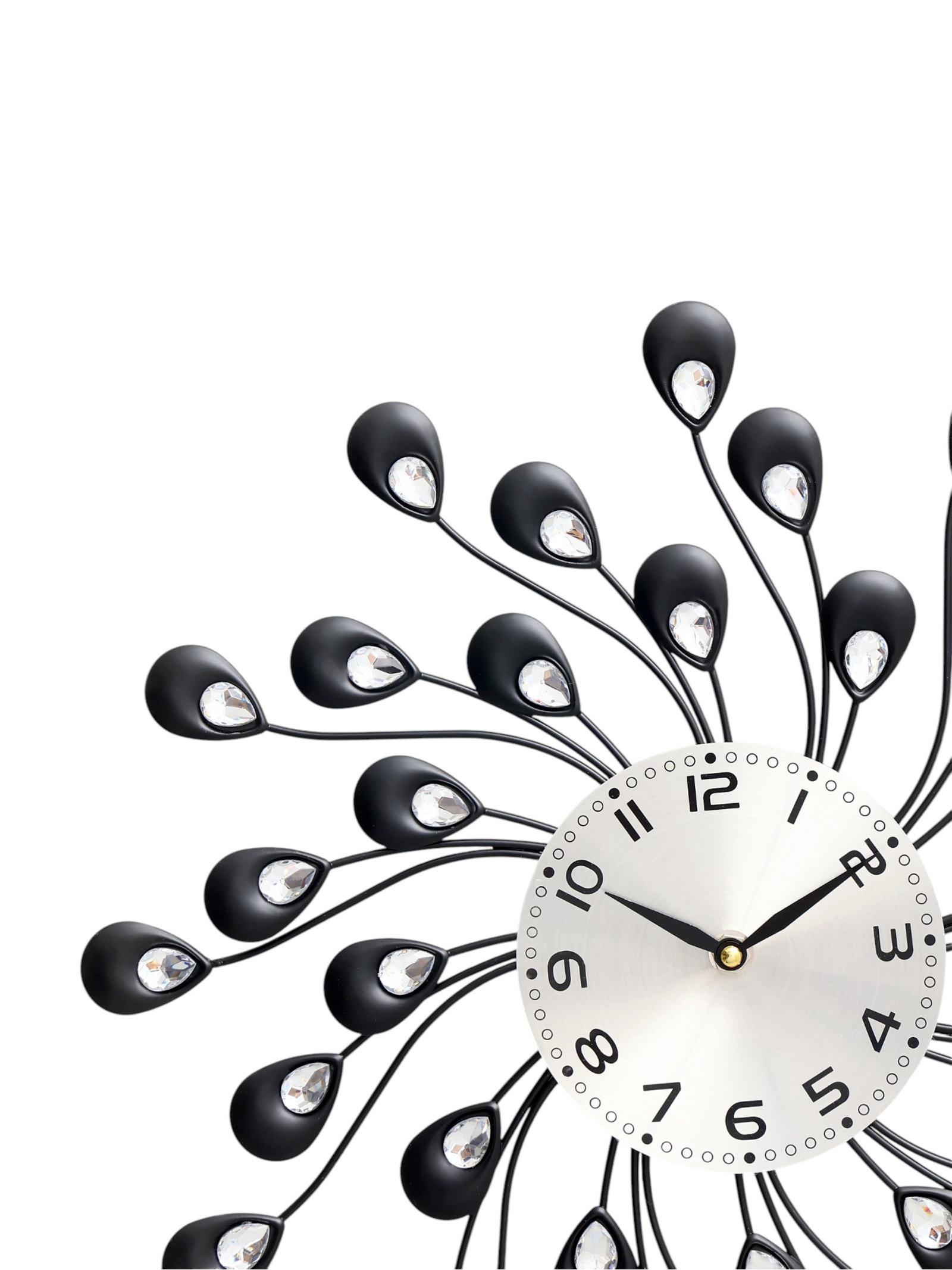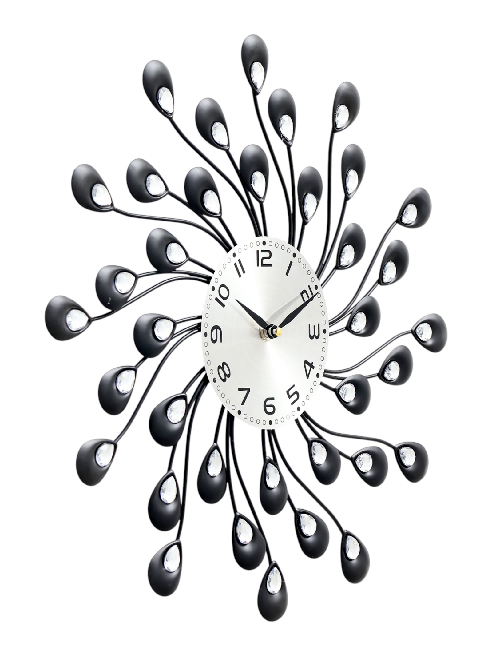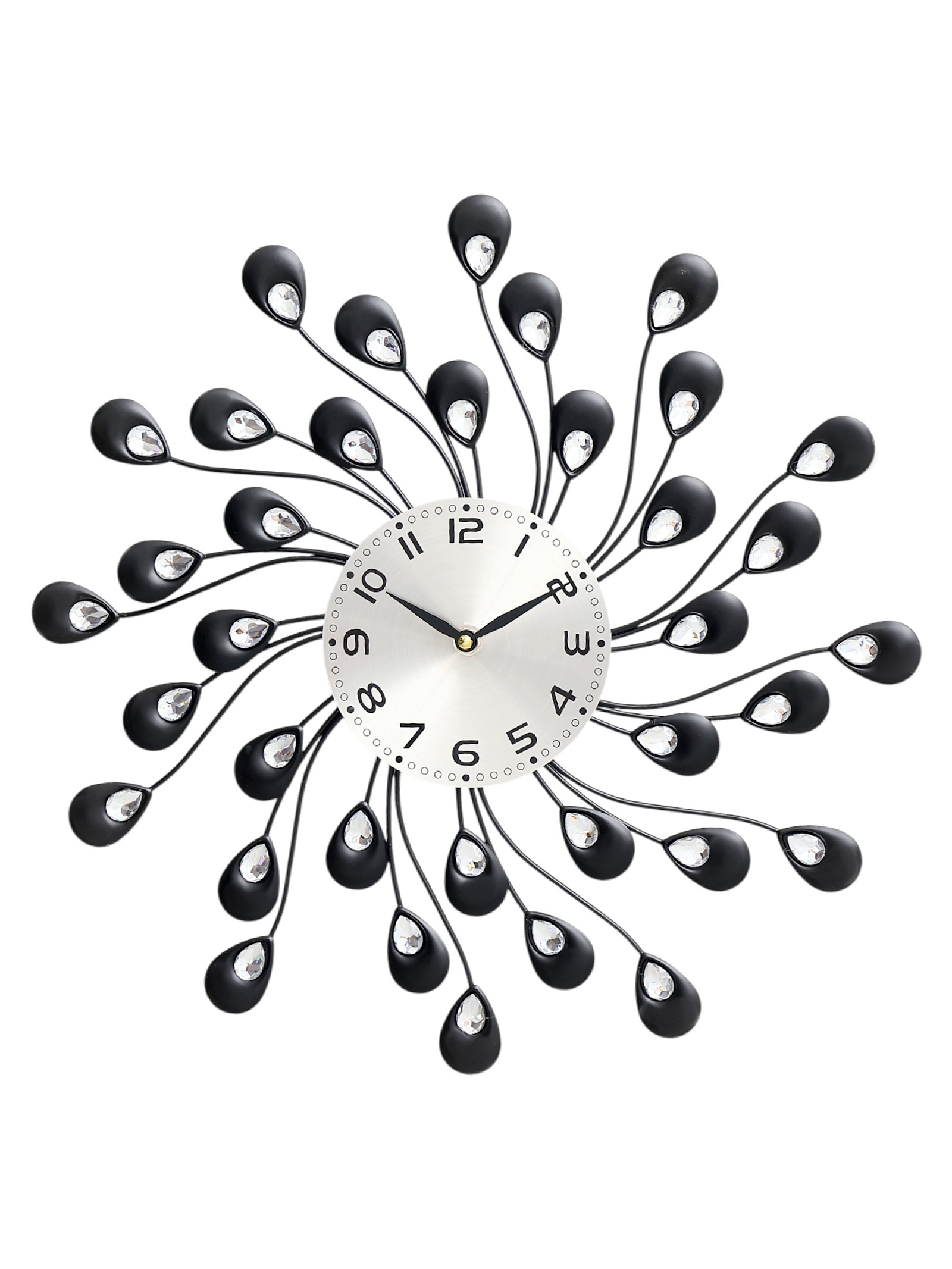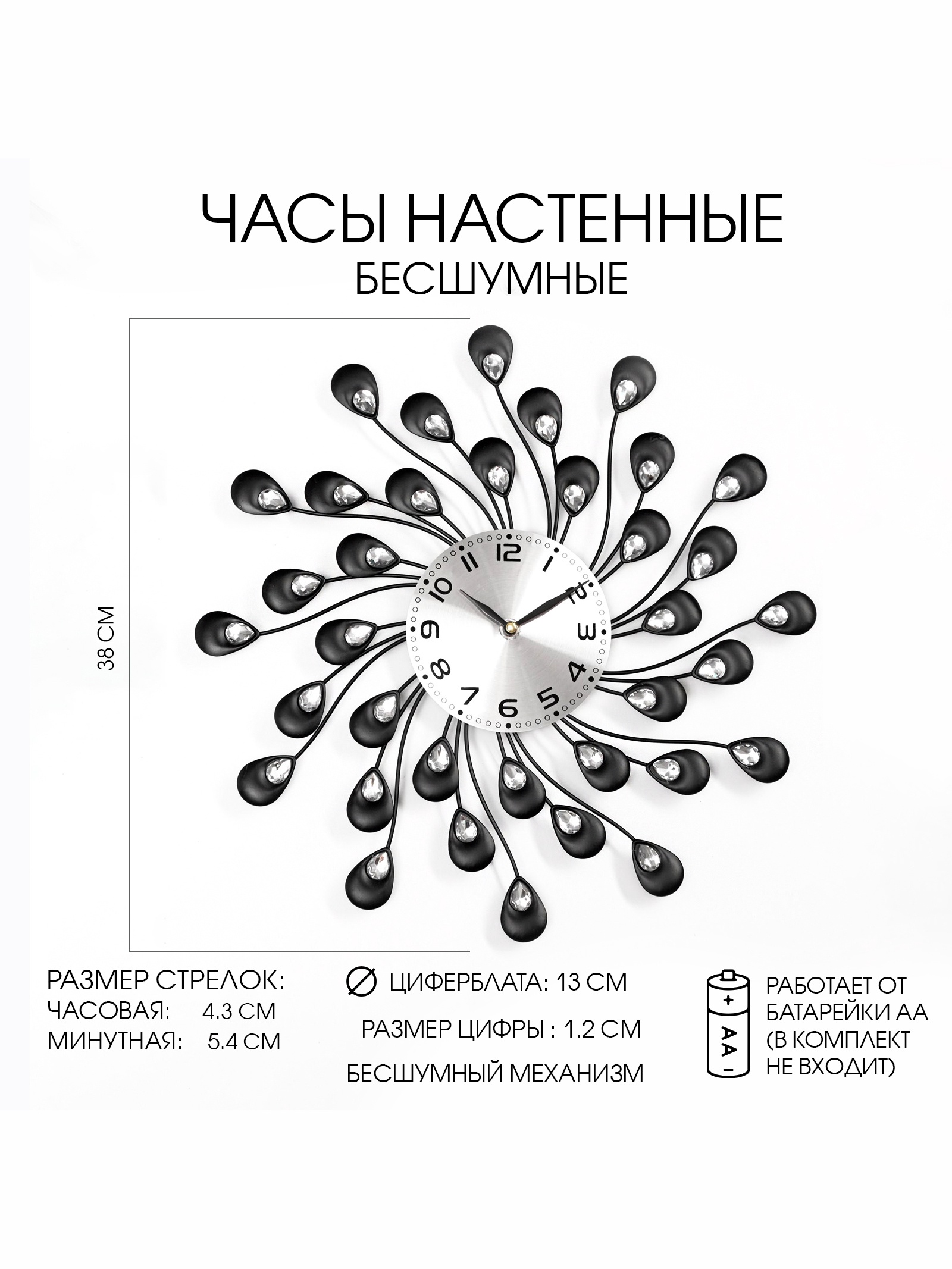 Часы настенные,серия: ажур,лепестки с кристалами, плавный ход, d-13 см, 38 х 38 см. Часы настенные интерьерные большие Чёрные лепестки – это стильный и элегантный аксессуар, который идеально подойдет для любого интерьера. Благодаря кварцевому механизму с плавным ходом, часы работают абсолютно бесшумно, создавая атмосферу спокойствия и комфорта в вашем доме. Большой размер часов позволяет им гармонично вписываться в просторные помещения. Современный и минималистичный дизайн часов делает их универсальным дополнением к различным стилям интерьера. Большие настенные часы станут великолепным дополнением любого интерьера. Они способны добавить изысканности и уникальности любой комнате, будь то гостиная, спальня, кухня, кабинет или даже прихожая. Такие часы могут послужить отличным подарком для близких людей или любимых на различные праздники, подчеркивая заботу и внимание дарителя. Плавный ход механизмаРаботают от батарейки типа АА (1 шт, в комплект не входит)Корпус часов выполнен из пластика.Тип питания:От батареек|Форма:Фигурная|Ширина, см:38|Высота, см:38|Диаметр циферблата, см:13|Тематика:Цветочно-растительная|Тип индикации:Арабские цифры|Тематика праздника:8 Марта|Тип механизма:Кварцевый|Цвет циферблата:Серебристый|Материал:Стекло|Материал:Металл|Работает от сети:Нет|Типоразмер батареек:AA (LR6)|Ход стрелок:Плавный|Цвет корпуса:Чёрный|Бесшумные:Да|Страна:Китай  развернуть описание ▼