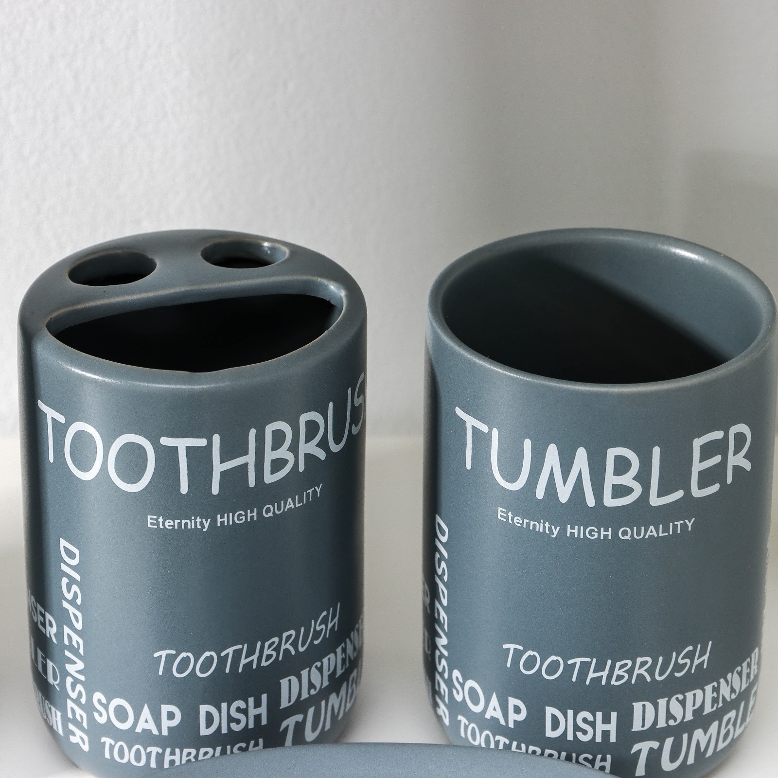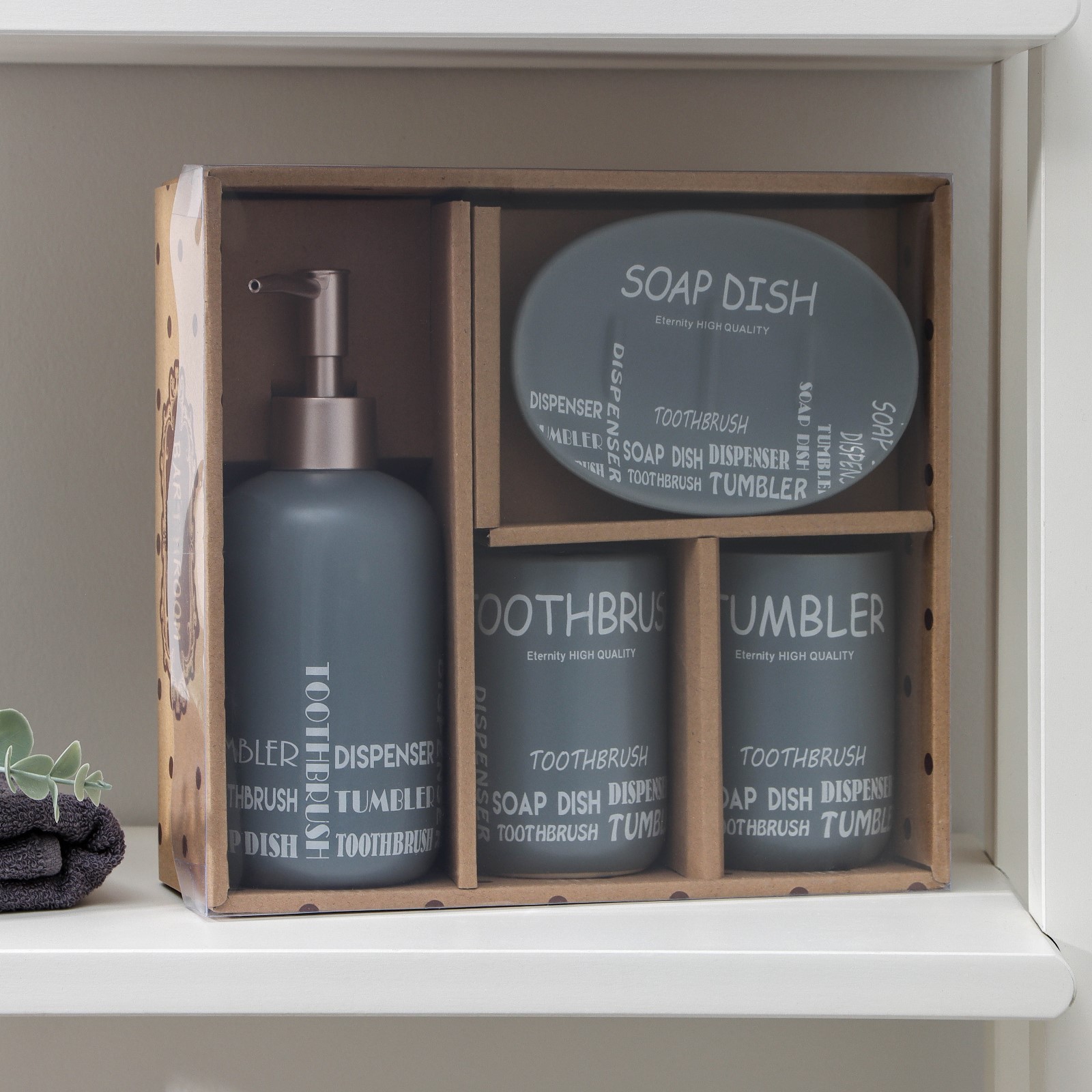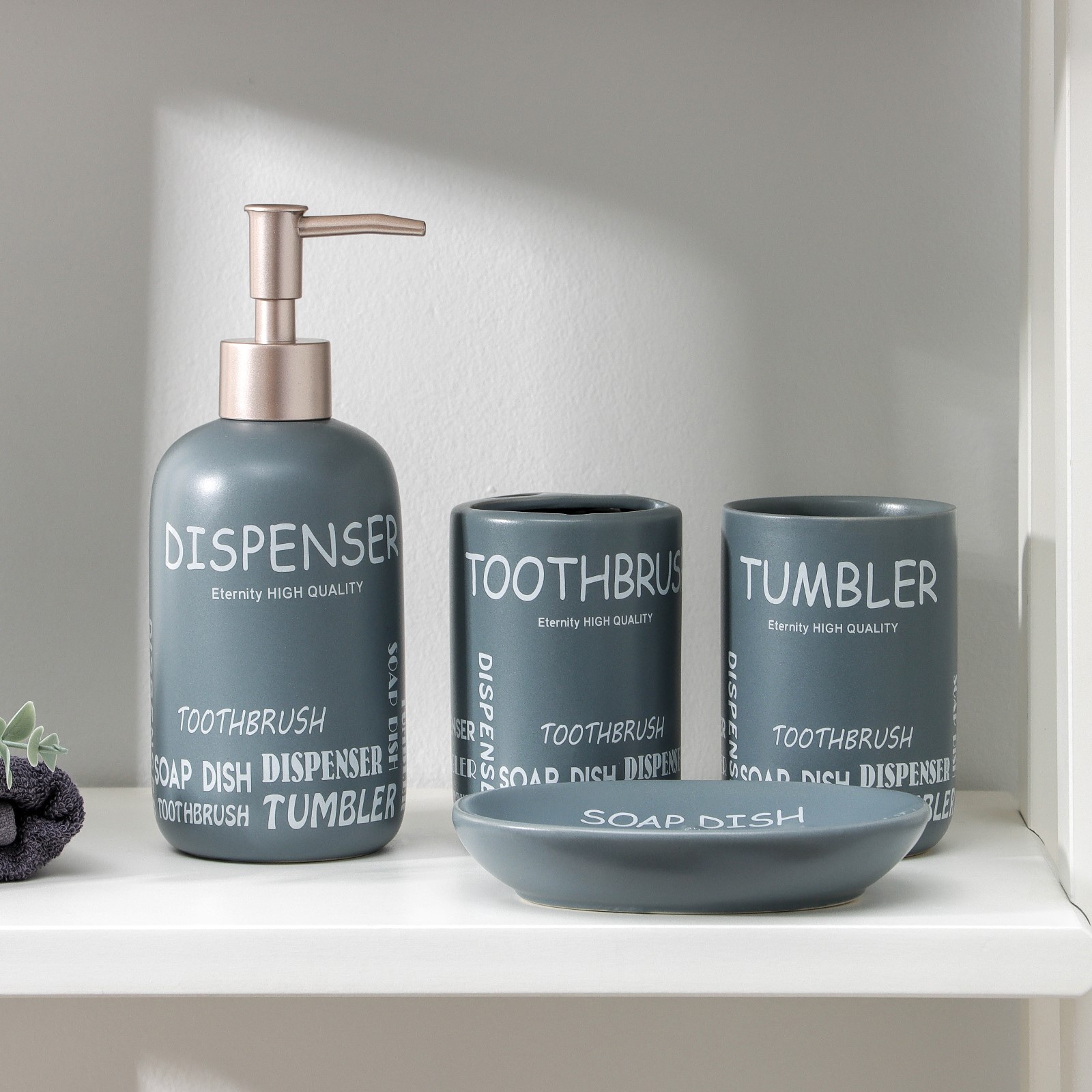 Набор аксессуаров для ванной комнаты «надписи», 4 предмета (дозатор 400 мл, мыльница, 2 стакана), цвет серый