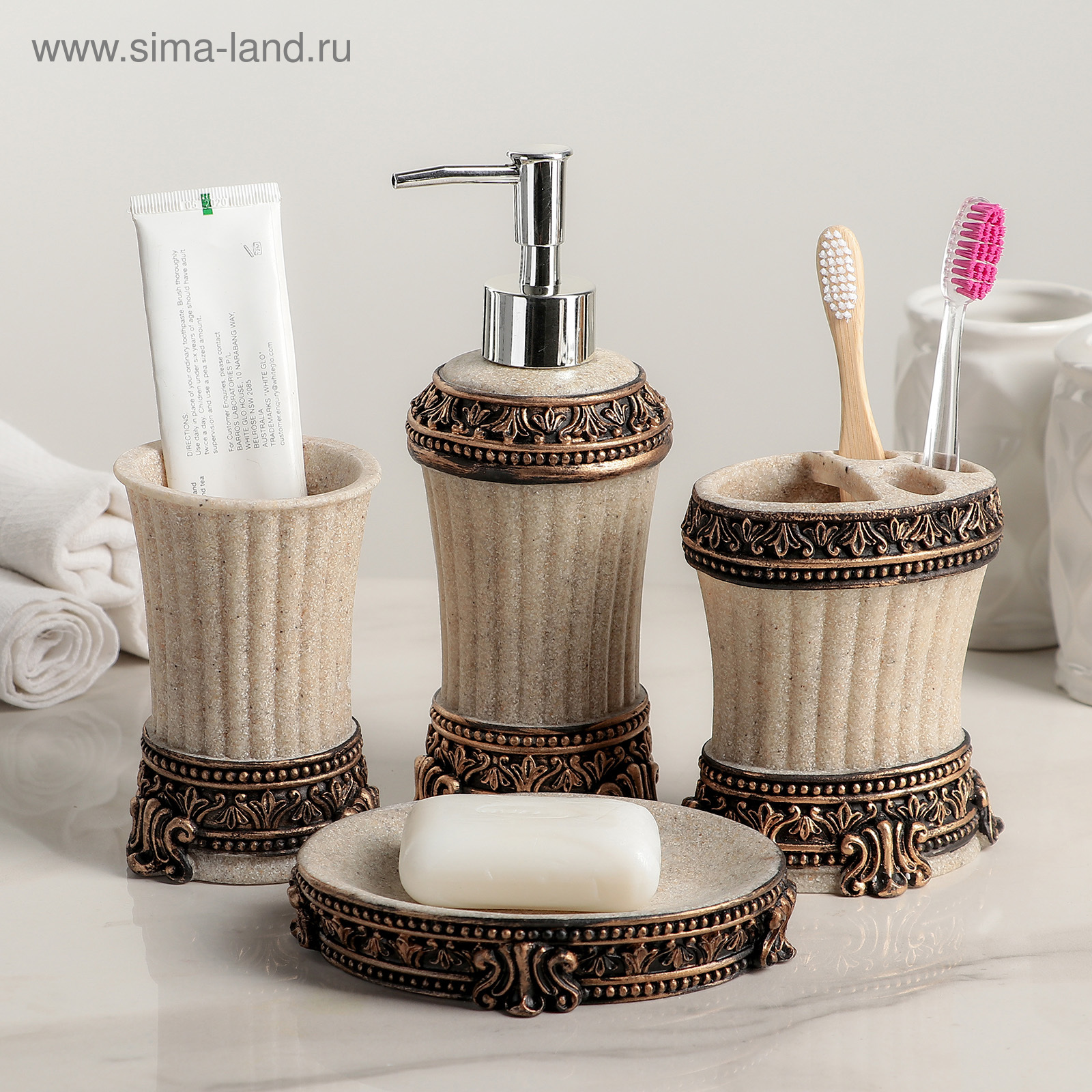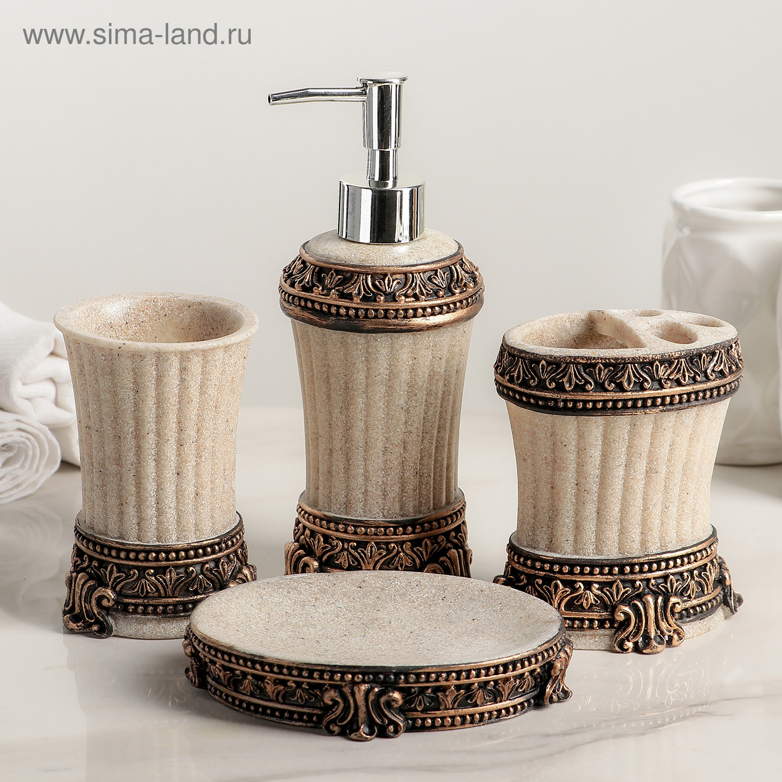 Набор аксессуаров для ванной комнаты «вензеля», 4 предмета (дозатор 200 мл, мыльница, 2 стакана), цвет бежевый