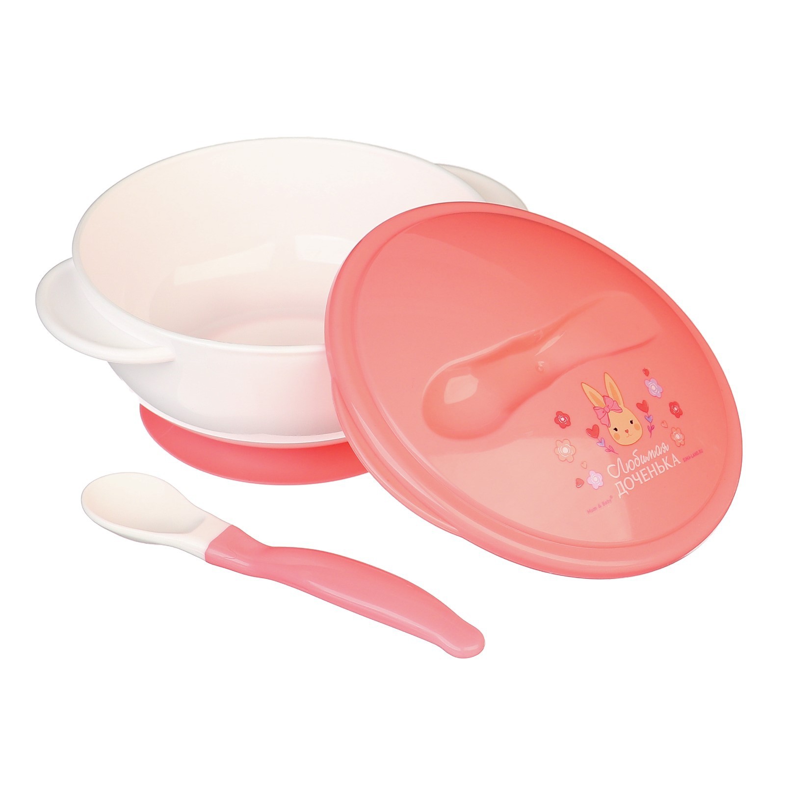 Набор детской посуды «доченька», 3 предмета: тарелка на присоске, крышка, ложка, цвет розовый
