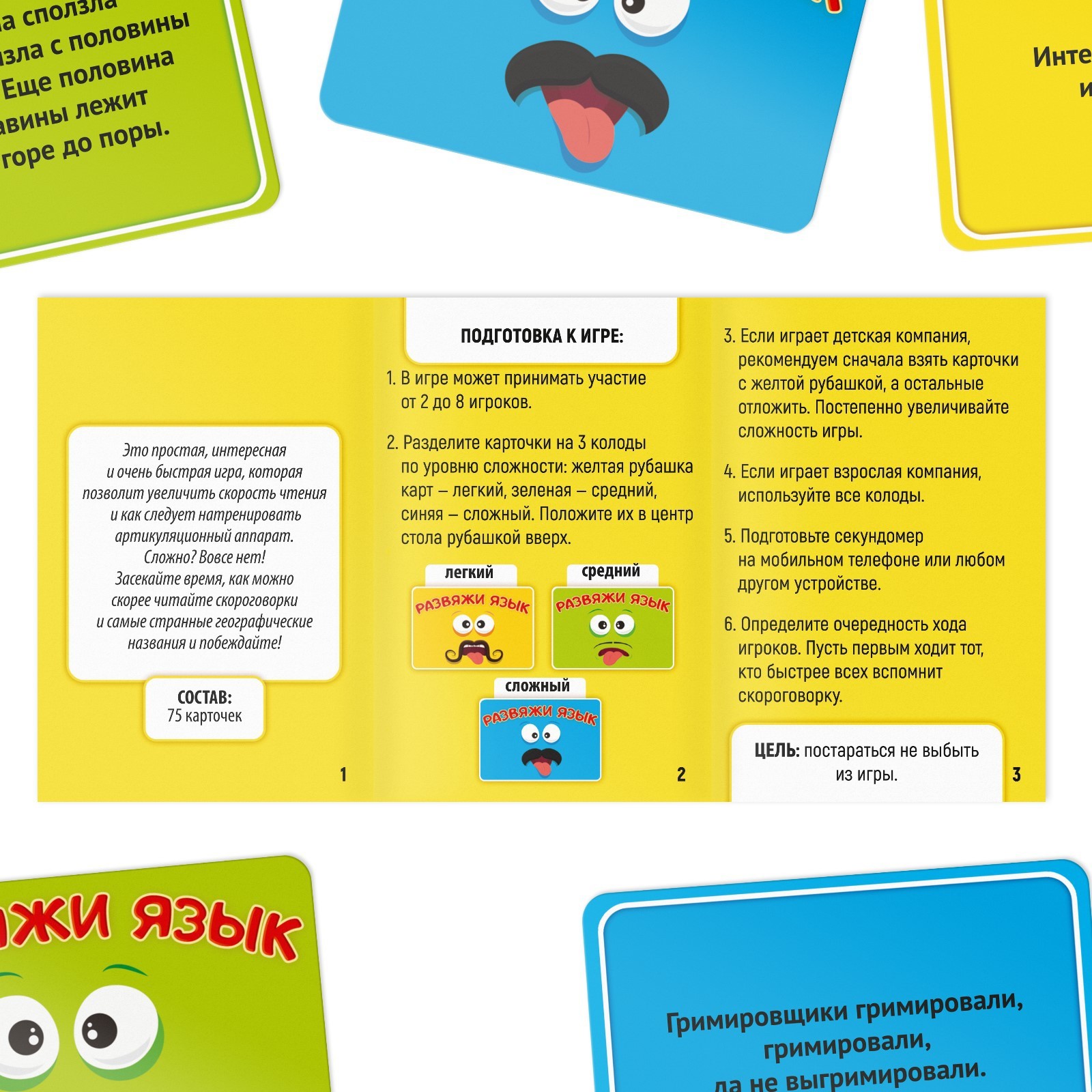 Настольная игра на скорость «развяжи язык», 75 карт, 14+. Засекайте время, читайте скороговорки Это простая и очень быстрая игра, которая поможет увеличить скорость чтения и натренировать артикуляцию. Засекайте время, как можно быстрее читайте сложные скороговорки и странные географические названия и побеждайте! Что нужно делатьx Задача участников в этой игре — как можно быстрее (но при этом чётко и без запинки) прочитать вслух написанное на карте слово или скороговорку. На всё это даётся ровно 30 секунд, не больше! Как только игрок прочитал, он кладёт карточку на стол перед собой рубашкой вниз, и сразу ходит следующий участник. Он также тянет карту и быстро зачитывает слово или скороговорку. И так продолжается, пока время не закончится. Участник, в чей ход кончилось время, собирает все карты этого раунда и кладёт их перед собой — это его штрафная колода. Что делать со штрафными картамиx Хранить их у себя. С каждым раундом карты нужно складывать в разные стопки. А тот, кто наберёт 3 стопки, выбывает из игры. Победит тот, кто останется в игре последним! Внутри вы найдёте: 75 карточек,правила игры.Язык до Киева доведёт! Возраст:От 14 лет|Количество игроков:От 2 игроков|Время игры:20 минут|Жанр игры:Семейная|Жанр игры:Коммуникативная|Количество игроков:2 - 8|Страна:Китай  развернуть описание ▼