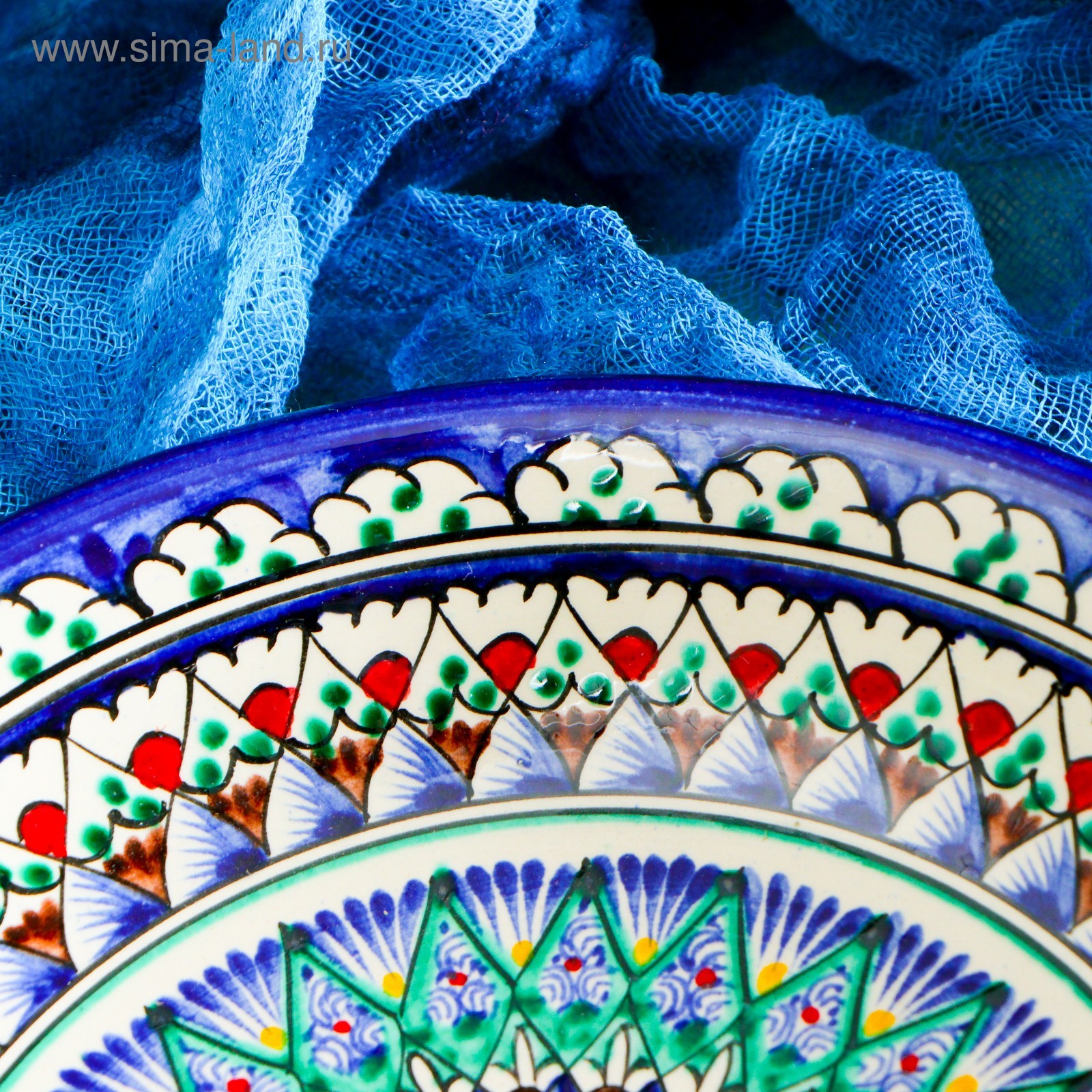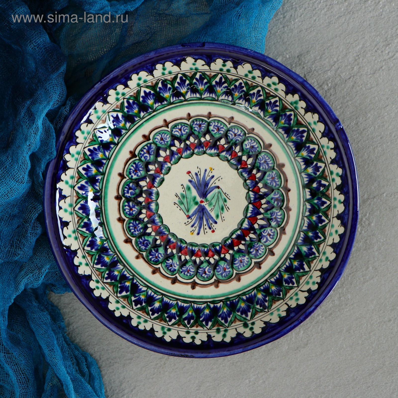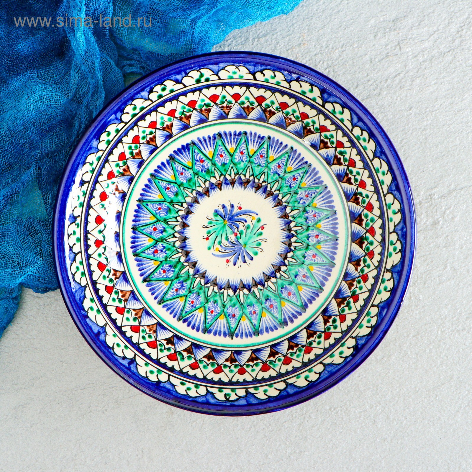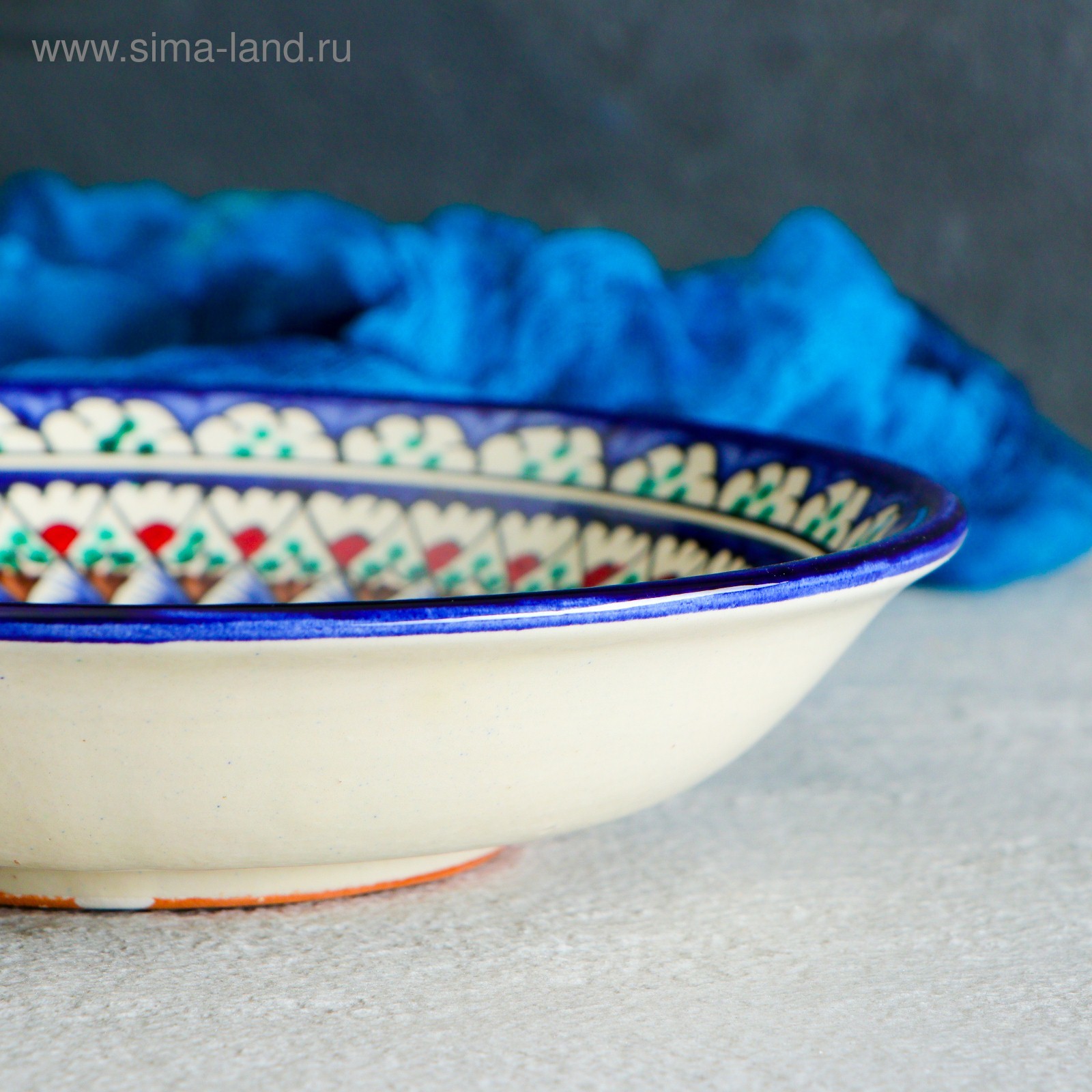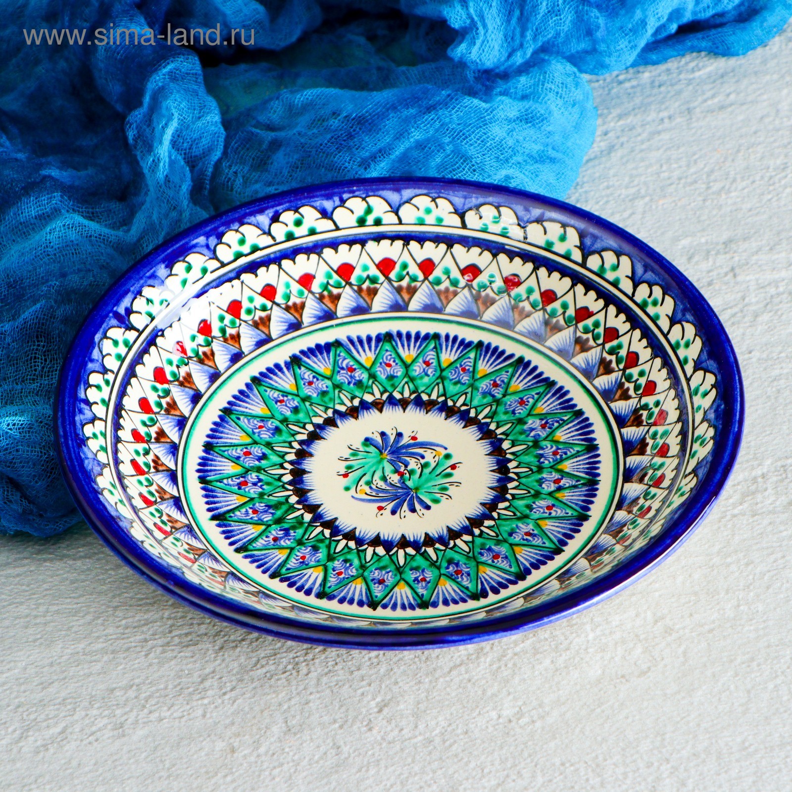 Тарелка риштанская керамика "узоры", синяя, глубокая, 20 см