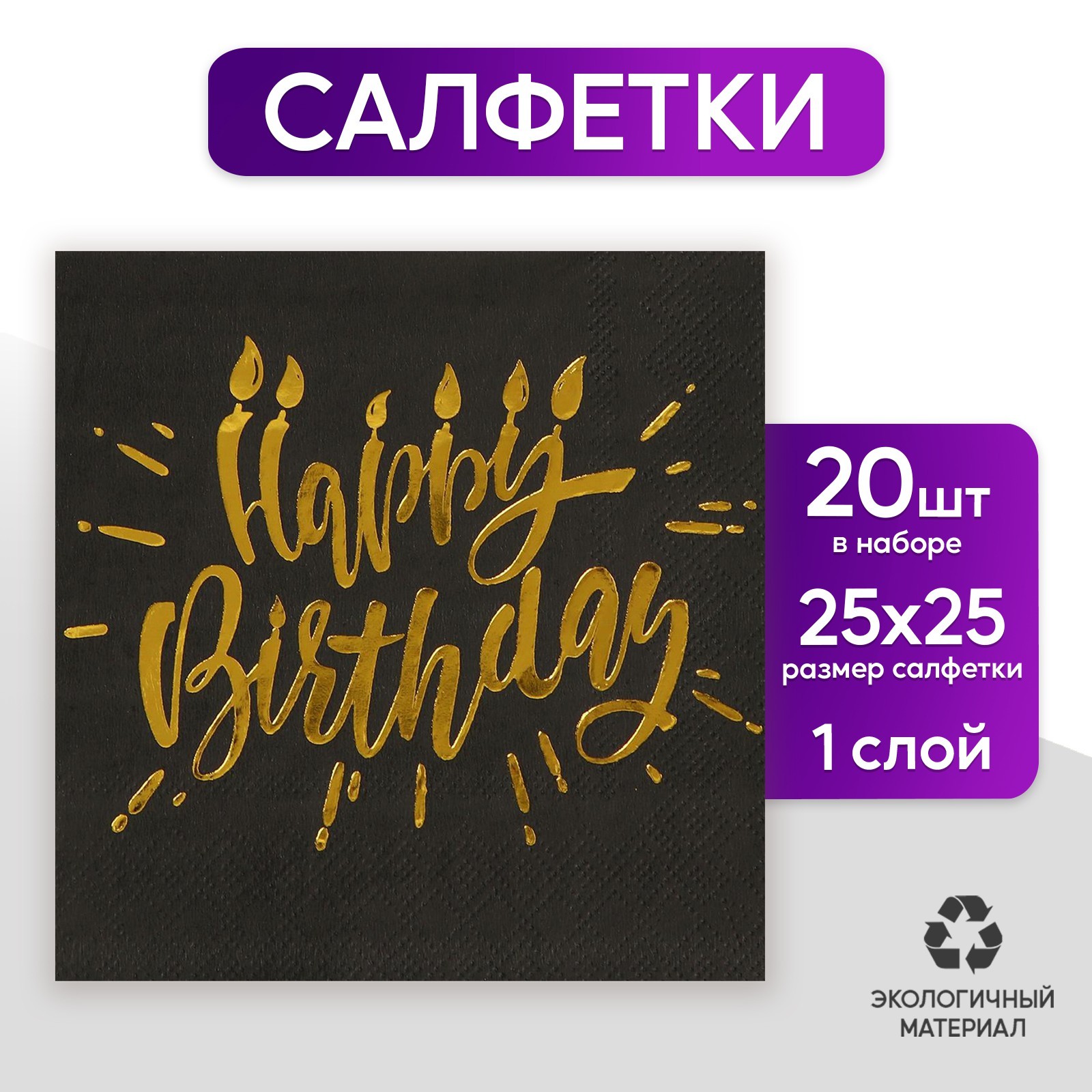 Салфетки бумажные Happy Birthday, 25х25см, 20 шт., золотое тиснение, на чёрном фоне