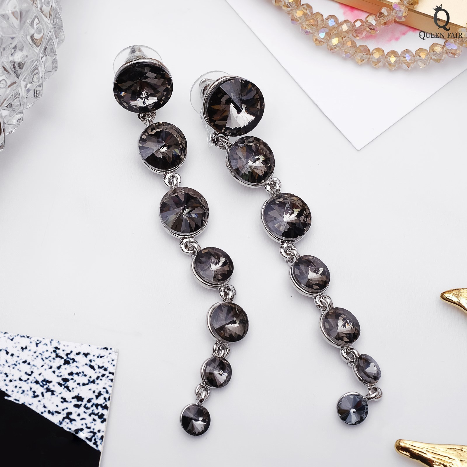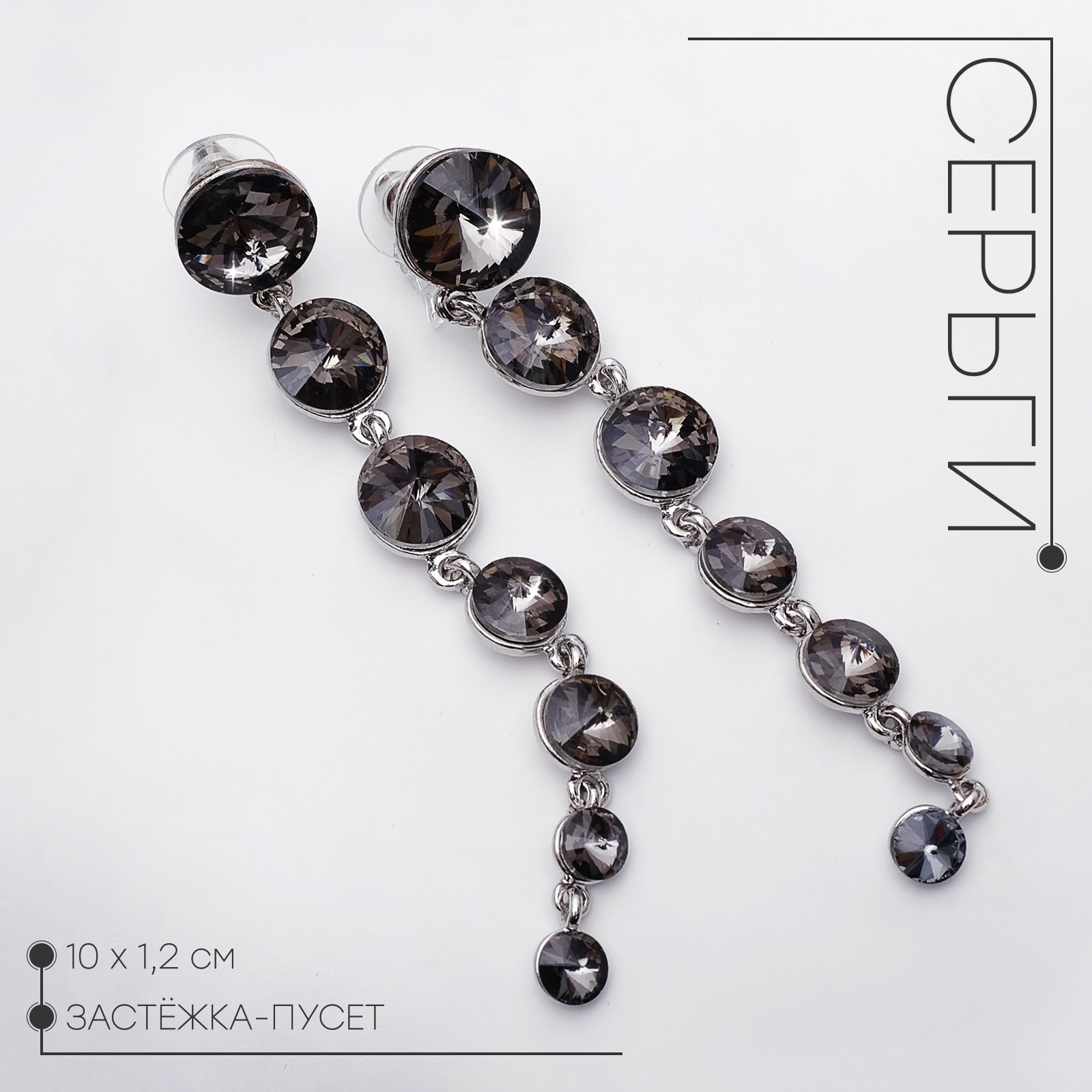 Серьги висячие со стразами «роскошь» дорожка с кругами, цвет серый в серебре,10 см. Эти висячие серьги длиной 10 см создают впечатление лёгкости и изящества благодаря сочетанию серебристой металлической основы и серых стеклянных страз, аккуратно выложенных в виде дорожки с кругами. Такой дизайн привлекает внимание своей оригинальностью и глубиной оттенков, подчёркивая утончённый вкус и индивидуальность обладательницы. Особенности и преимущества Металлическая основа с серебристым покрытием: гарантирует прочность и долговечность украшения, сохраняя его первоначальный блеск и форму.Декор из серых стеклянных страз: придаёт серьгам благородное сияние и универсальность, позволяя гармонично сочетать их с разными стилями и оттенками одежды.Висячий дизайн длиной 10 см: визуально удлиняет линию шеи, добавляя образу лёгкость и элегантность.Замок-пусет (гвоздик): обеспечивает надёжную фиксацию и комфорт при ношении, предотвращая случайное выпадение.Идеальный подарок: украшение подходит для любого праздника — 8 Марта, День рождения или Новый год, и станет прекрасным знаком внимания для мамы, сестры, дочери или подруги.Эти серьги — гармоничное сочетание стиля и качества, которое поможет создать выразительный образ и подчеркнуть вашу индивидуальность в любой ситуации. Набор:Нет|Цвет:Серый|Для кого:Для женщины|Длина, см:10|Тематика праздника:Новый год|Тематика праздника:8 Марта|Тематика праздника:День рождения|Тематика праздника:Универсальная тематика|Адресат:Дочке|Адресат:Подруге|Адресат:Сестре|Адресат:Маме|Материал:Стразы|Цвет фурнитуры:Серебряный|Вставка/Подвеска:Стекло|Материал основания:Металл|Вид застёжки:Застёжка пусет (гвоздик)|Составляющие набора:Серьги|Материал основы:Металл|Возраст:Для взрослых|Тематика:Кристаллы|Висячие:Да|Страна:Китай  развернуть описание ▼