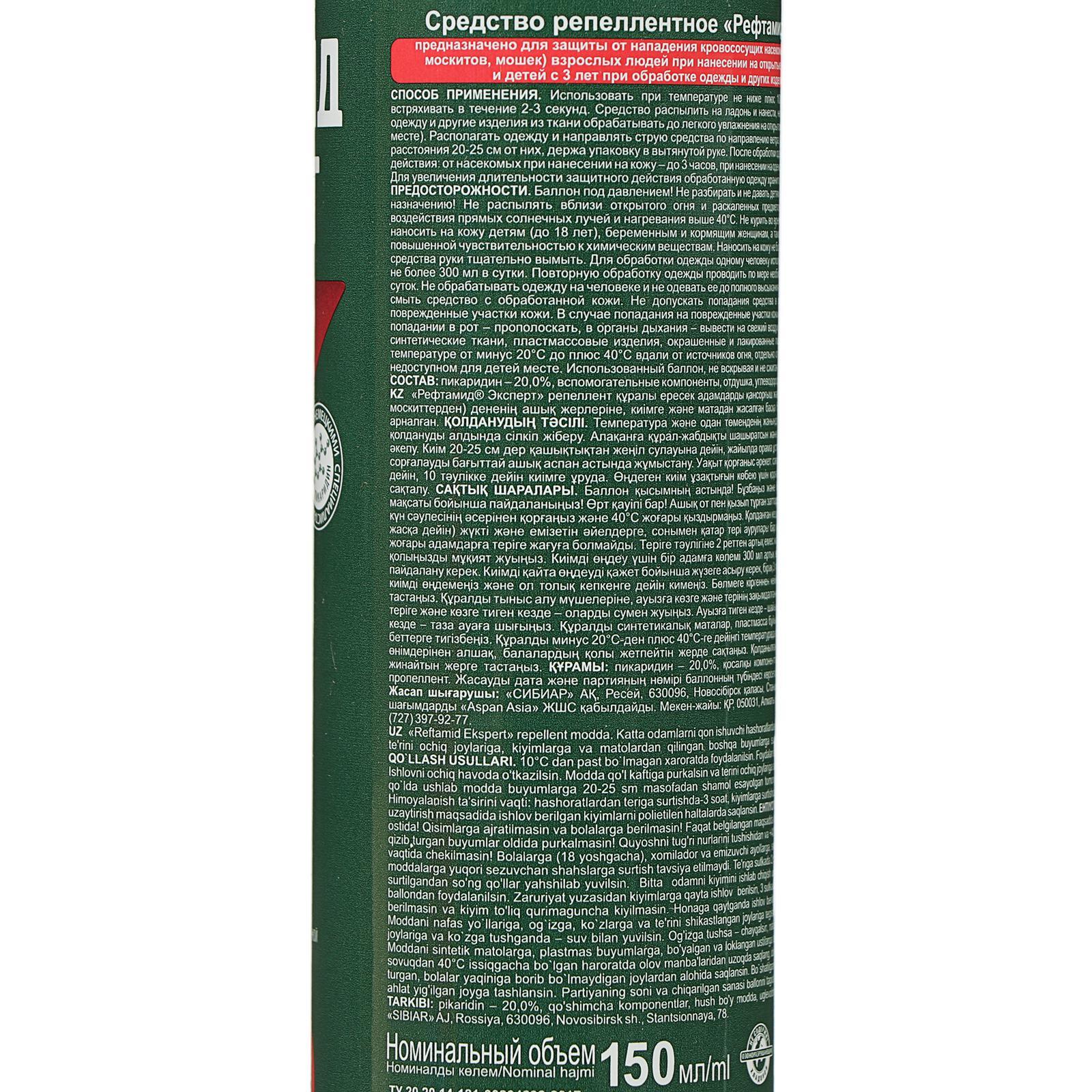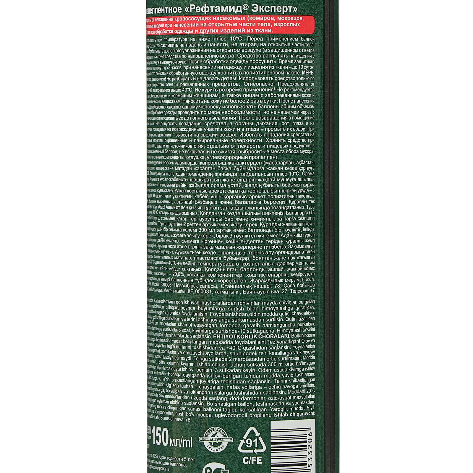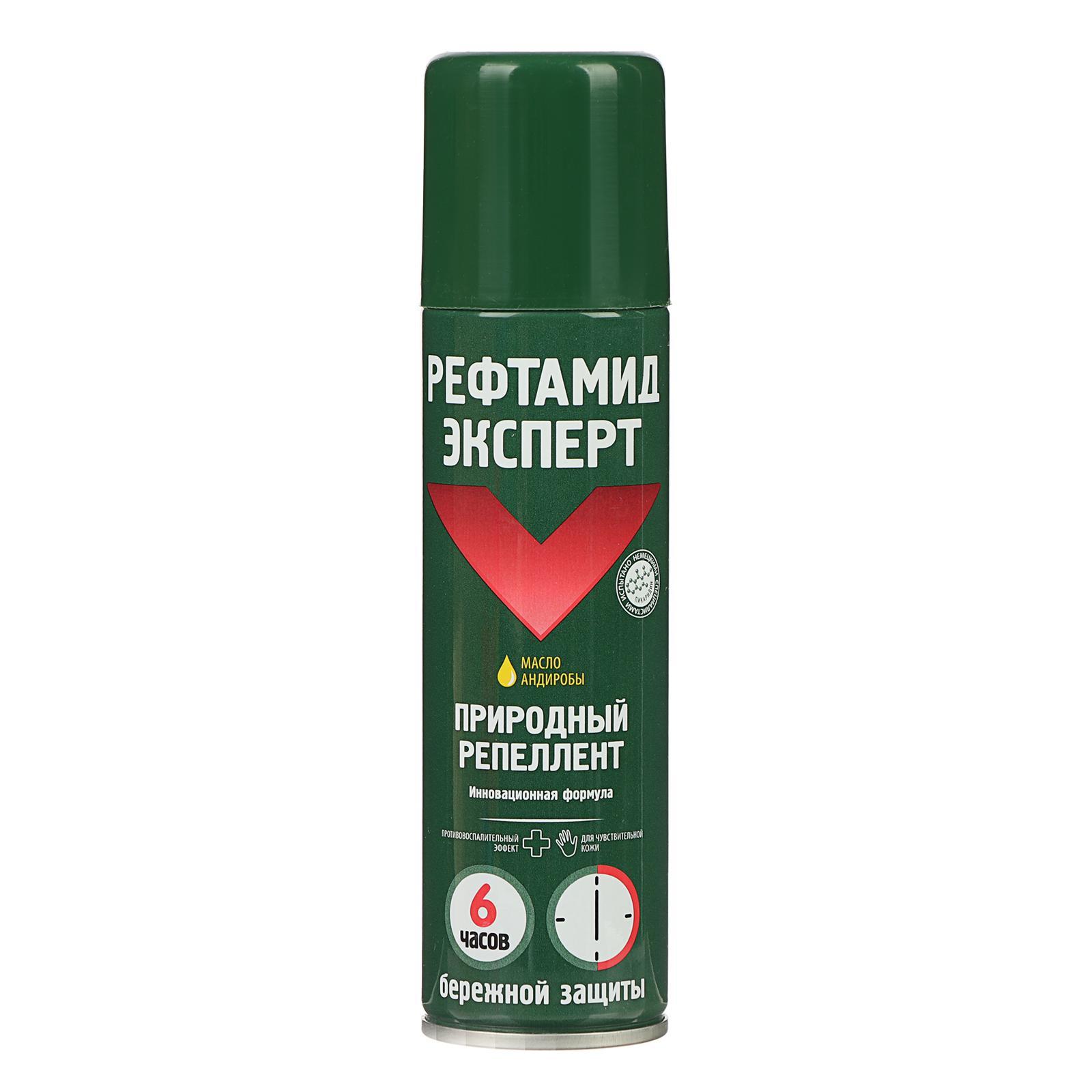 Аэрозоль репеллентный от комаров "рефтамид" эксперт, для чувствительной кожи, 150 мл. Рефтамид обеспечивает надёжную защиту от комаров и других кровососущих насекомых. Содержит высокоэффективный действующий компонент, сохраняет своё действие в течении 4 часов. Средство наносится на одежду и открытые части тела. Надежно защищает от комаров и работает в любой местности. Состав: Пикаридин - 20, 0%, вспомогательные компоненты, отдушка, углеводородный пропеллент Вид средства: Аэрозоль Назначение: От комаров Тип средства: Репеллент  развернуть описание ▼