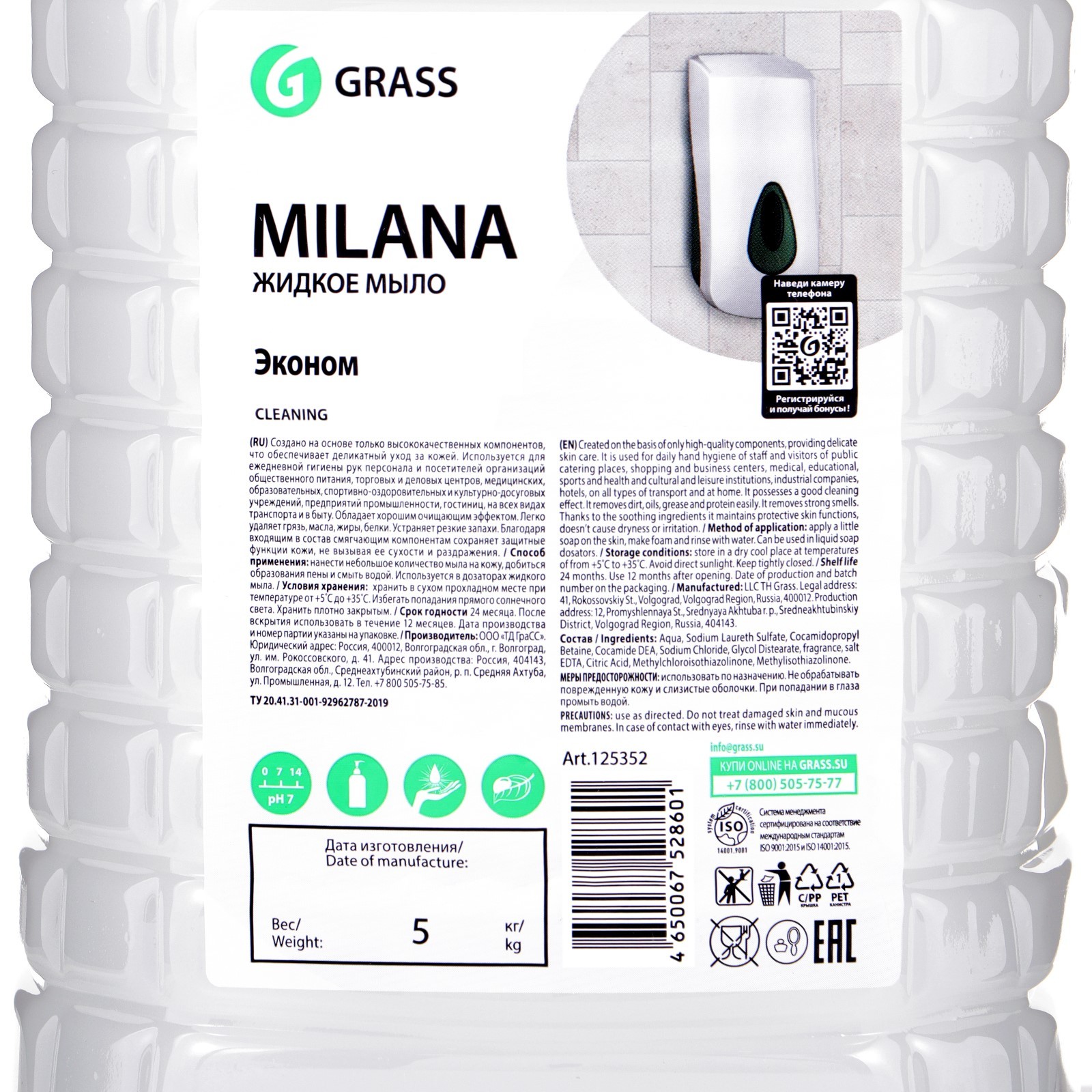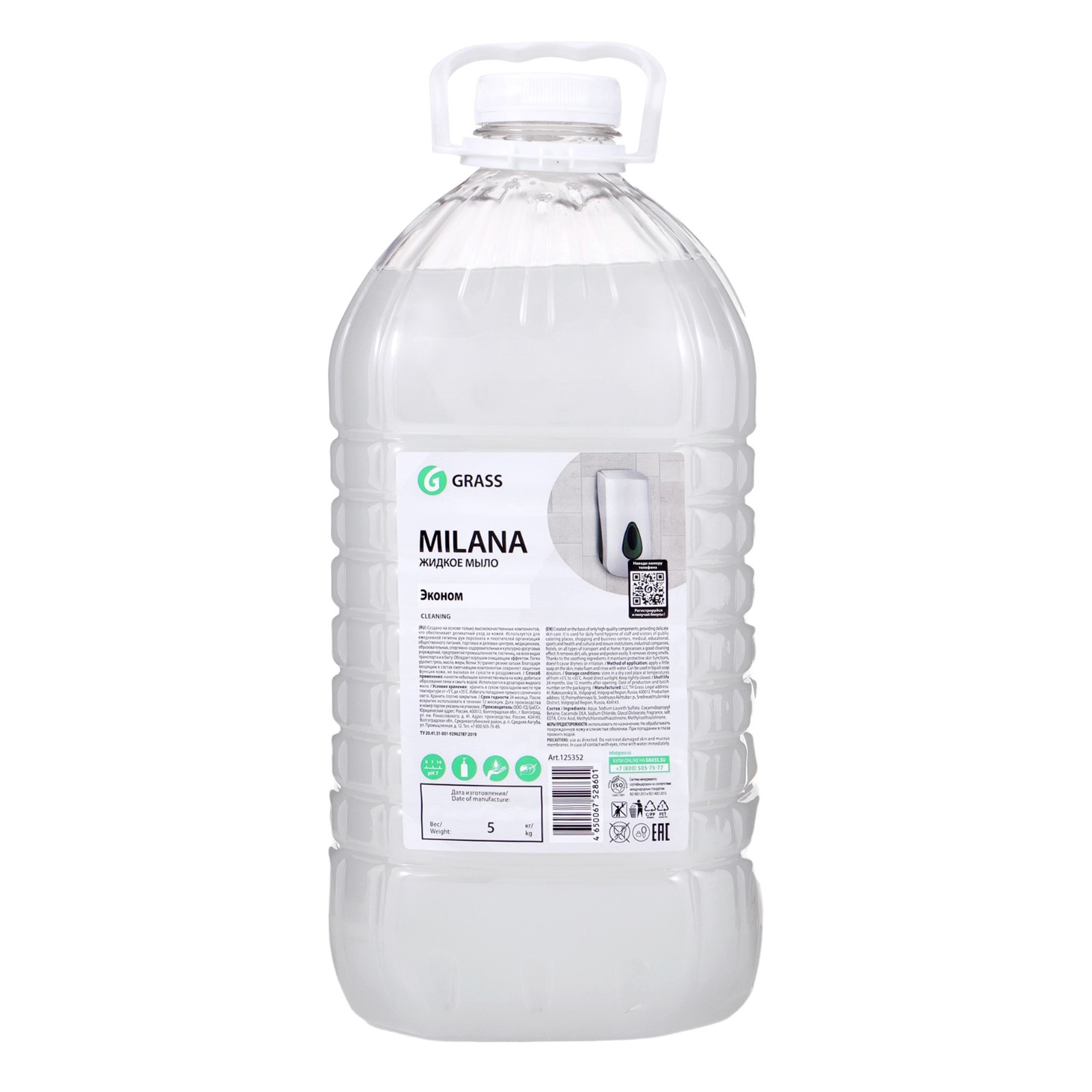 Жидкое мыло grass milana "эконом", 5 л. Используется для ежедневной гигиены рук персонала и посетителей организаций общественного питания, торговых и деловых центров, медицинских, образовательных, спортивно-оздоровительных и культурно-досуговых учреждений, предприятий промышленности, гостиниц, на всех видах транспорта и в быту. Обладает хорошим очищающим эффектом. Легко удаляет грязь, масла, жиры, белки. Устраняет резкие запахи. Благодаря входящим в состав смягчающим компонентам, сохраняет защитные функции кожи, не вызывая ее сухости и раздражения. Состав: Aqua, Sodium Laureth Sulfate, Cocamidopropyl Betaine, Cocamide DEA, Sodium Chloride, fragrance, salt EDTA, Citric Acid, Methylchloroisothiazolinone, Methylisothiazolinone. Способ применения: нанести небольшое количество мыла на кожу, добиться образования пены и смыть водой. Используется в дозаторах жидкого мыла. Цвет: Белый Вес, г/Объём, мл: 5000 Аромат: Без аромата Тип: Жидкое Вид мыла: Туалетное : 0 Товар 18+: Нет  развернуть описание ▼