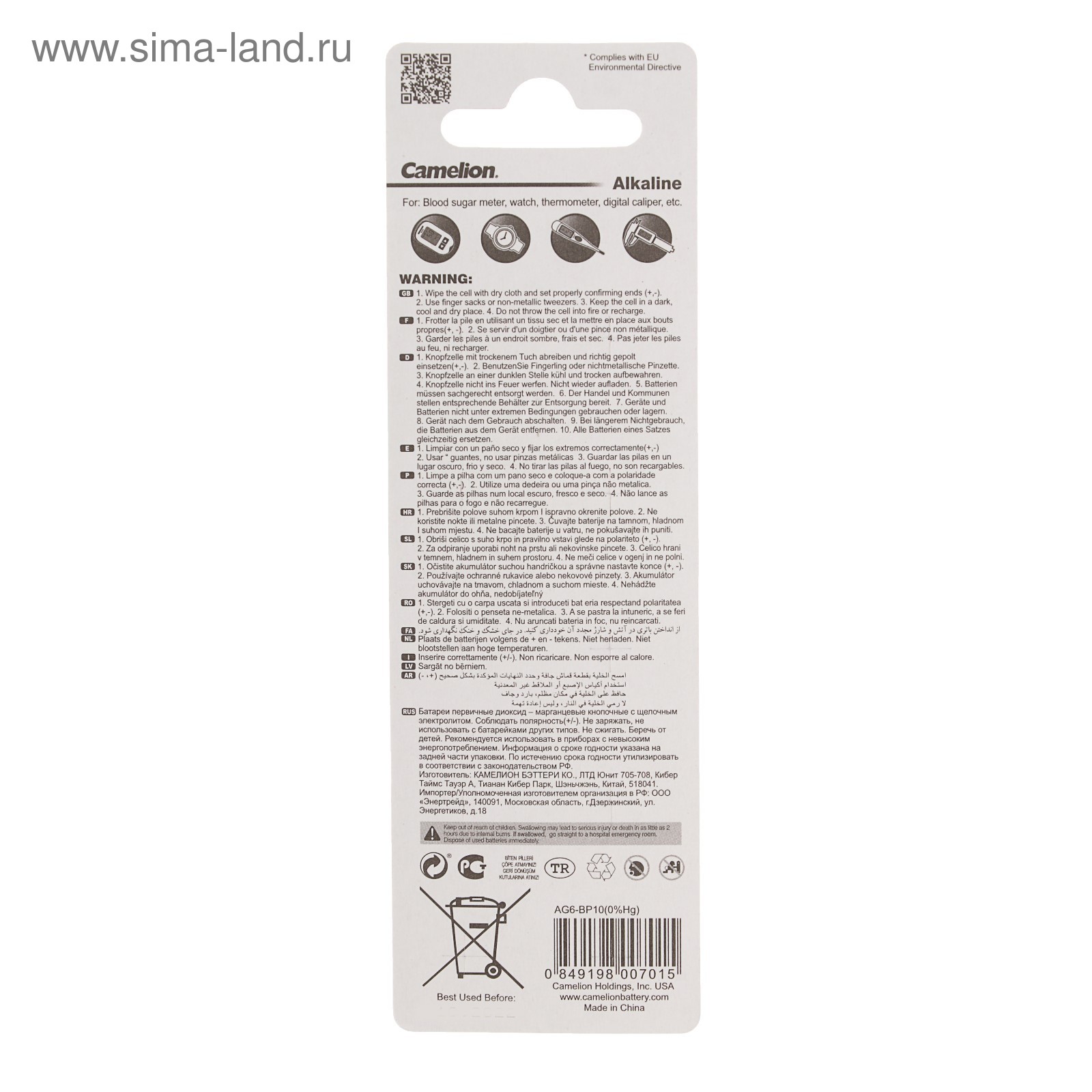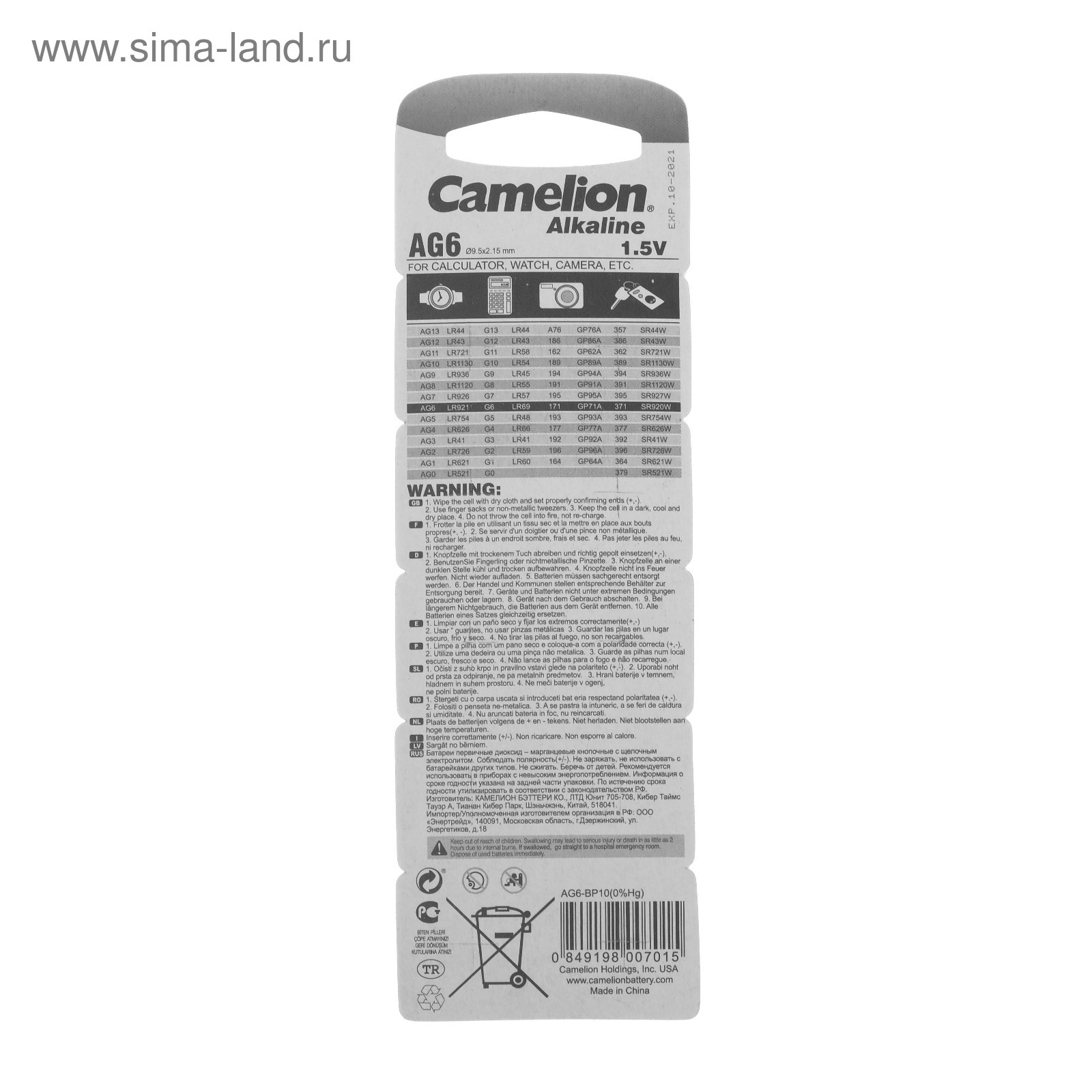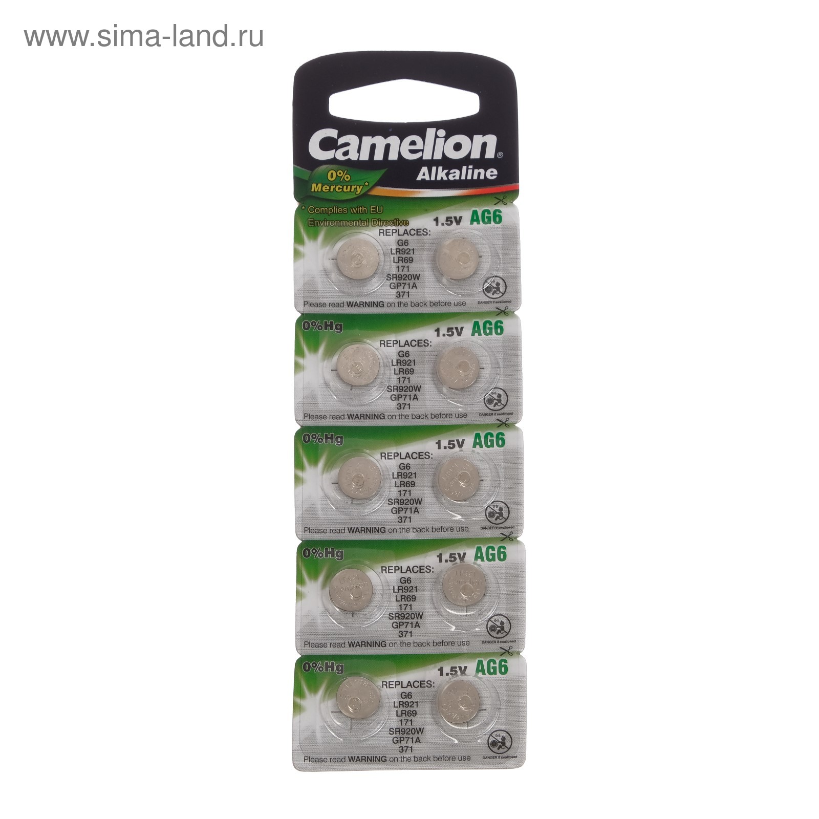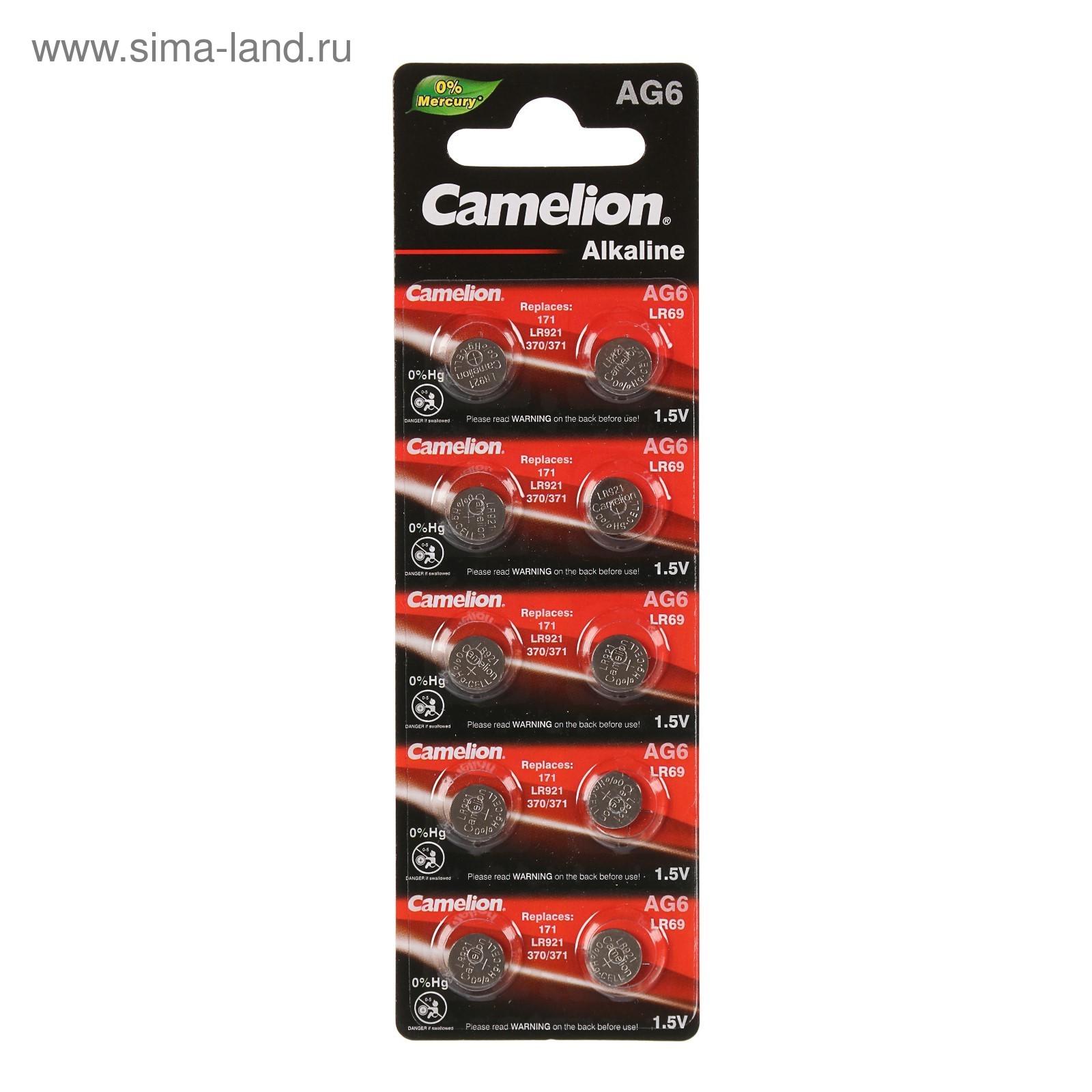 Батарейка алкалиновая camelion mercury free, ag6 (371, lr921)-10bl, 1.5в, блистер, 10 шт.. Кнопочные батарейки классифицируют по высоте, диаметру, напряжению, ёмкости, химическому составу. Перед покупкой посмотрите наименование вашего элемента питания или требования от производителя к прибору и следуйте рекомендациям ниже, чтобы приобрести аналогичную батарейку. Первые две буквы в маркировке обозначают тип элемента. CR — литиевая батарейка, напряжение 3 В. LR — щелочная, 1, 5 В. SR — серебряно-цинковая, 1, 55 В. PR — воздушно-цинковая, 1, 4 В. После букв следуют три или четыре цифры, которые указывают на размеры изделия. Первая часть (одна или две цифры) характеризует диаметр в миллиметрах, а вторая — высоту в 1/10 мм. Значения округляются до целой части. Например: CR2016 — литиевый элемент, диаметр 20 мм, высота 1, 6 мм;LR621 — щелочной, диаметр 6, 8 мм, высота 2, 15 мм. Держите кнопочные батарейки подальше от маленьких детей! parts count: 0 В упаковке, шт.: 10 Вид упаковки: Блистер Типоразмер батареек: AG6 Тип батарейки: Алкалиновая  развернуть описание ▼
