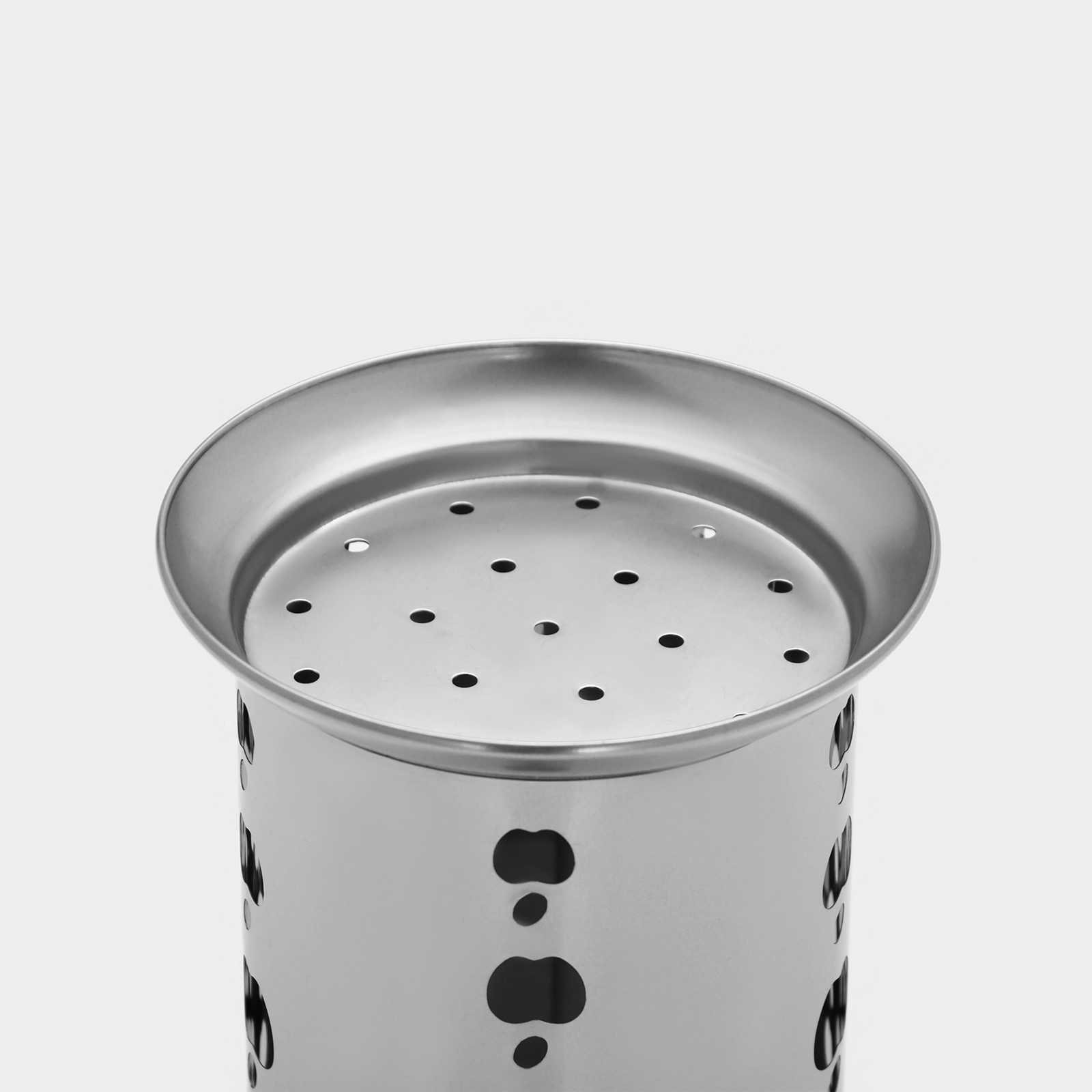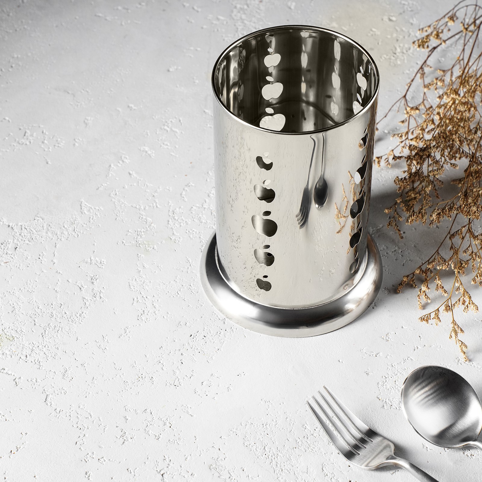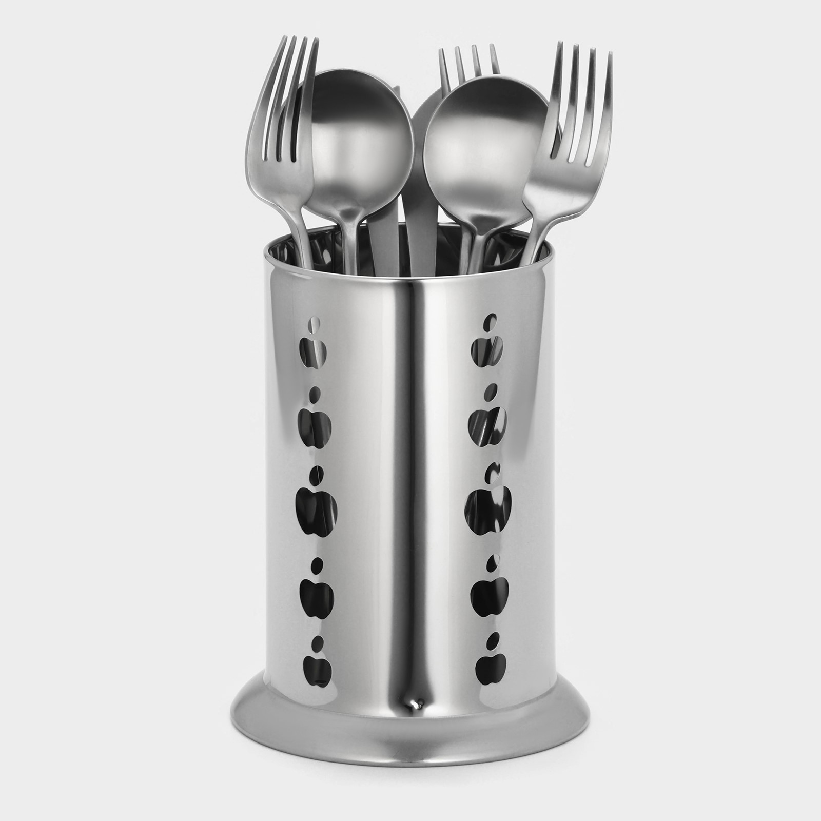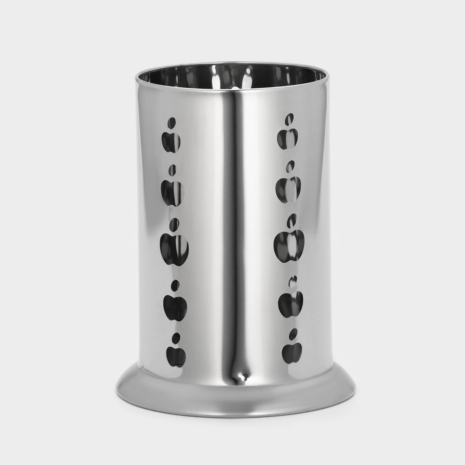Подставка из нержавеющей стали для столовых приборов «яблочко», 10x17 см. Подставка для столовых приборов имеет небольшие отверстия для отвода лишней влаги. Подходит для ложек, вилок, ножей и других предметов кухонной утвари. Цвет: Хромированный parts count: 0 tnved: 7323930000 Материал: Нержавеющая сталь С поддоном: Нет  развернуть описание ▼