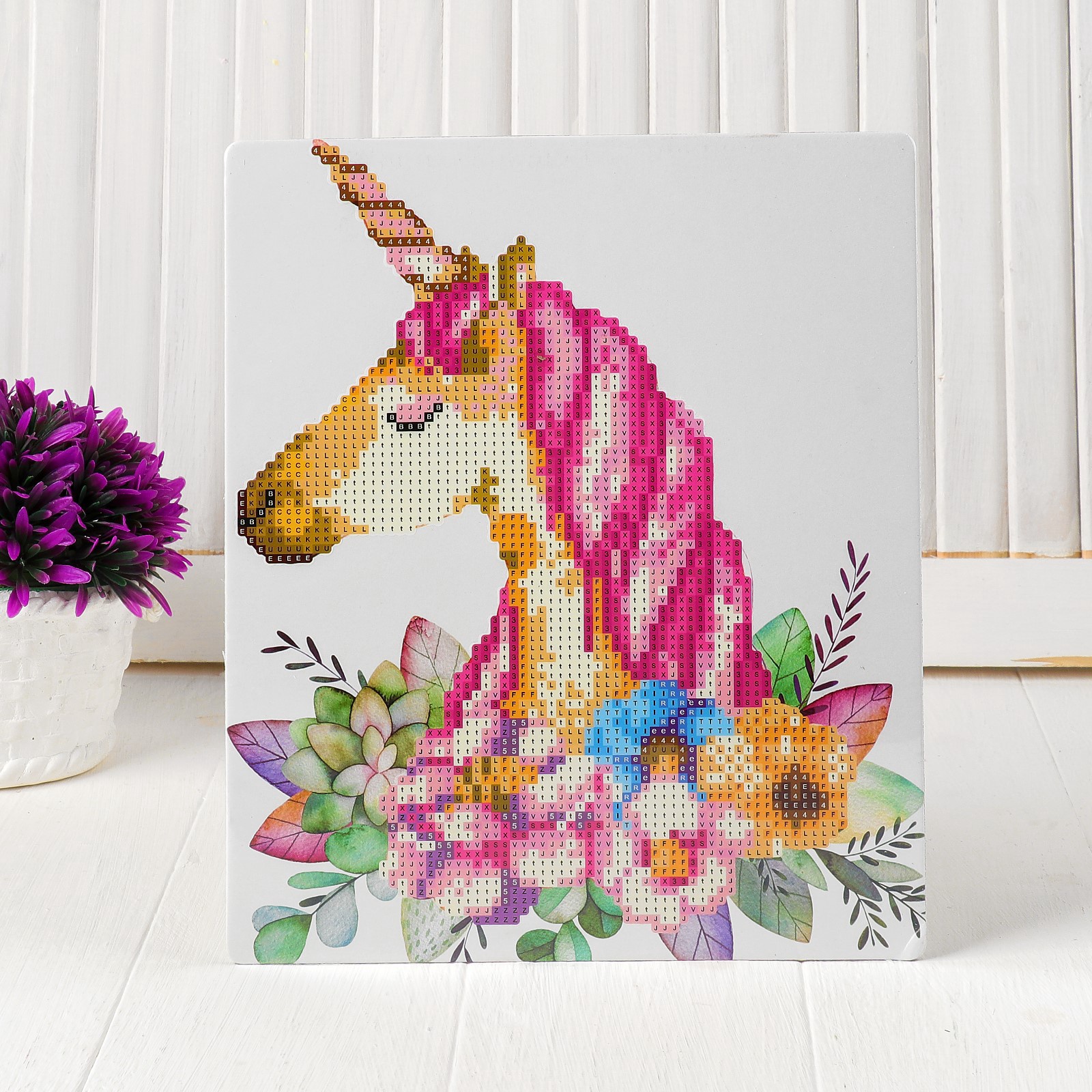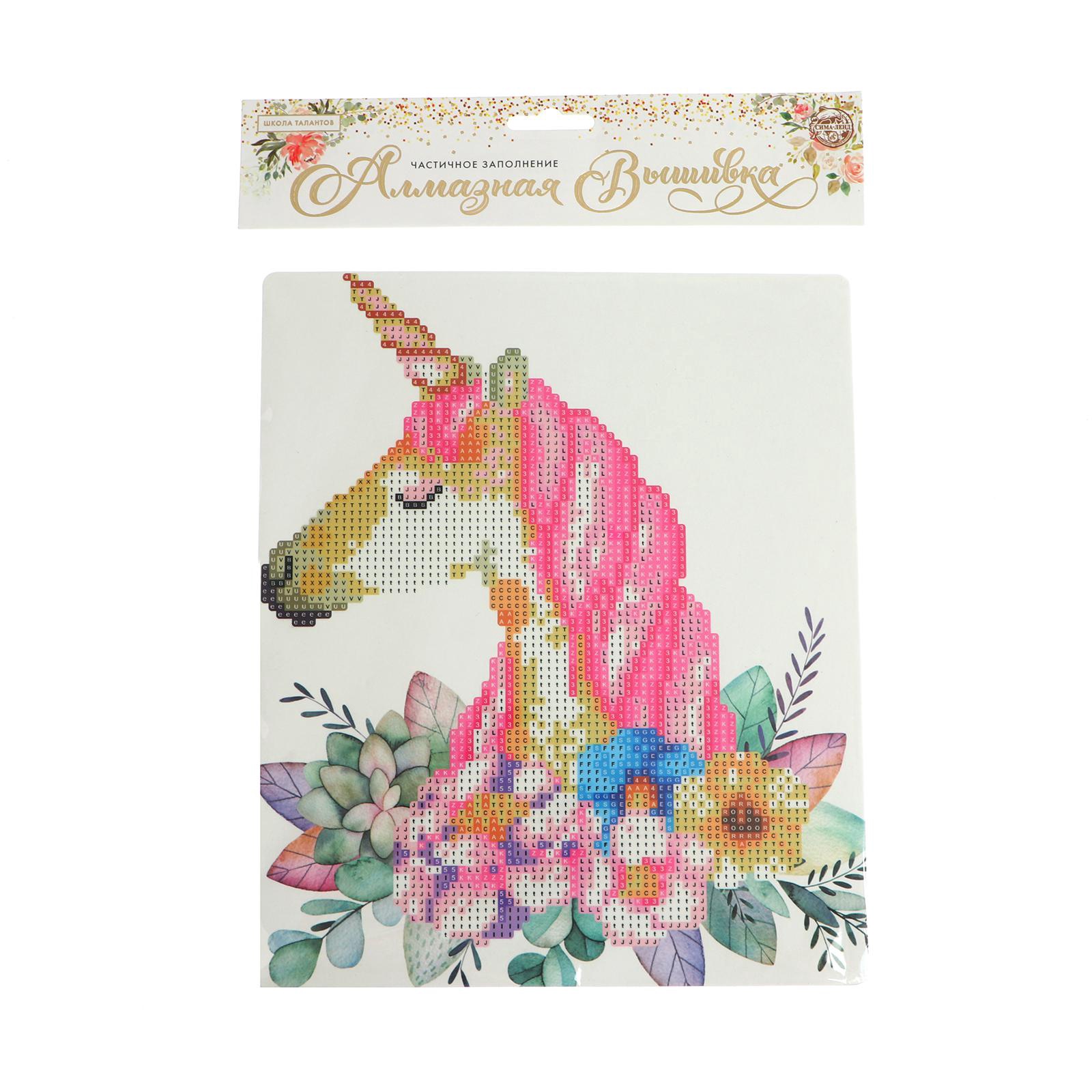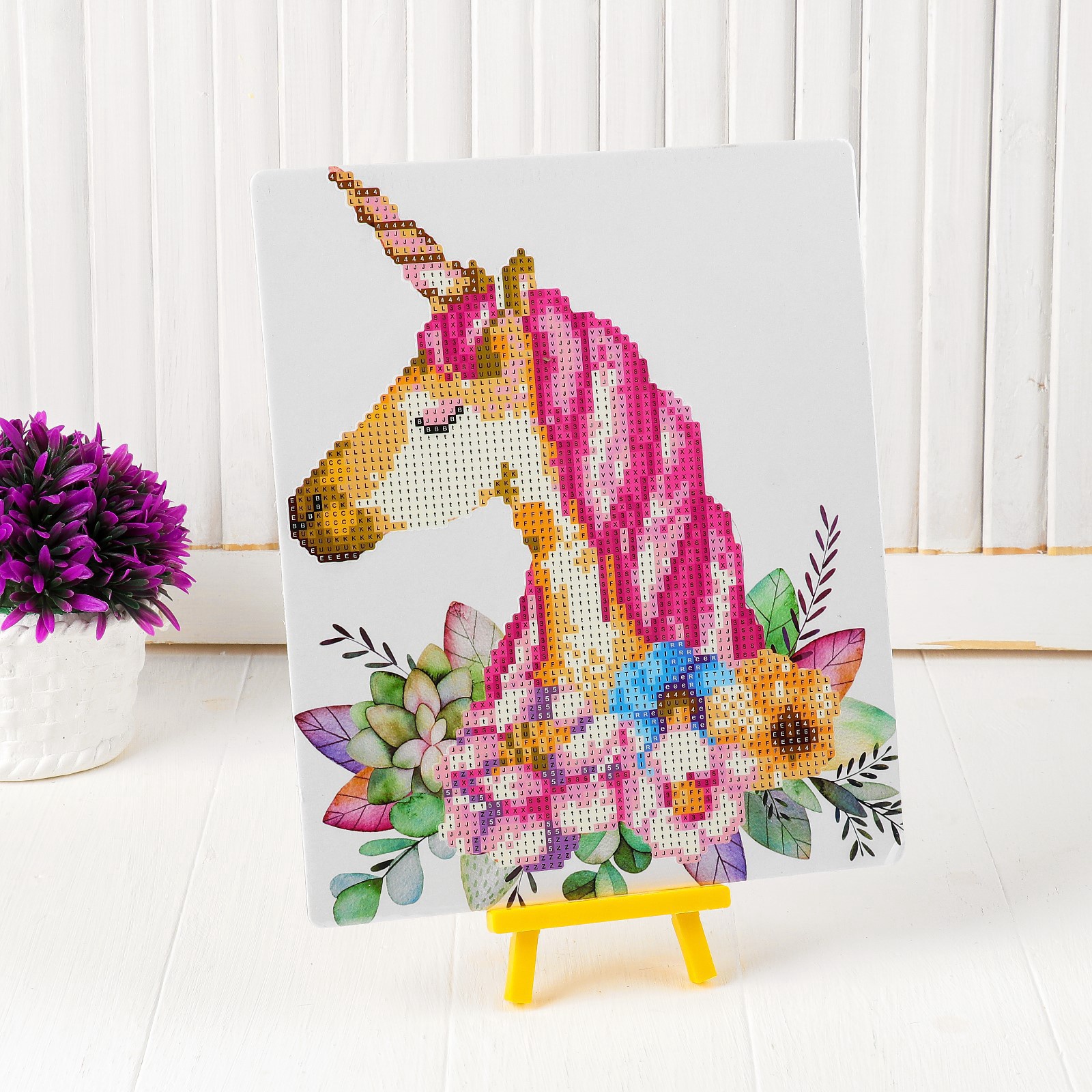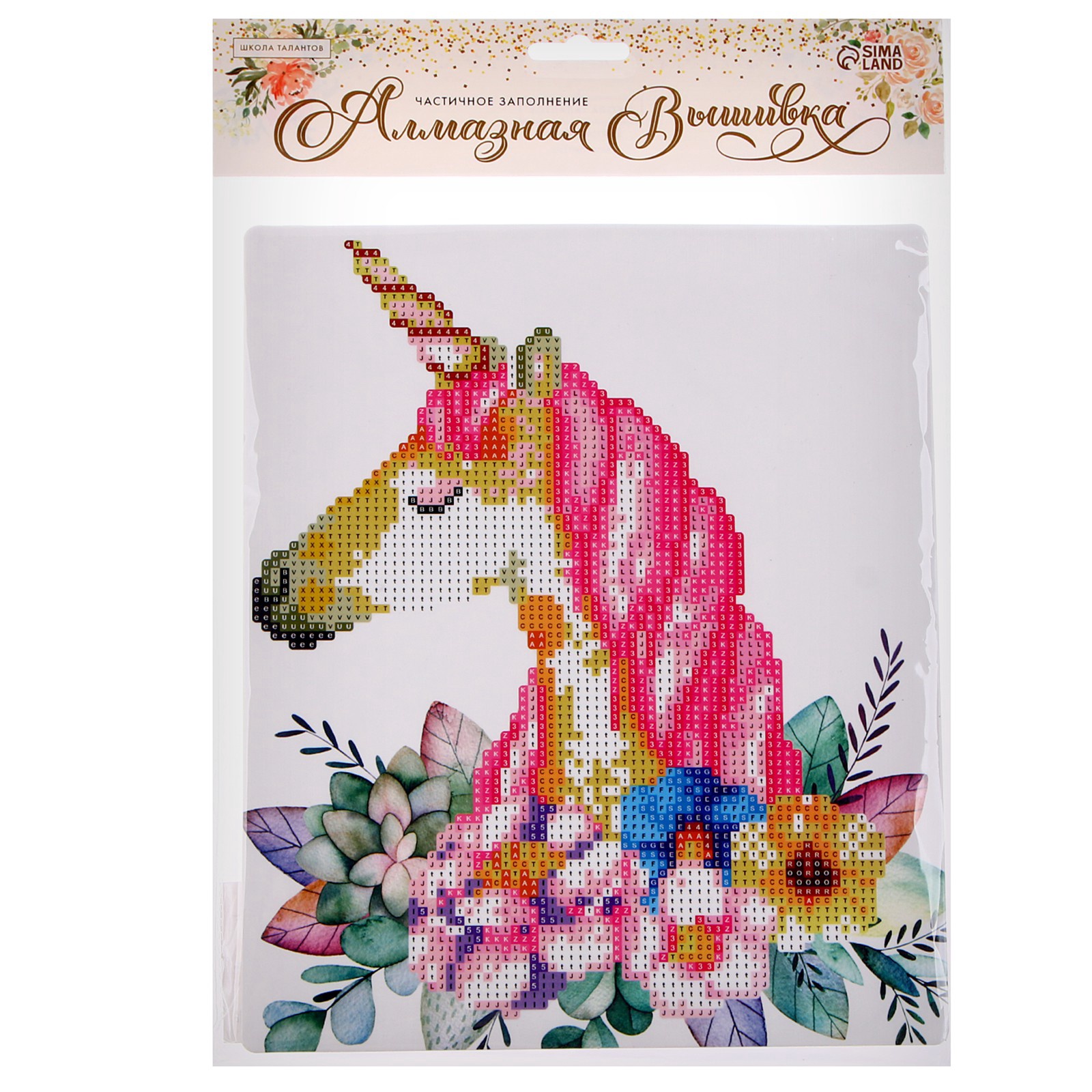 Алмазная вышивка «единорог в цветах», 21 25 см, с частичным заполнением, с подставкой. Этот набор позволит создать настоящий шедевр своими руками! Алмазная вышивка с частичным заполнением подойдёт для тех, кто впервые пробует свои силы в этой технике или любит быстро добиваться результата. Сияющая картина украсит интерьер и станет эффектным подарком для близких. Особенности набора Миниатюрная подставка для комфортной работы.Частичное заполнение картины.Для работы не требуется дополнительная инструкция, ведь вся схема напечатана на основе.В комплекте есть два ziplock-пакетика, в которых удобно хранить стразы.Как выкладывать стразы Чтобы стразы надёжно крепились к основе, используйте клеевую подушечку. Опустите в неё стилус, и инструмент захватит кусочек клея.Старайтесь заполнять участок с одним оттенком, так работать будет комфортнее. Затем переходите к участку другого цвета.Что в комплекте: картонная основа с напечатанным рисунком и схемой,стразы,стилус,клеевая подушечка,пластиковая подставка,лоток для страз,2 ziplock-пакета.Количество цветов:20|Для кого:Для девочки|Размер, см:21 х 25|Ширина, см:21|Высота, см:25|Возраст:От 7 лет|Тематика:Детская|Тематика:Сказочные животные|Тематика праздника:8 Марта|Ориентация изображения:Вертикально|Материал для аппликации:Стразы|Тип выкладки:С частичным заполнением|Форма страз:Круглые|Тип основы:Картон|Страна:Китай  развернуть описание ▼