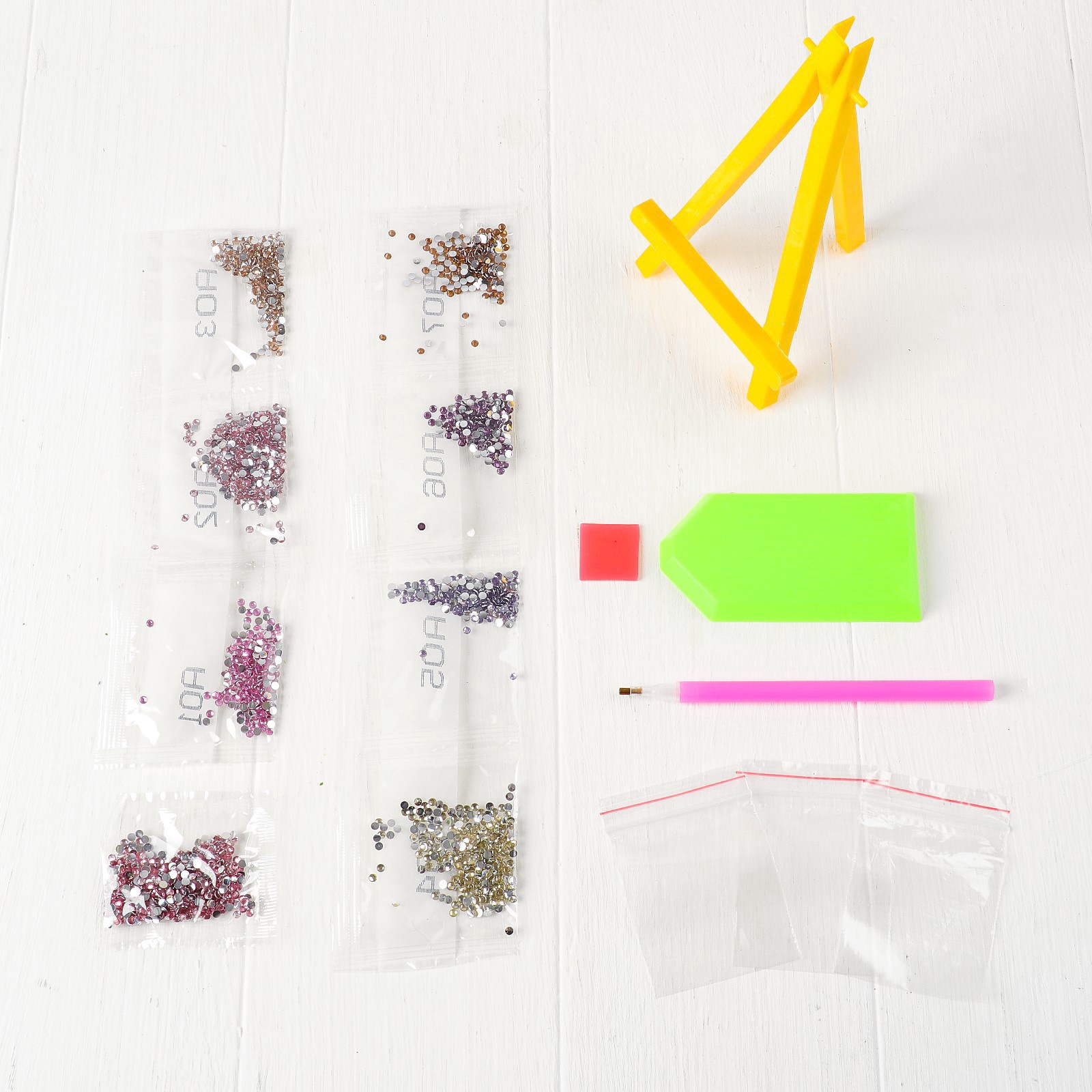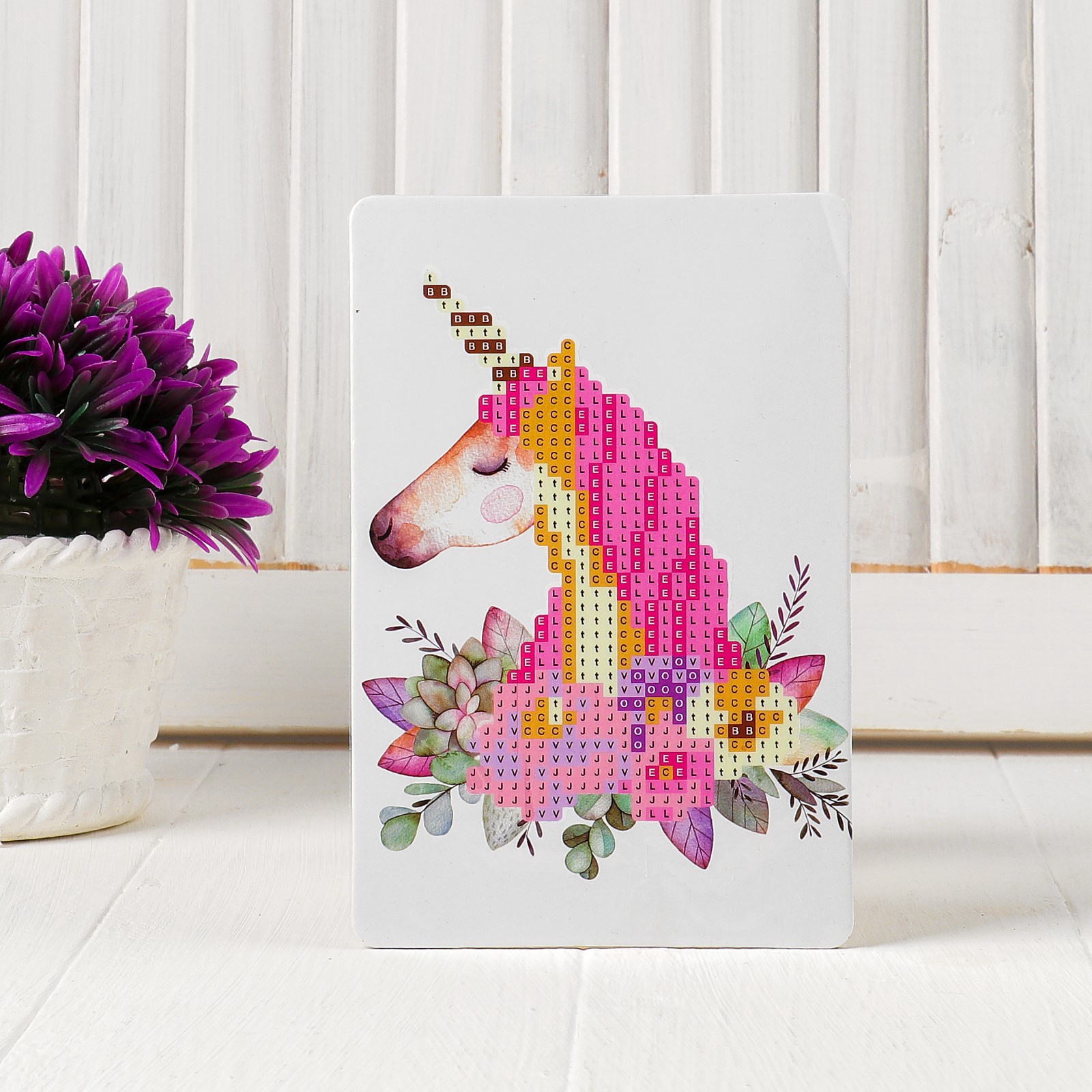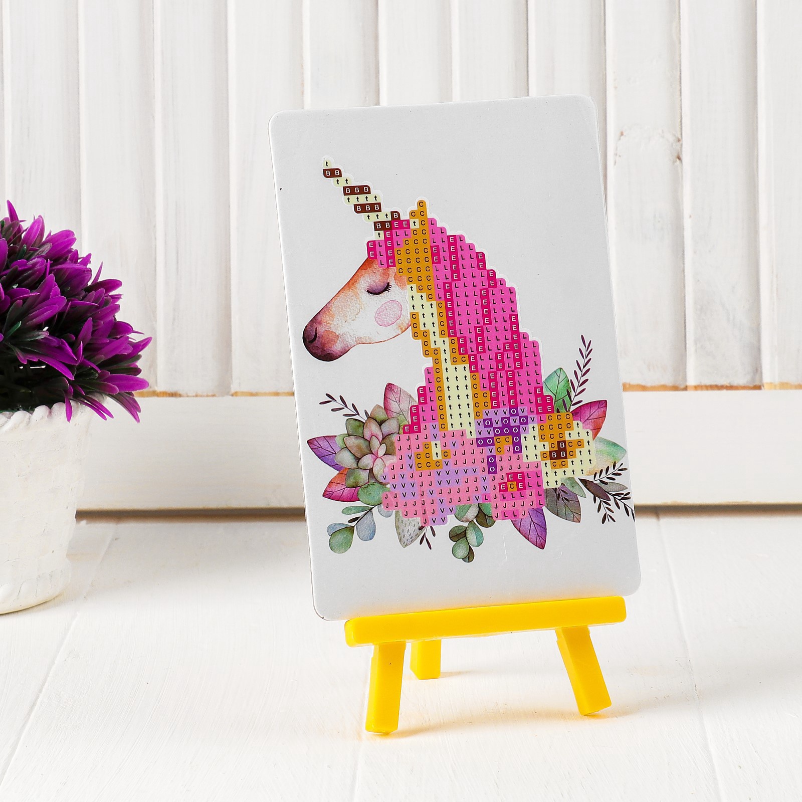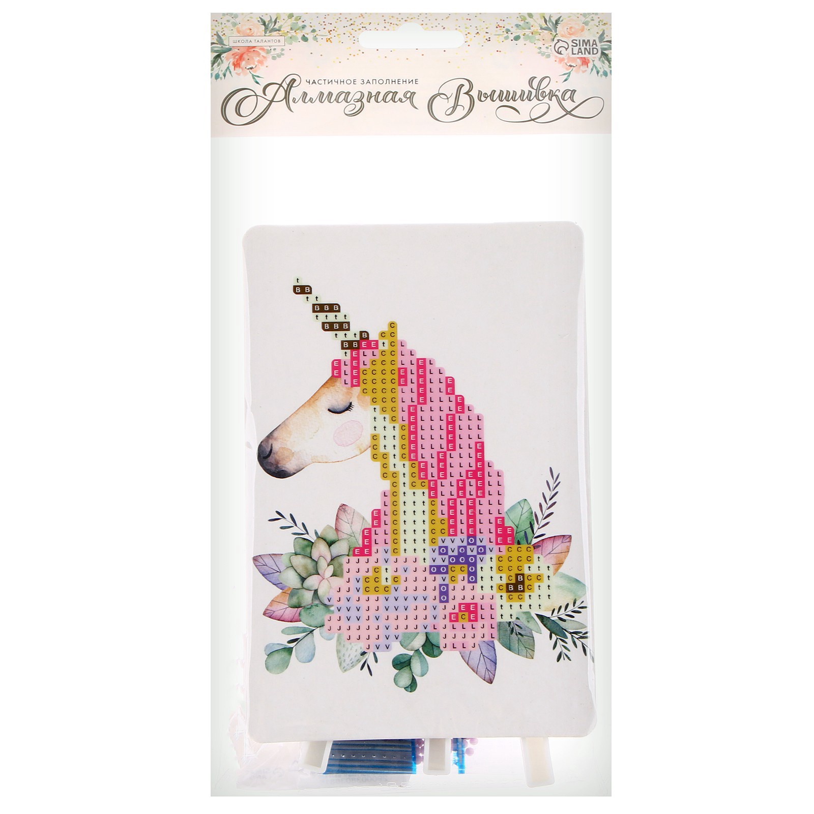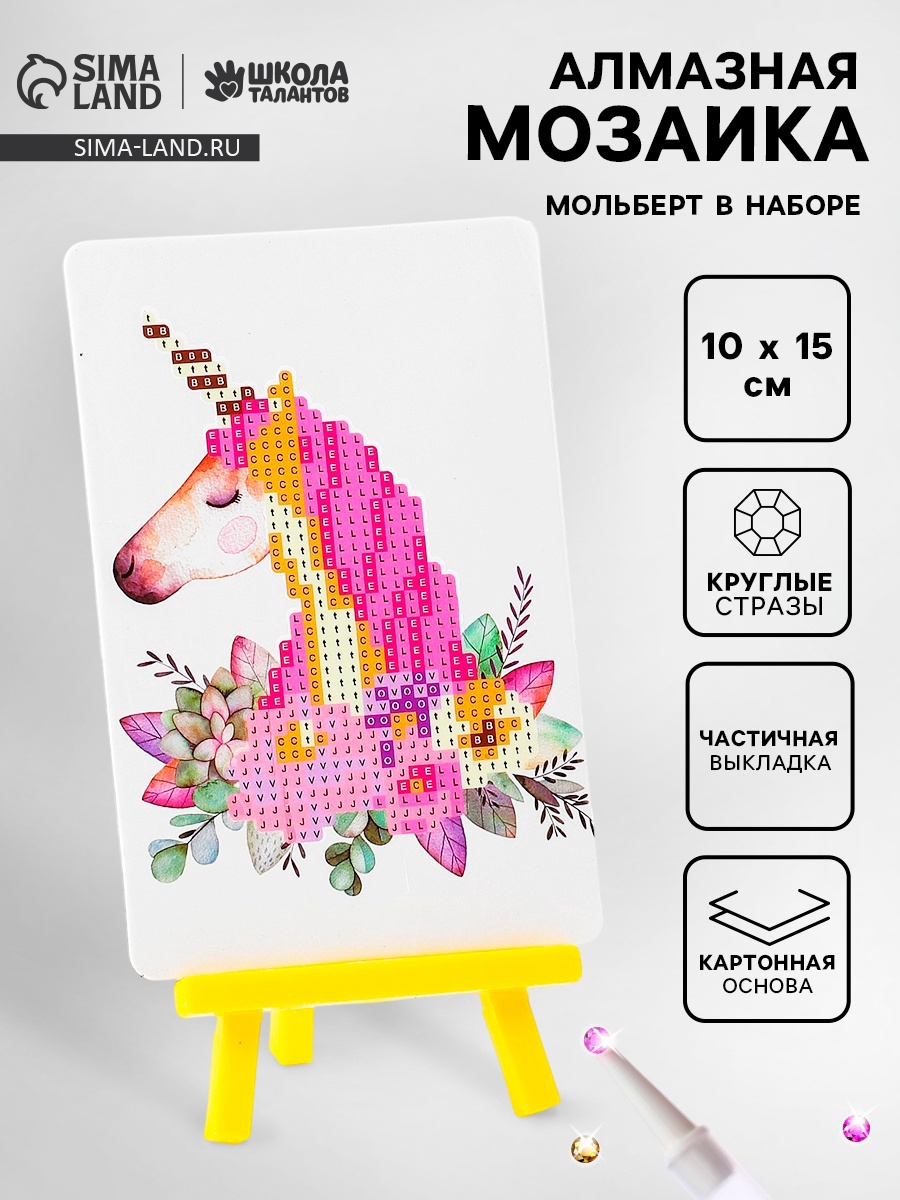 Алмазная вышивка «единорог с цветами», 10 15 см, с подставкой, с частичным заполнением. Набор для алмазной вышивки поможет вам создать милое декоративное изделие своими руками. Алмазная вышивка — увлекательное и расслабляющее занятие, которое не требует специальных навыков. Готовую работу можно разместить на подставке и использовать для украшения дома или офиса. Особенности Набор включает все необходимые материалы: картонный холст со схемой, стразы, карандаш для страз, клеевую подушечку, подставку для картины и ёмкость для страз.Частичное заполнение: только часть картины требует выкладки стразами — это ускоряет процесс создания и подходит для начинающих.Яркие и блестящие стразы круглой формы добавляют картине выразительности и объёма.Количество цветов:8|Для кого:Для девочки|Размер, см:10 х 15|Ширина, см:10|Высота, см:15|Возраст:От 3 лет|Тематика:Детская|Тематика:Сказочные животные|Тематика праздника:8 Марта|Ориентация изображения:Вертикально|Материал для аппликации:Стразы|Тип выкладки:С частичным заполнением|Форма страз:Круглые|Тип основы:Картон|Страна:Китай  развернуть описание ▼