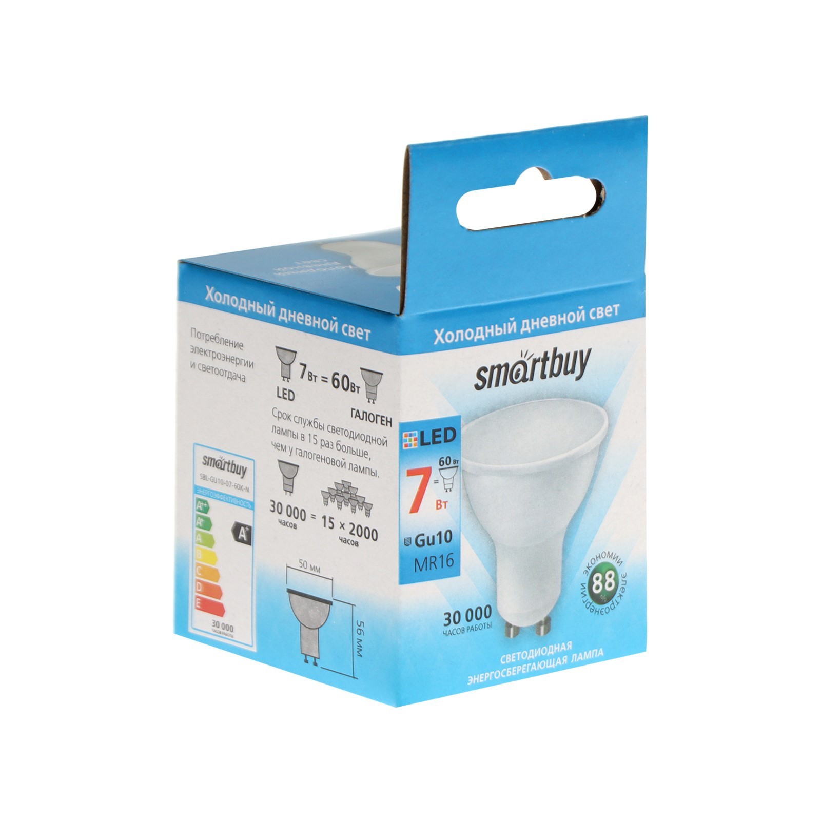 Лампа светодиодная smartbuy, mr16, 7 вт, gu10, 6000 к, холодный белый. Цвет свечения: Холодный белый Вид лампы: Светодиодная Цоколь: GU10 Мощность, Вт: 7 Гарантийный срок, мес.: 24 Напряжение, В: 220 Световой поток, лм: 560 Цветовая температура: 6000К Форма лампы: Софитная Индекс цветопередачи: RA > 80 Диммируемая: Нет Класс энергоэффективности: A+  развернуть описание ▼