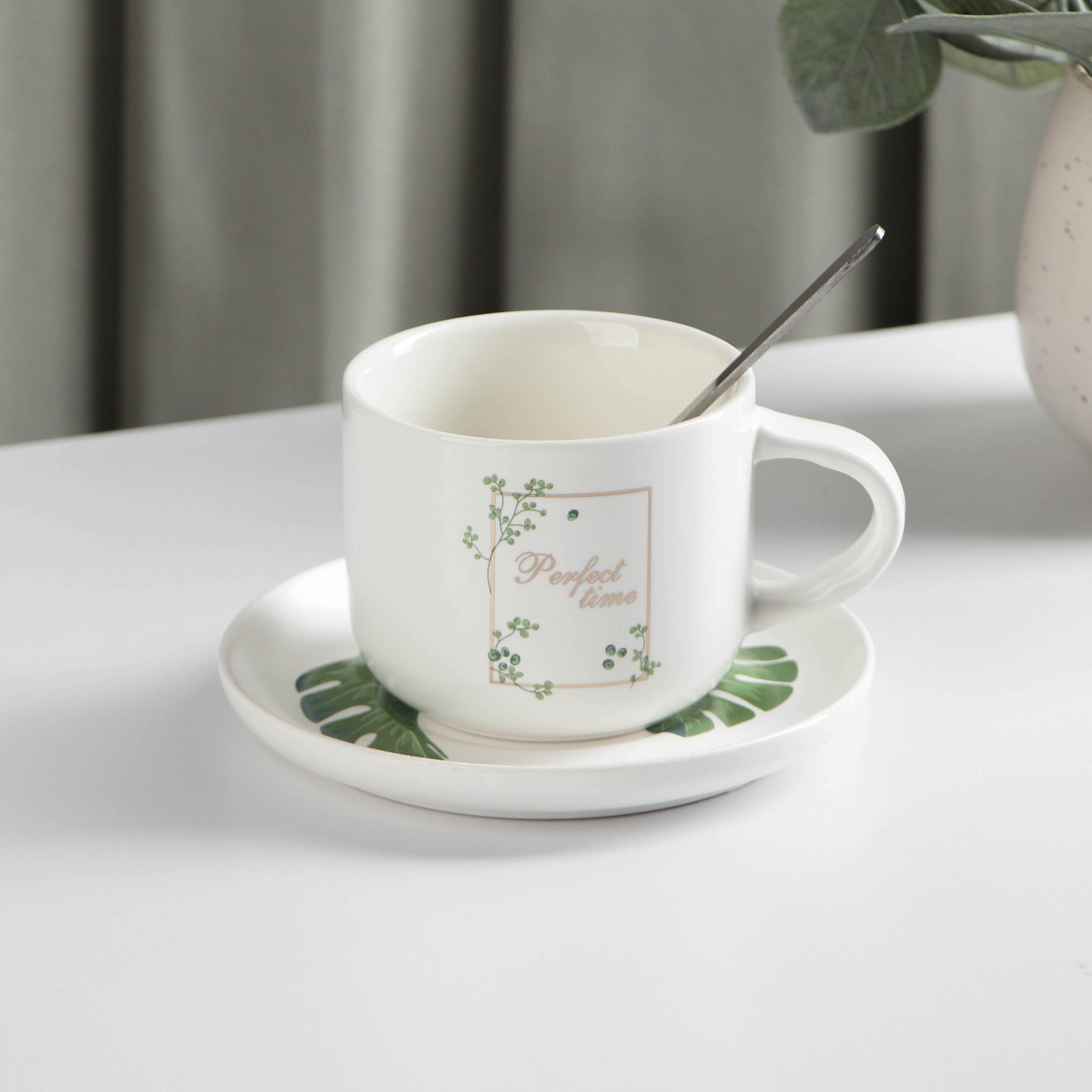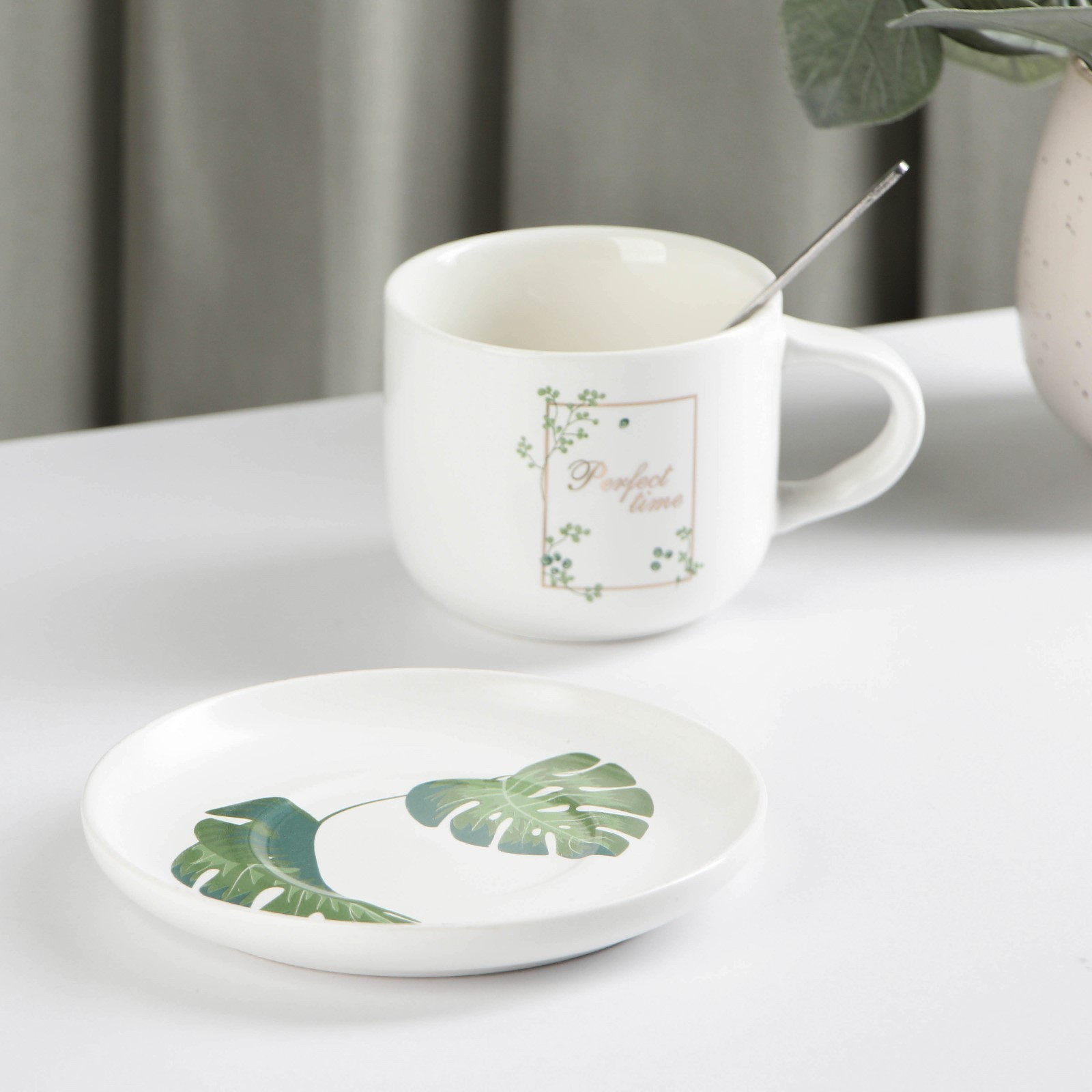 Набор керамический чайный с ложкой «ботаника», 2 предмета: чашка 200 мл, блюдце, цвет микс