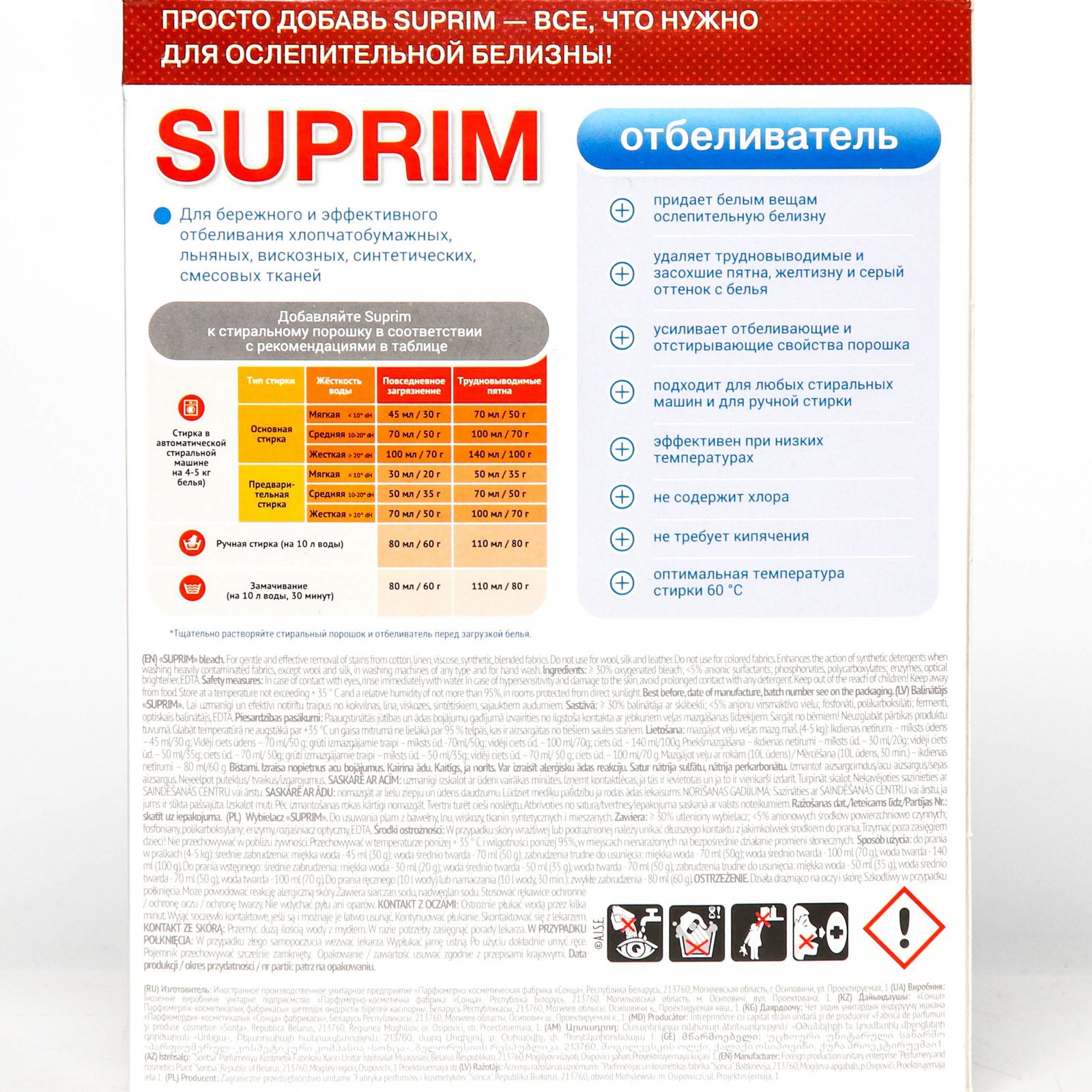 Отбеливатель suprim, 500 г. Отбеливатель предназначен для усиления действия средств моющих синтетических при стирке сильнозагрязненных изделий из различных тканей, кроме шерсти и шелка. Средство бережно отбеливает, сохраняя структуру тканей. Бережно удаляет самые трудновыводимые пятна. Усиливает действие стирального порошка. Способ применения: добавить в отделение стиральной машины 30 г. на 4-5 кг белья. Добавить в воду 60 г на 10 л воды при замачивании или при ручной стирке. Вес, г/Объём, мл: 500 Форма выпуска: Порошок : 0  развернуть описание ▼
