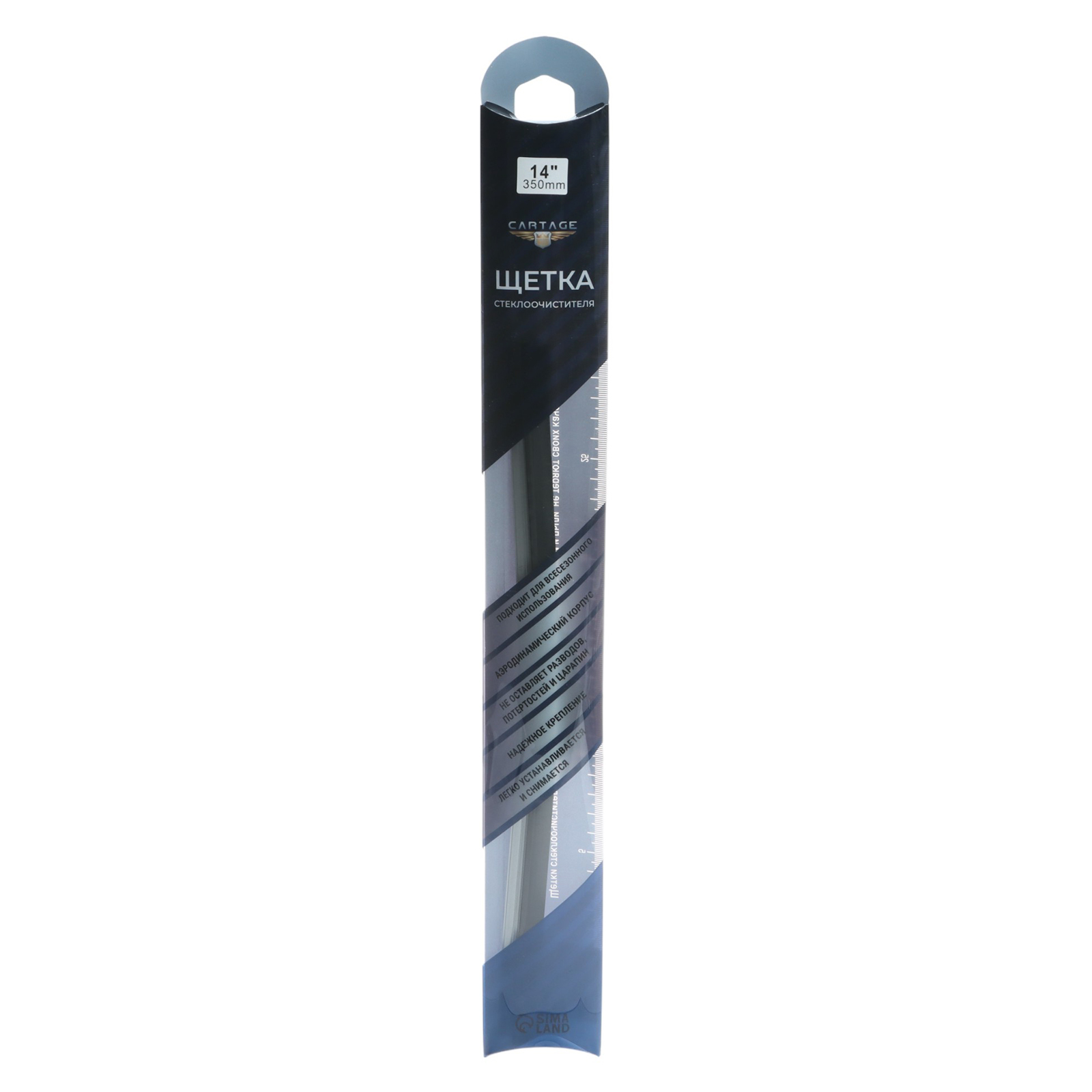 Щётка стеклоочистителя cartage 14/350 мм, бескаркасная. Всесезонные бескаркасные щётки стеклоочистителя – это щётки нового поколения, изготавливаются с использованием новейших технологий и отвечают современным зарубежным стандартам качества. Аэродинамическая бескаркасная конструкция щёток обеспечивает идеальное прилегание лезвия стеклоочистителя к стеклу. Применение высокотехнологичных современных материалов при производстве обеспечивает возможность длительной эксплуатации этих дворников для автомобиля без потери качества очистки. Набор:Нет|Длина, см:35|В наборе, шт.:1|Вид:Бескаркасные|Тип крепления:Крючок/Hook|Страна:Китай  развернуть описание ▼