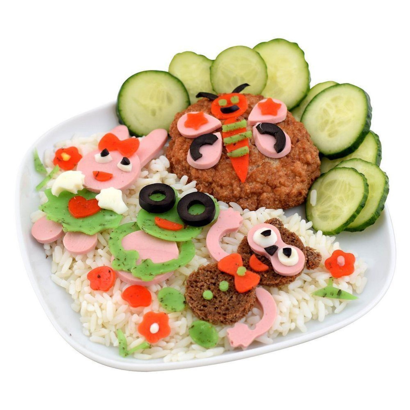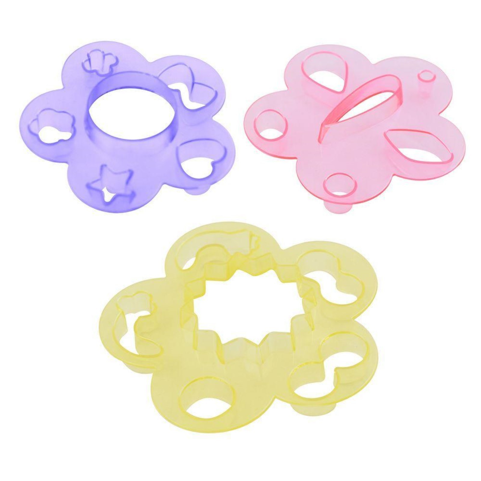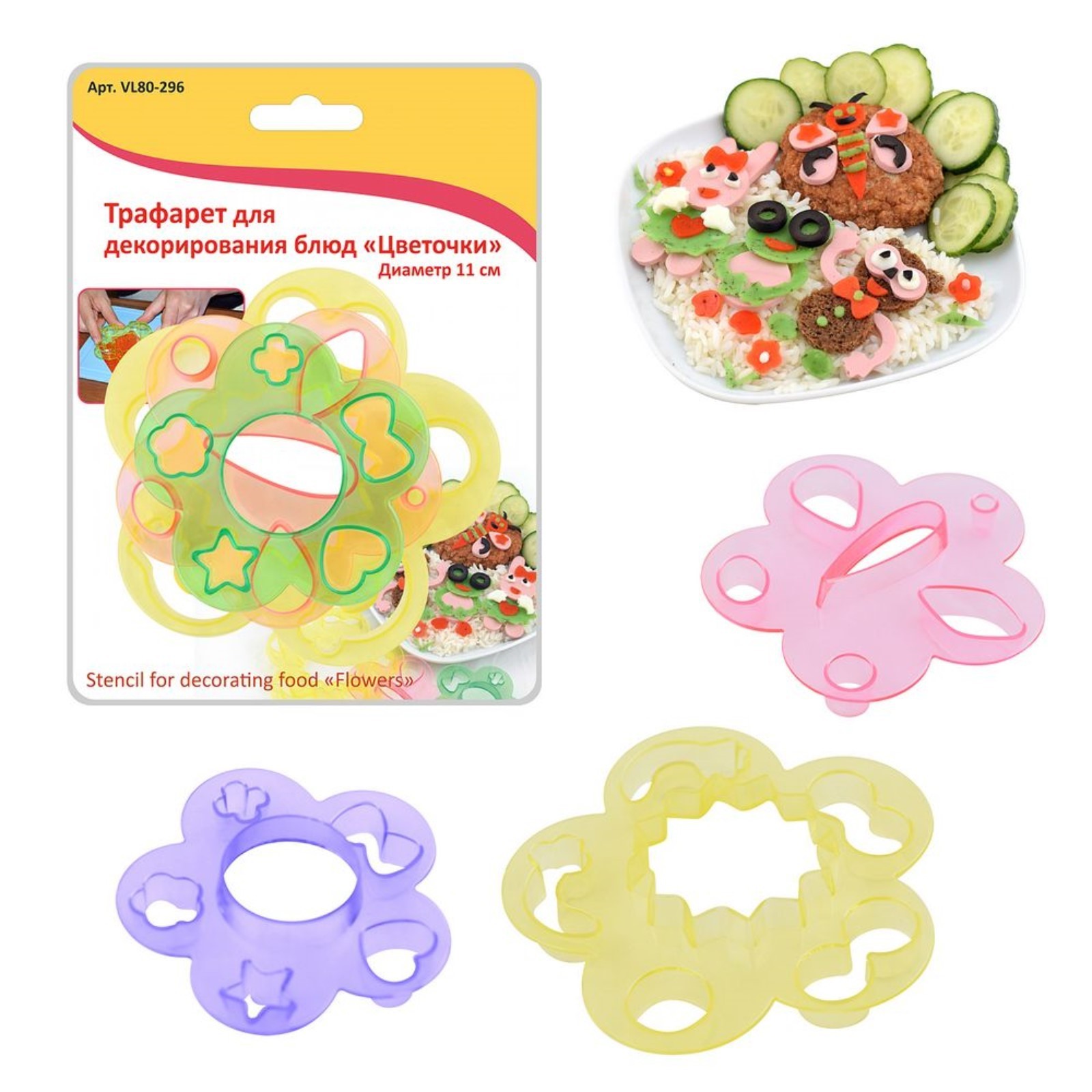 Трафарет для декорирования блюд "цветочки". Трафарет предназначен для украшения блюд. С помощью него вы сможете украсить любое блюдо, придав ему индивидуальности. Можете вырезать фигурки из сыра, колбасы, овощей и украшать ими детские блюда или бутерброды. Это повысит интерес и аппетит у детей, которых порой очень сложно накормить. С помощью этого трафарета для декорирования Вы сможете украсить праздничный стол и удивить своих гостей оригинальностью замысла. Также трафарет подойдет для вырезания идеально ровных фигурок из мастики, марципана, теста и украшения ими выпечки. Привлекайте к украшению детей – превращайте этот процесс в настоящее творчество! После использования промойте в проточной воде, можно с использованием жидких моющих средств. Изготовлено из пластмассы (полистирол). Форма: Фигурная В наборе, шт.: 3 Материал: Пластик Можно мыть в посудомоечной машине: Нет Форма: Фигурная  развернуть описание ▼